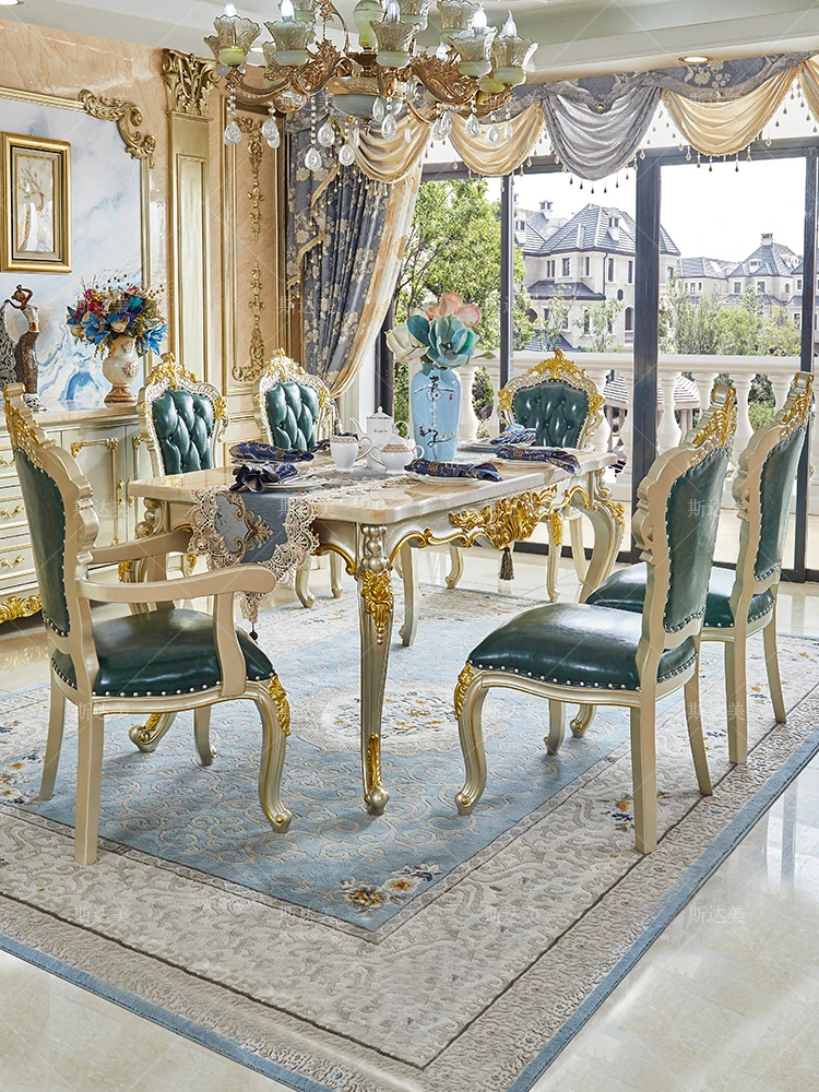 Luxurious European Style Solid Wood Square Dining Table Set with Champagne Gold Marble Long Table and Chairs - Perfect for Elegant Dining Rooms