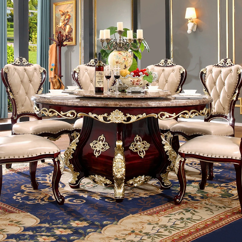 Luxury European Style Marble Round Dining Table Set with Solid Wood Chairs - Mahogany Finish, Perfect for Villas and Elegant Dining Rooms