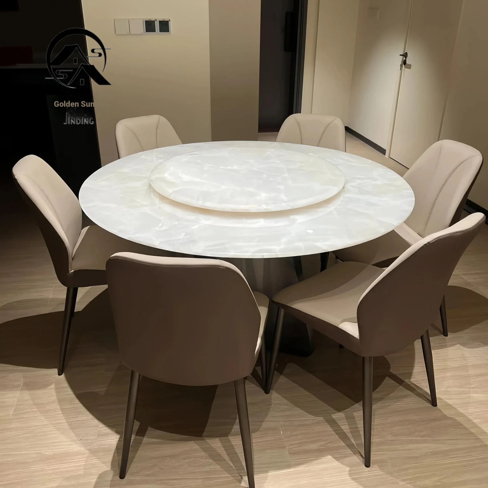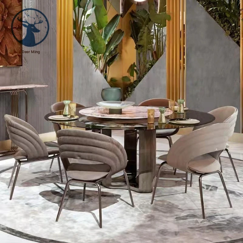 Italian Luxe Natural Marble White Crystal Round Dining Table with Rotating Tray - Premium Villa Restaurant Furniture Set with Chairs