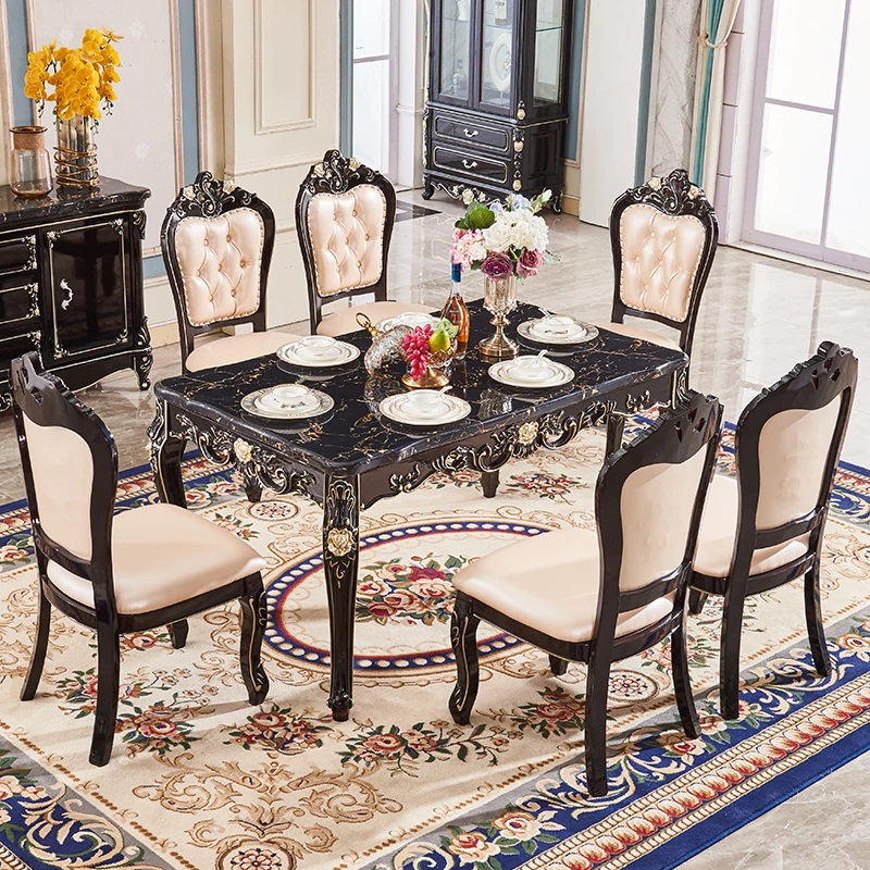 Elegant European-Style Solid Wood Dining Table and Chair Set with Marble Top - Rectangular Oak Dining Table for Home Use in Rich Black Walnut Finish