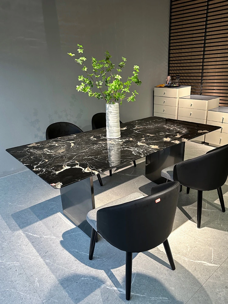 New European Style Stainless Steel Marble Dining Table - Ideal for Sample Rooms, Meeting Rooms, and Small Spaces. Sleek Metal Design Perfect for Office Use and Modern Interiors.