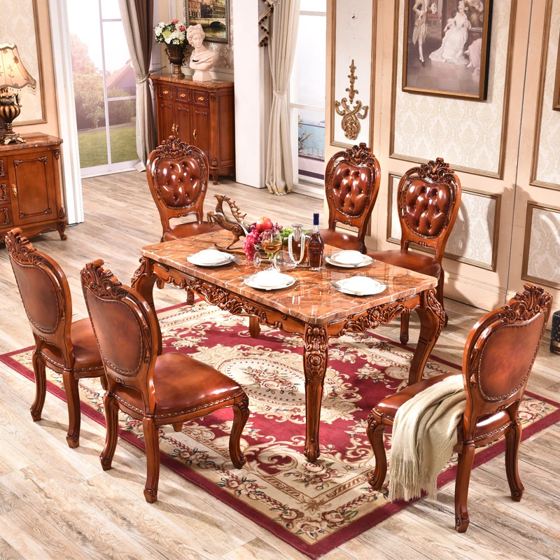 Luxury European Style Solid Wood Carved Natural Marble Dining Table Set - Rectangular 1.3m & 1.5m with Six Chairs, Perfect for Elegant Dining Experiences
