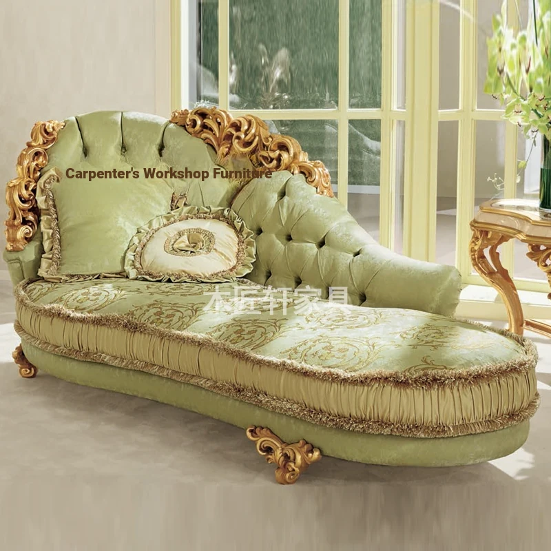 European-style New Classical Fabric Upholstered Button Tufted Chaise Lounge - French Palace Solid Wood Carved Bedroom Recliner, Elegant and Luxurious Daybed Chair