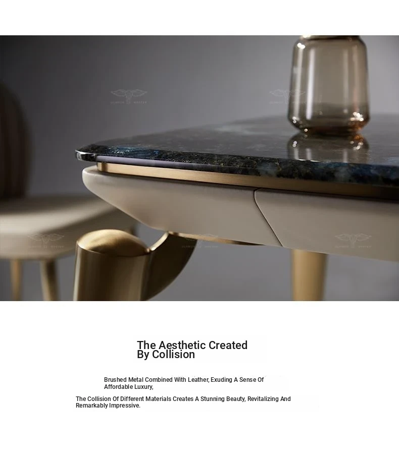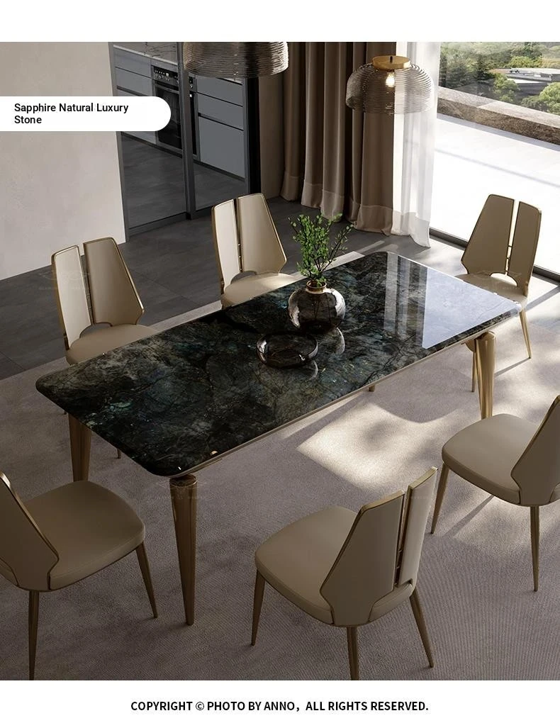 Dining table/70.87in + H5196.85 inicrofiber leather dining chair * 6/Sapphire natural luxury stone/champagne gold