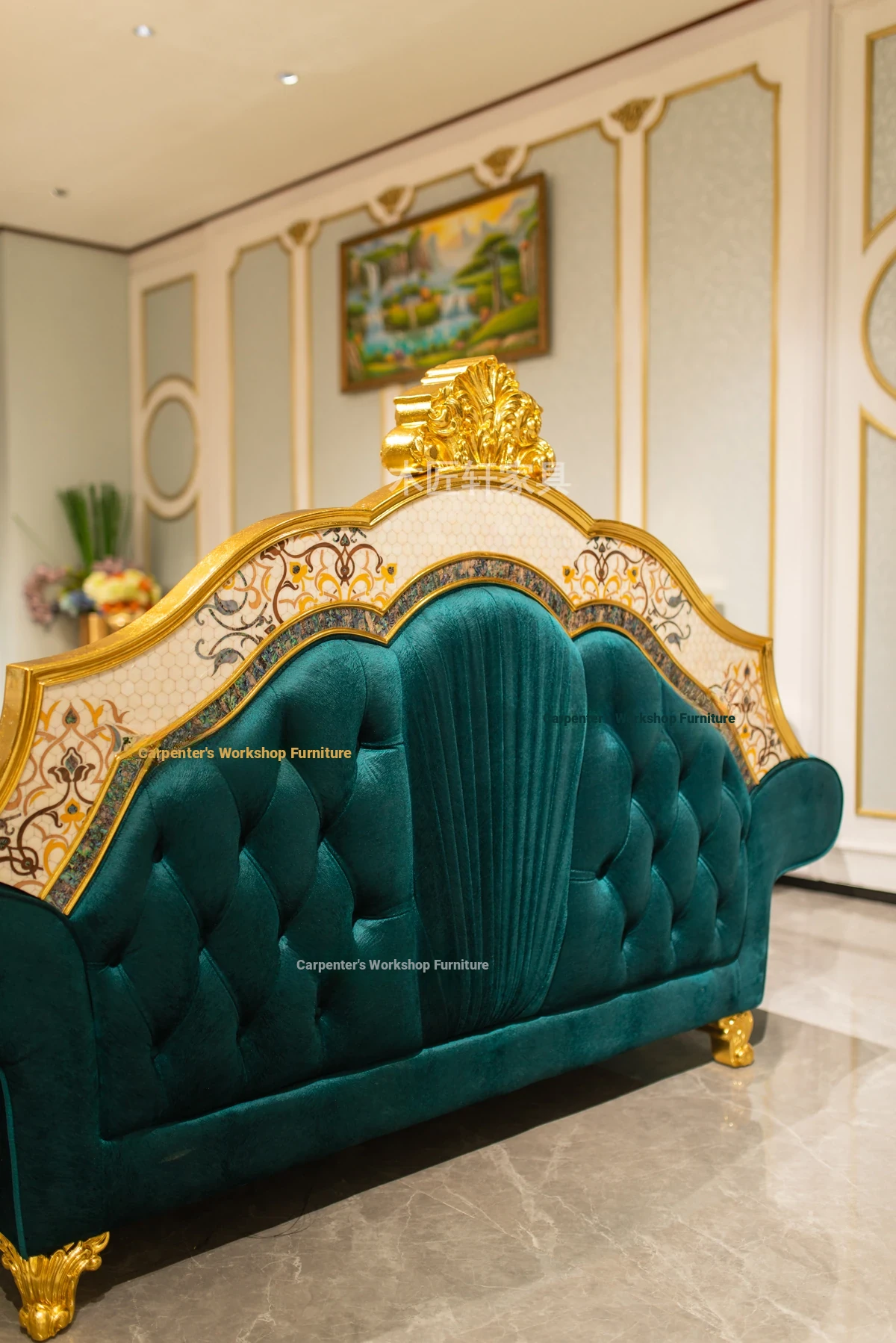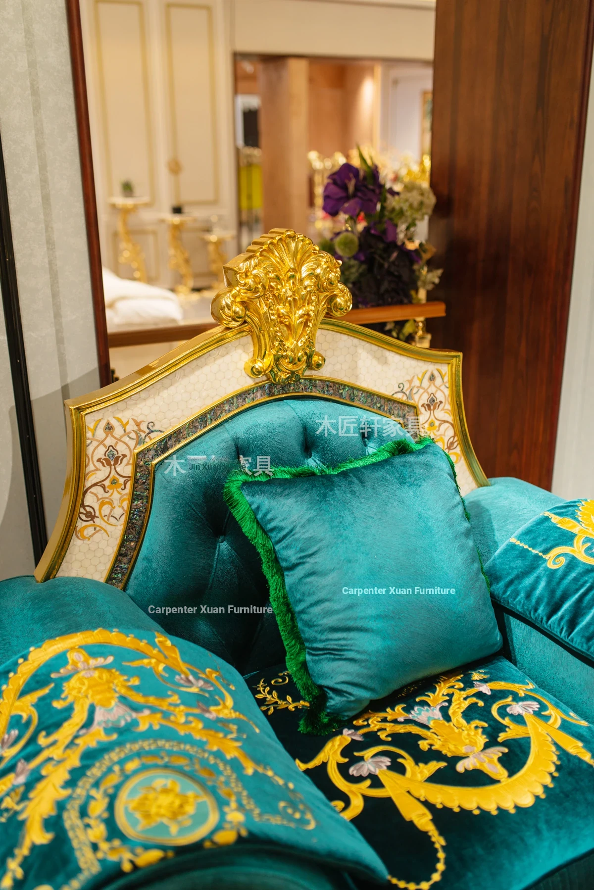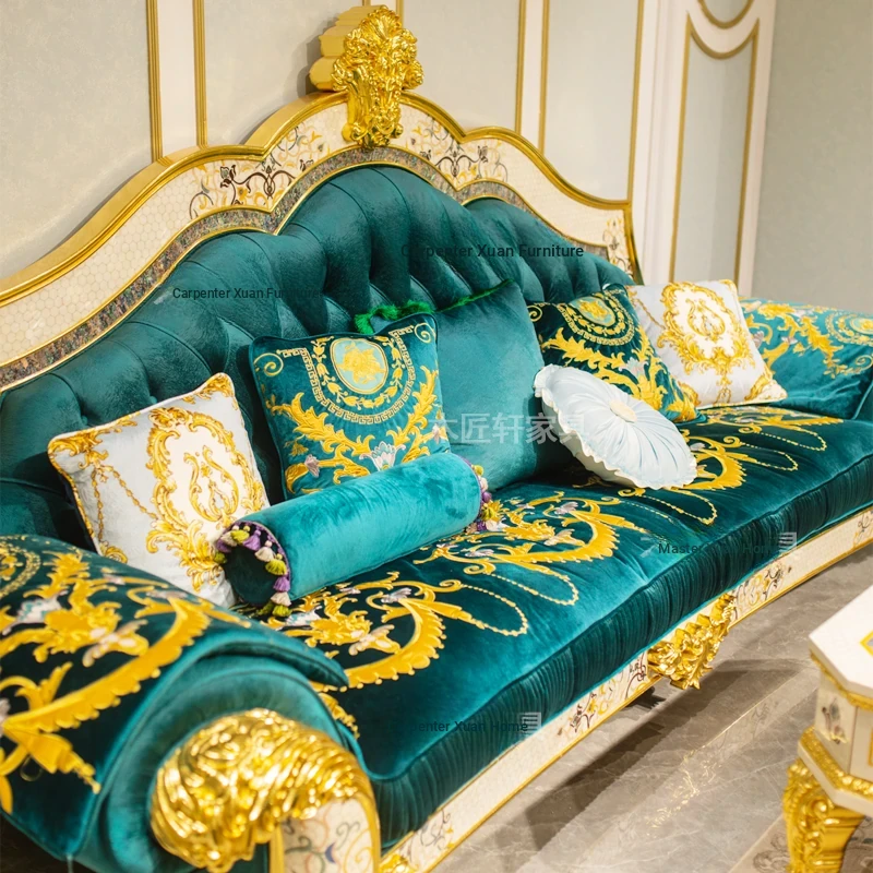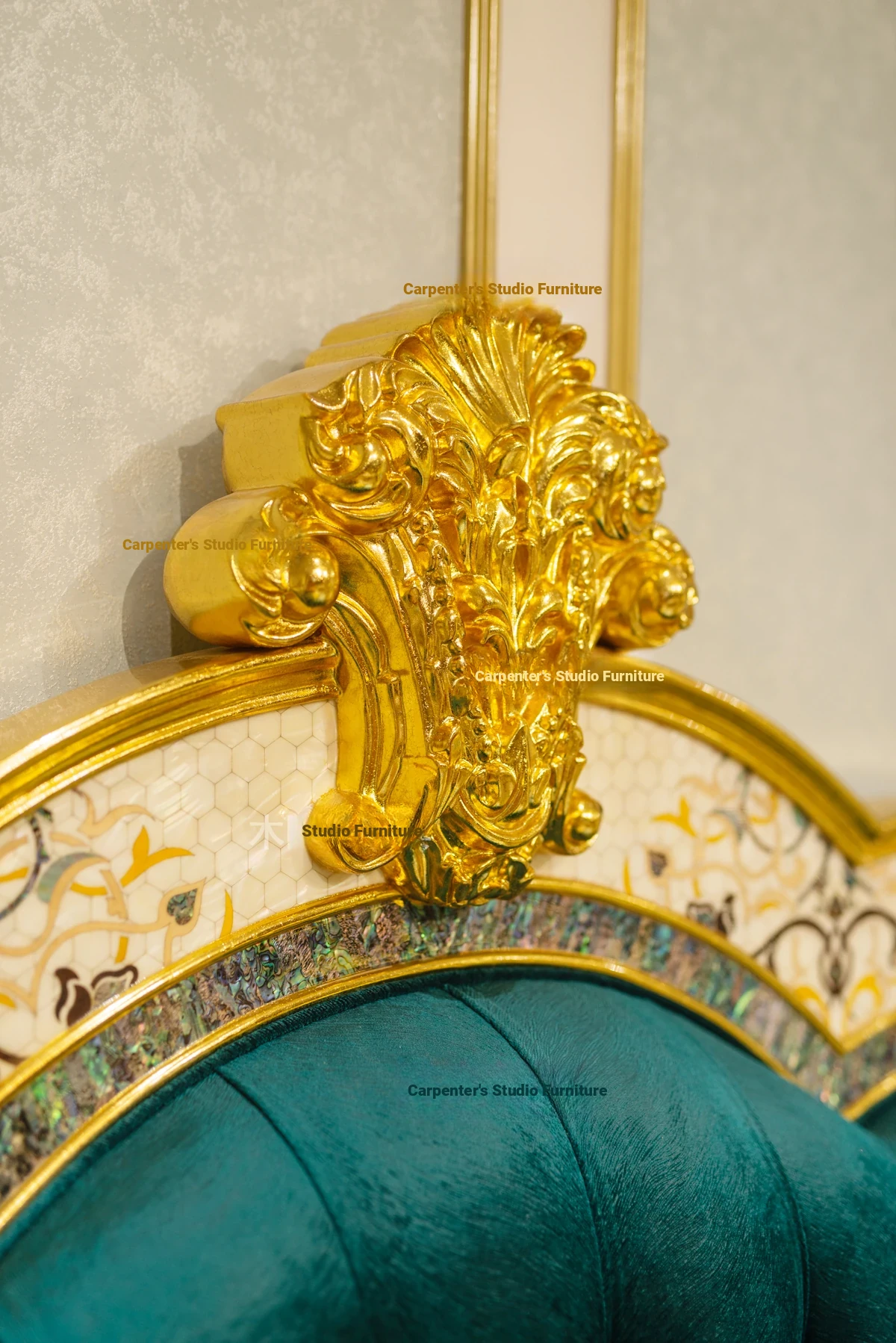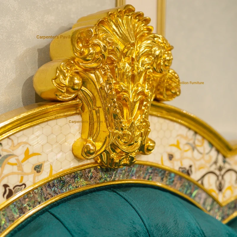 French Court Shell Mosaic Sofa - Luxurious European Solid Wood Furniture with Vintage Style for High-End Villas, Featuring Elegant Gold Foil Upholstery.