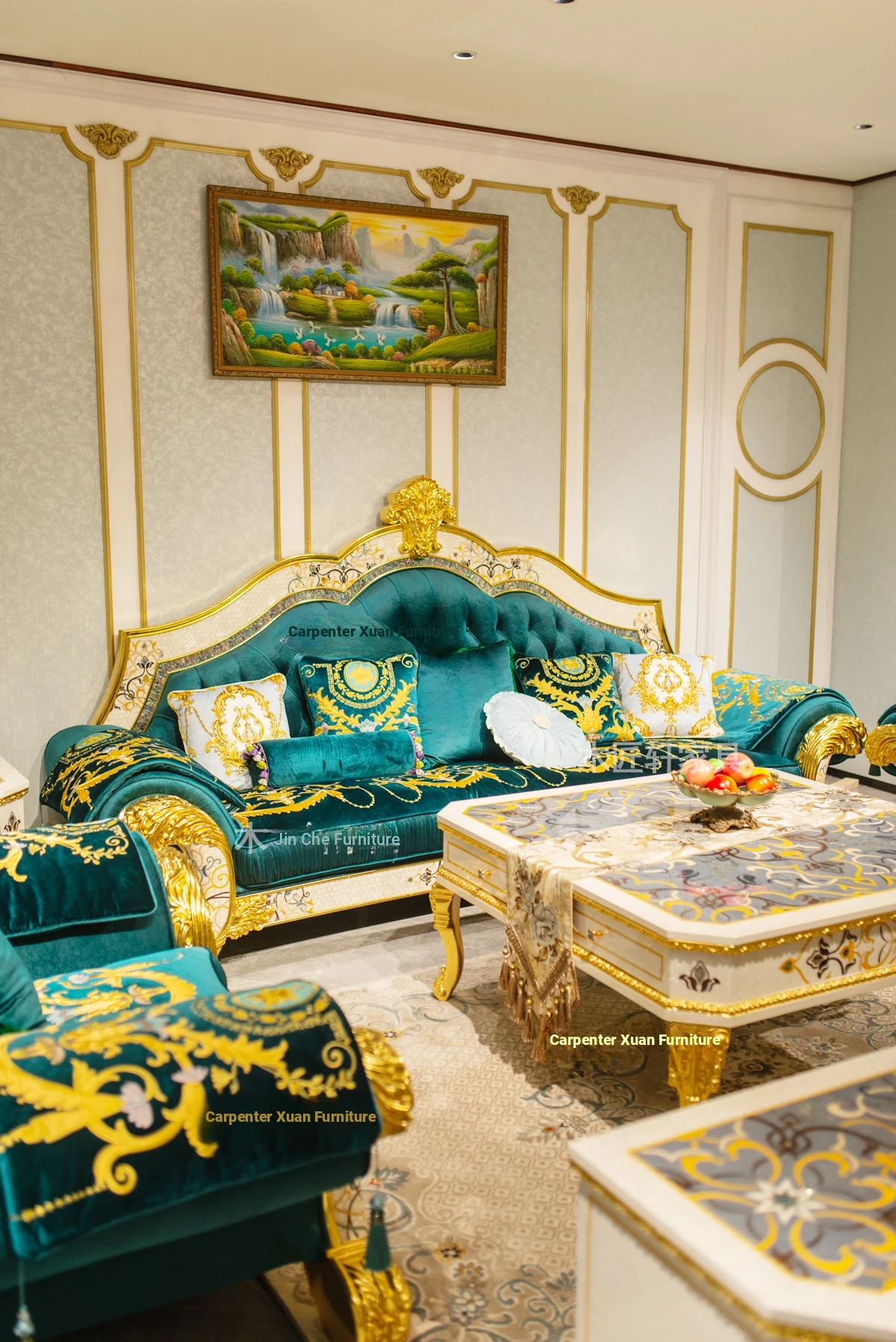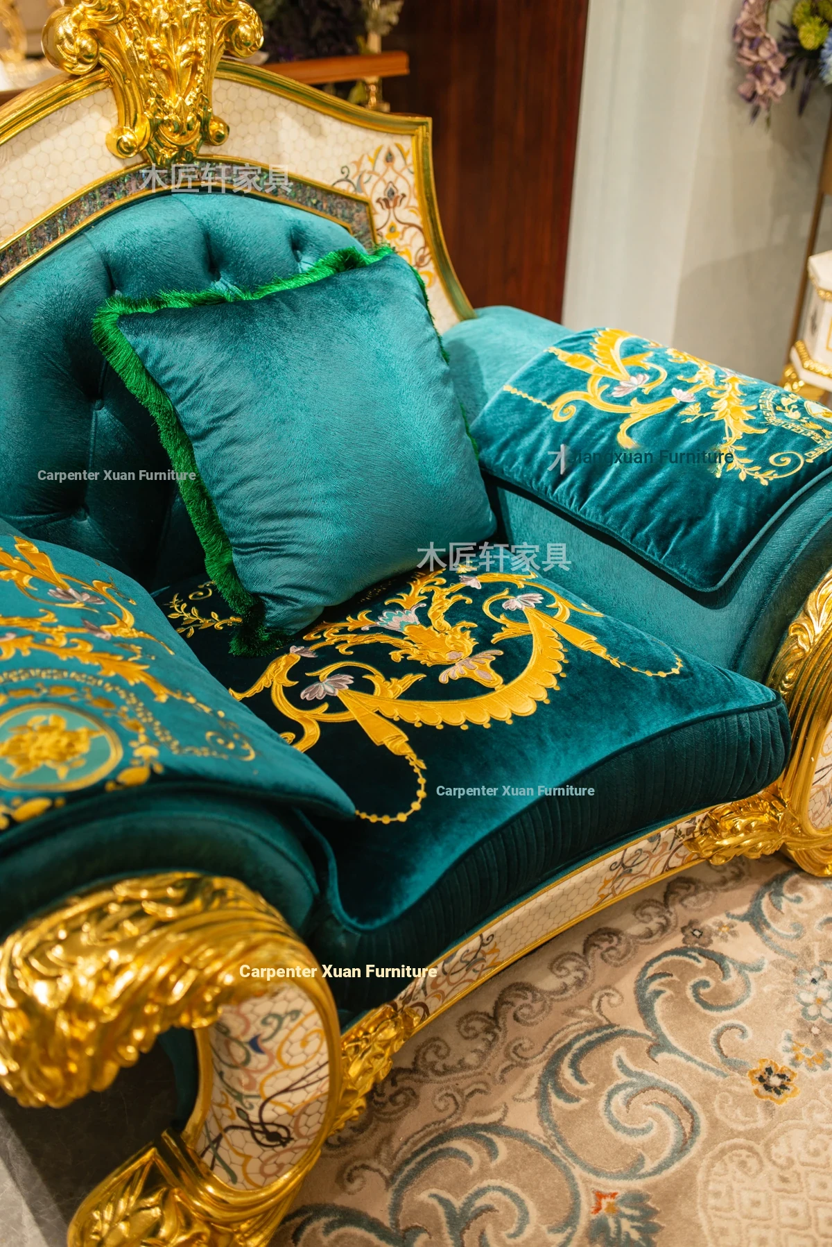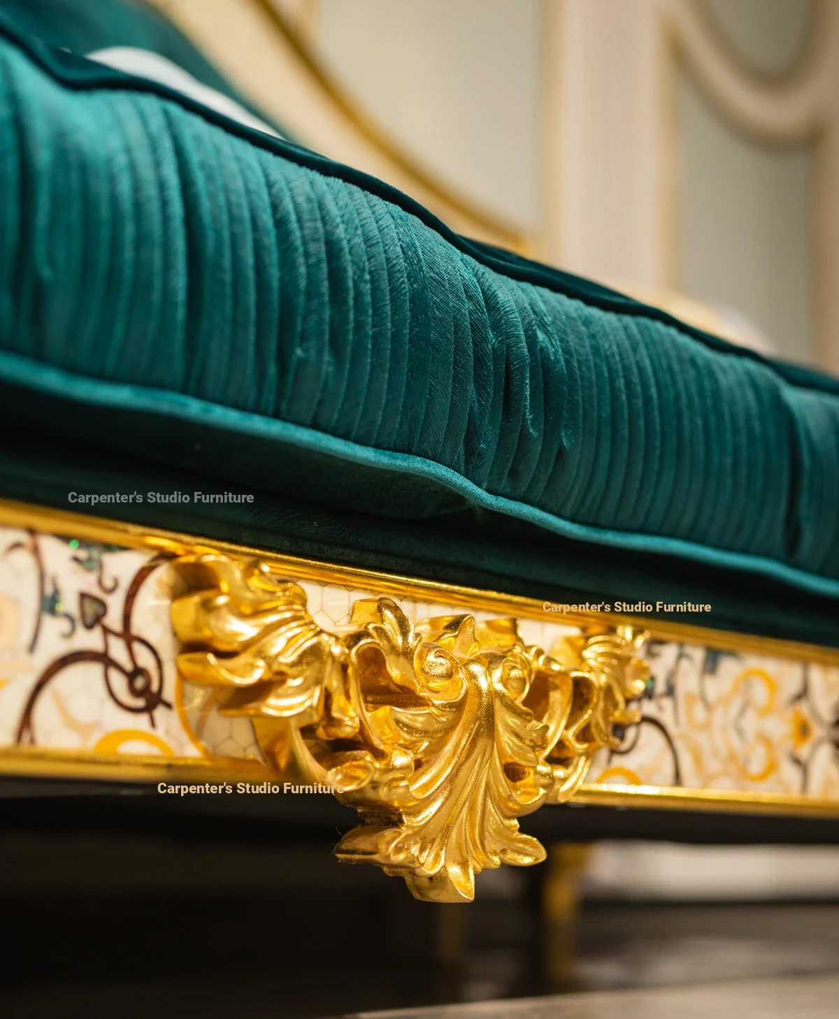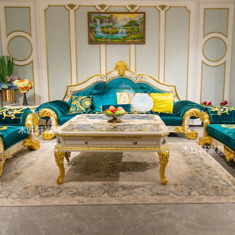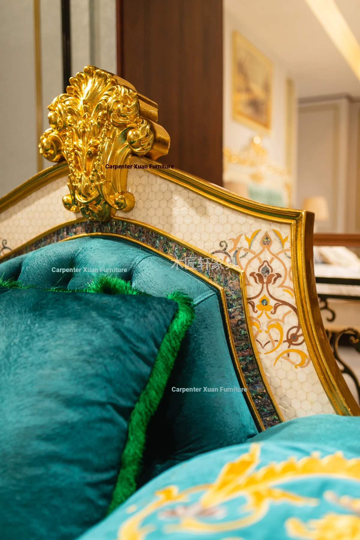 French Court Shell Mosaic Sofa - Luxurious European Solid Wood Furniture with Vintage Style for High-End Villas, Featuring Elegant Gold Foil Upholstery.