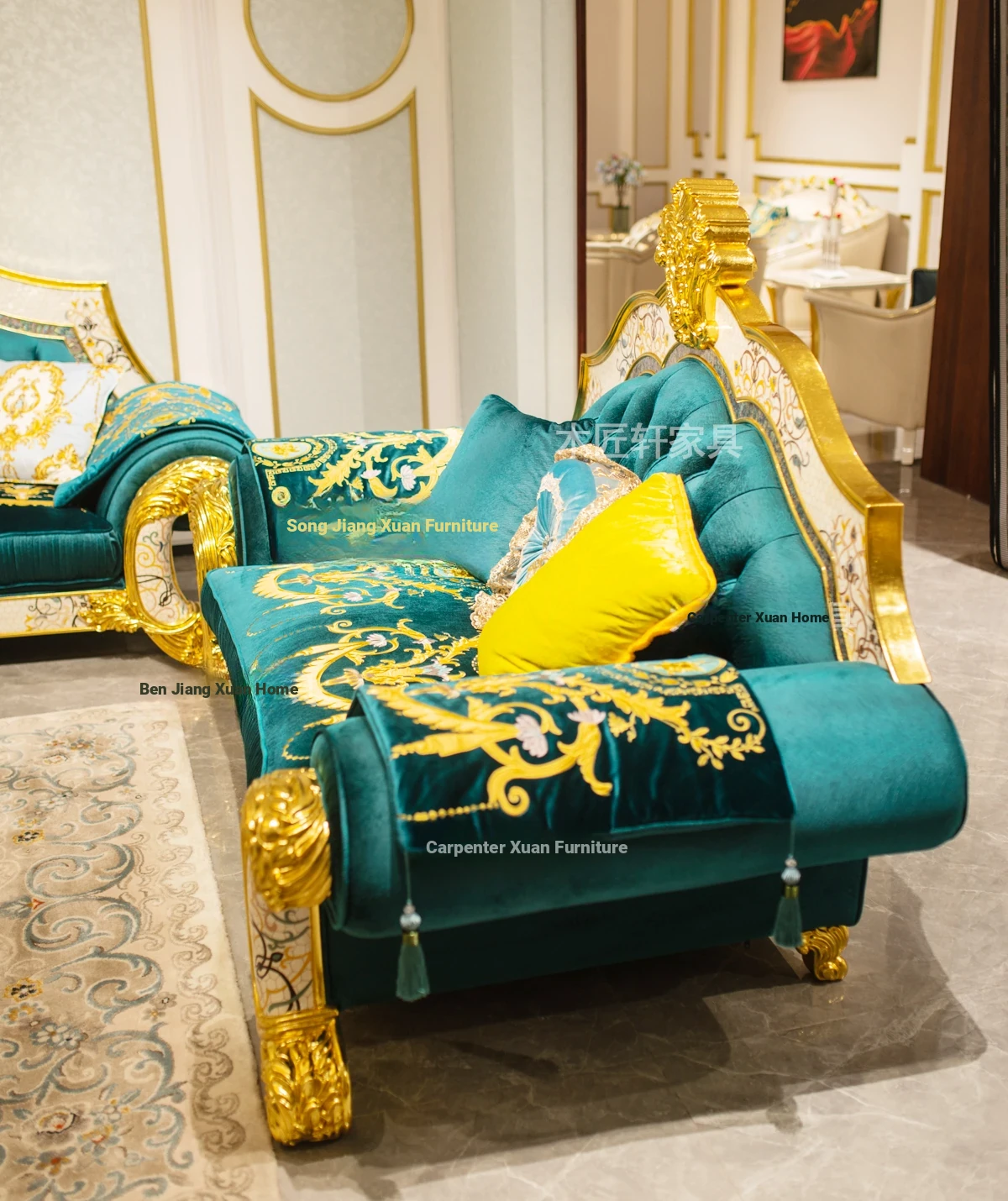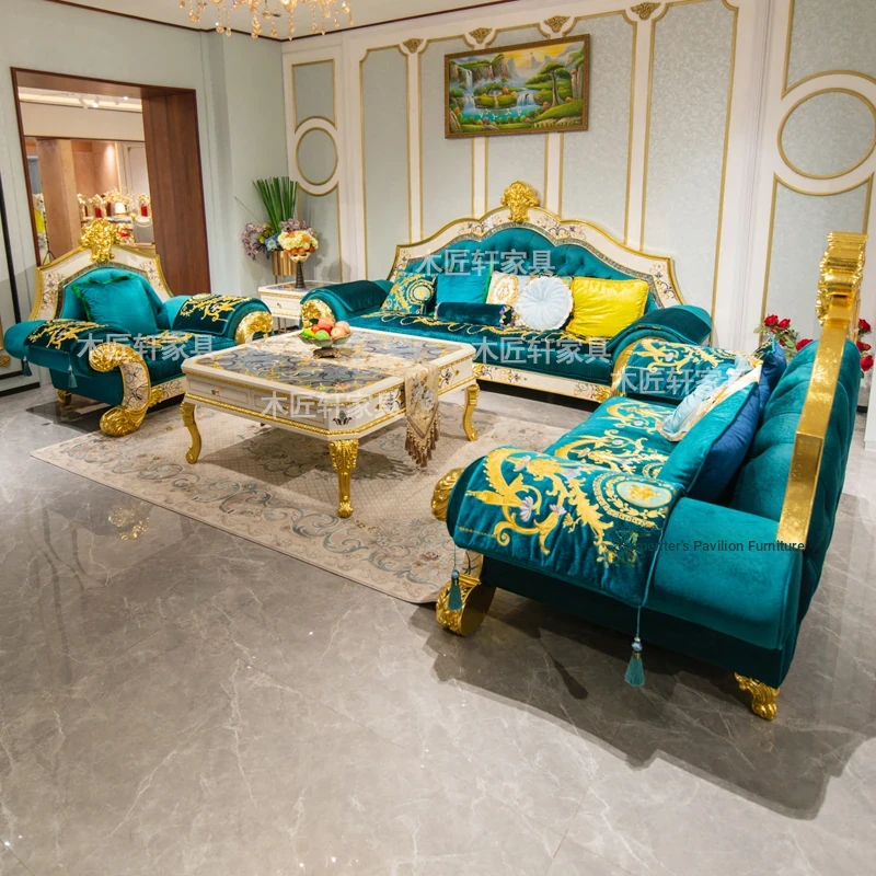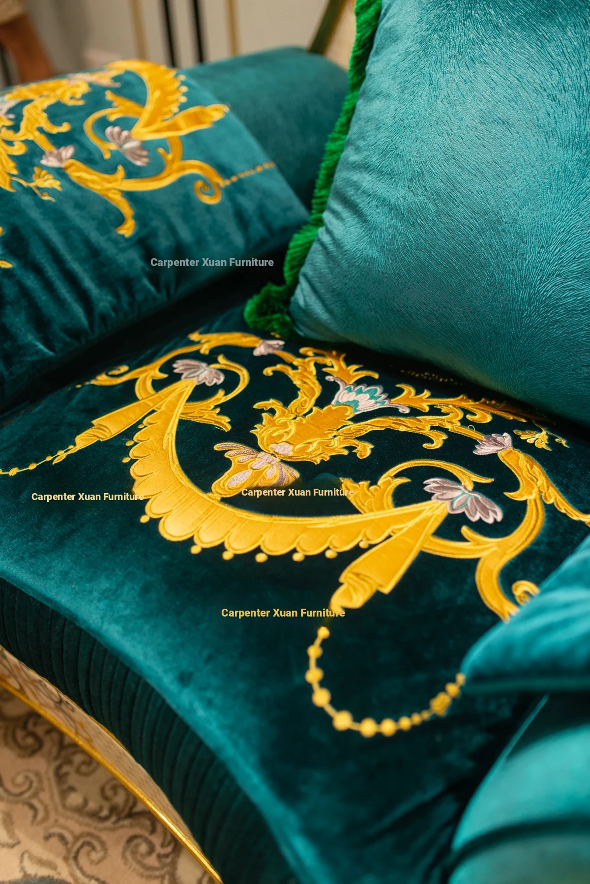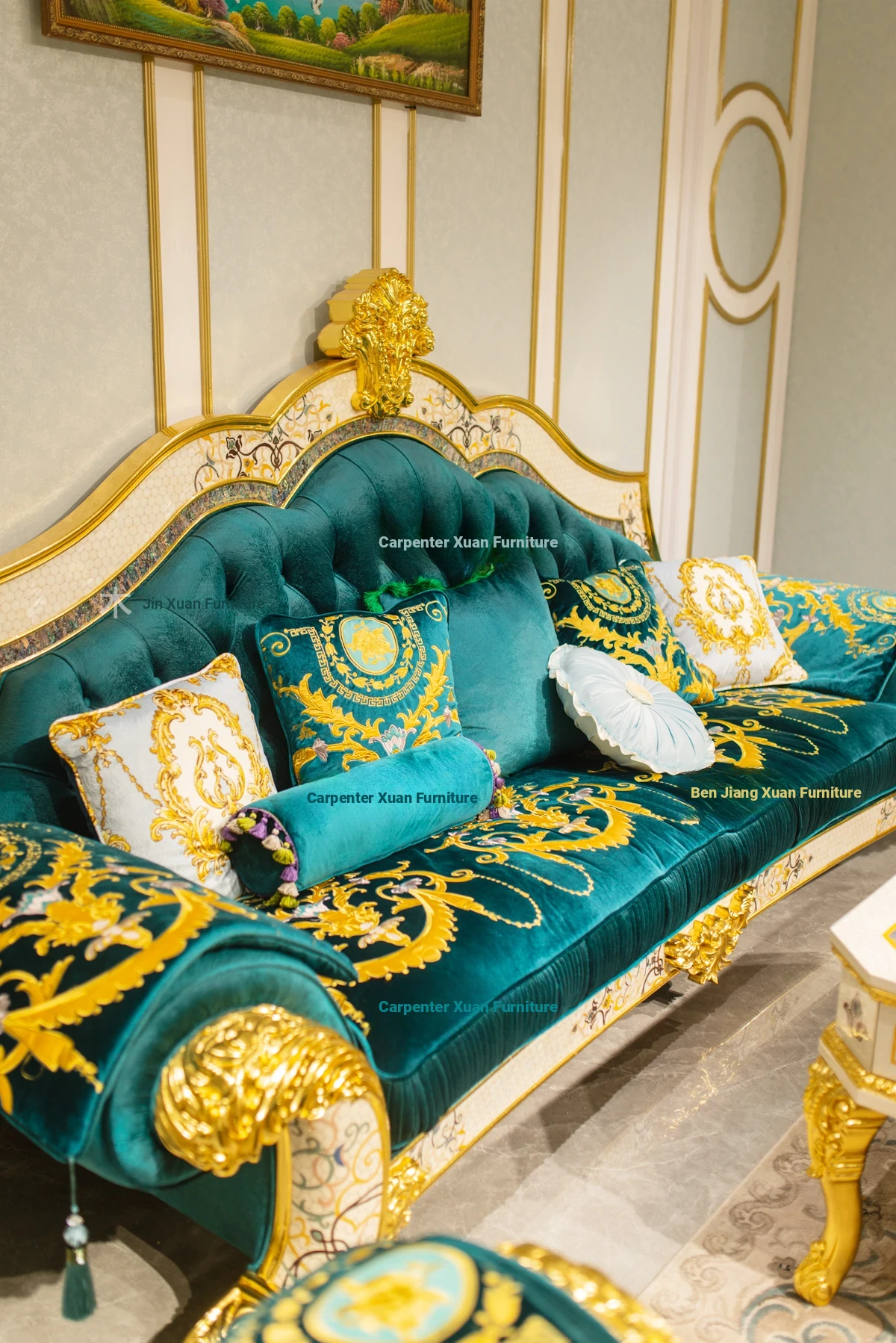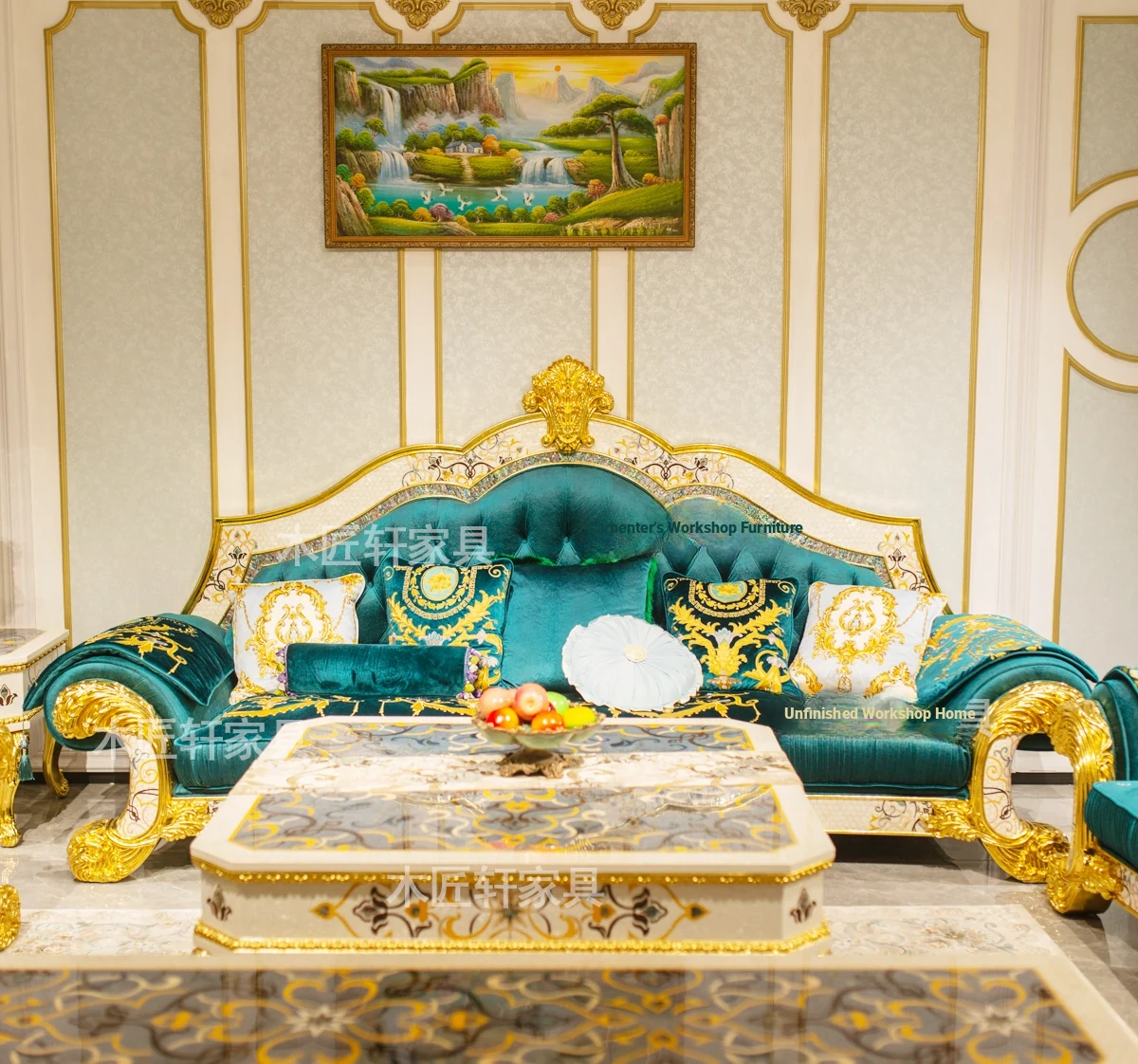 French Court Shell Mosaic Sofa - Luxurious European Solid Wood Furniture with Vintage Style for High-End Villas, Featuring Elegant Gold Foil Upholstery.