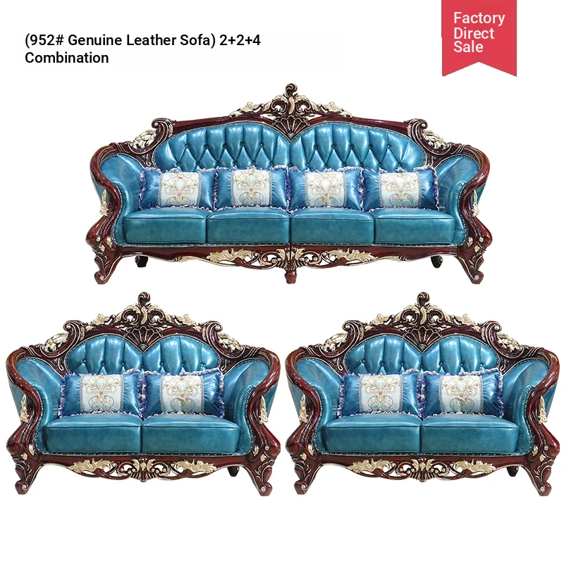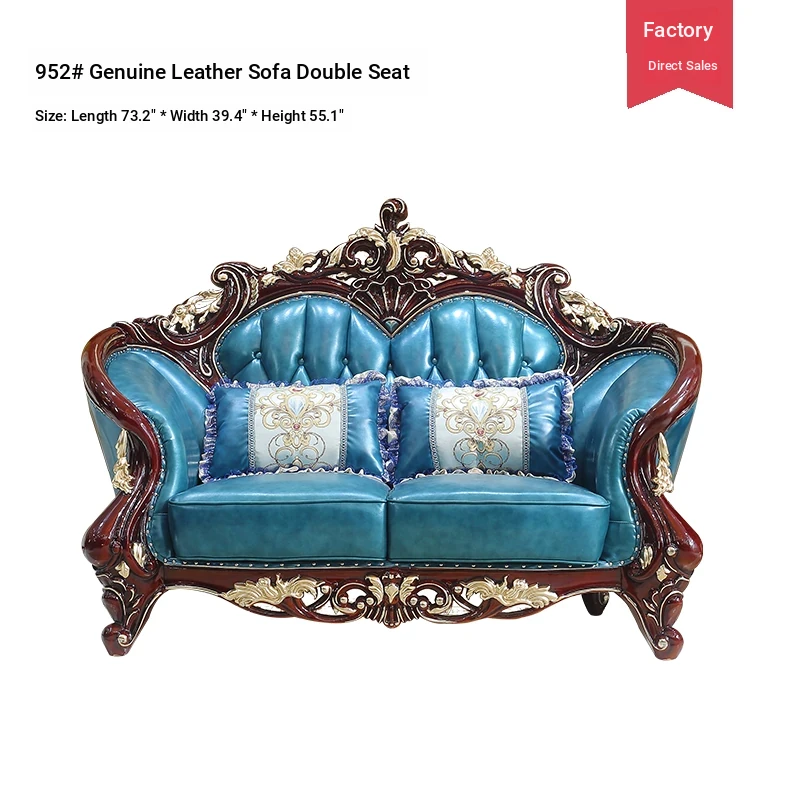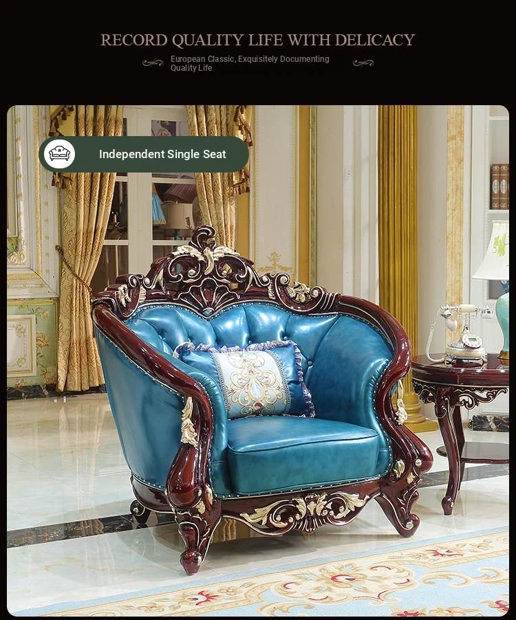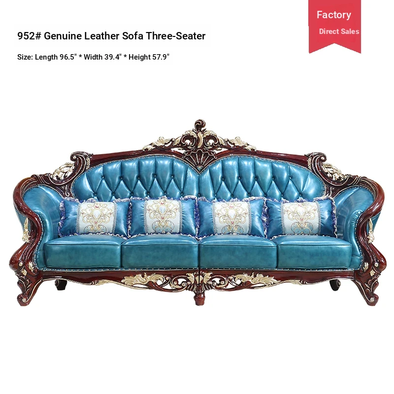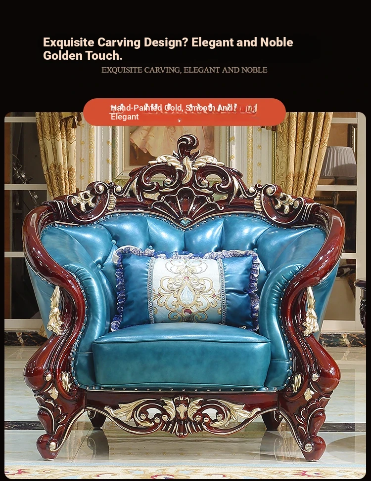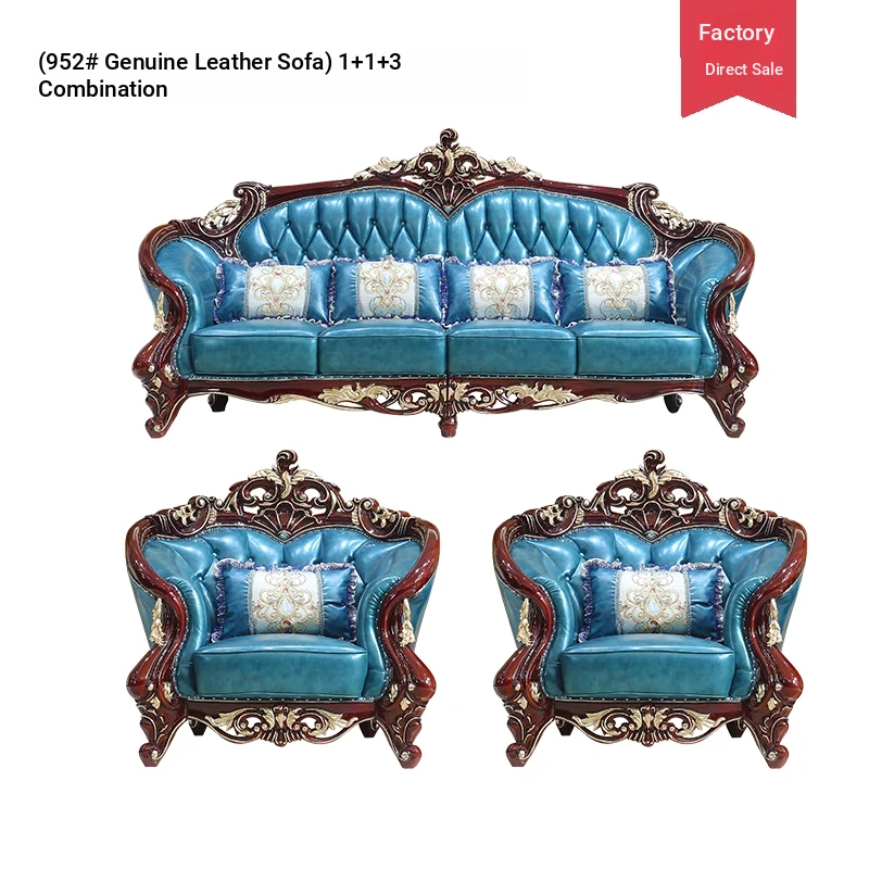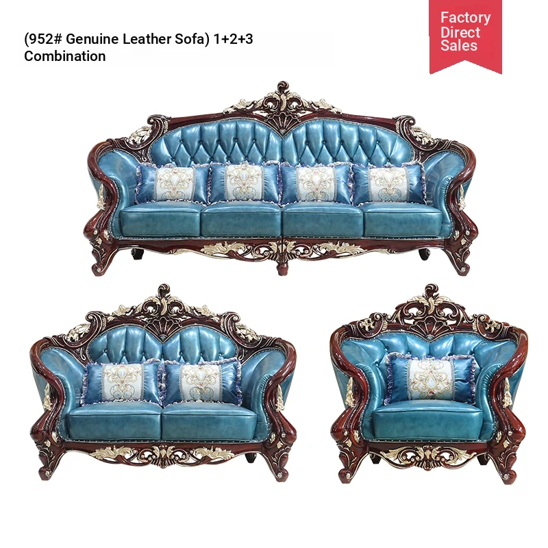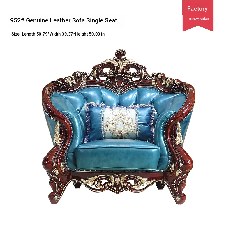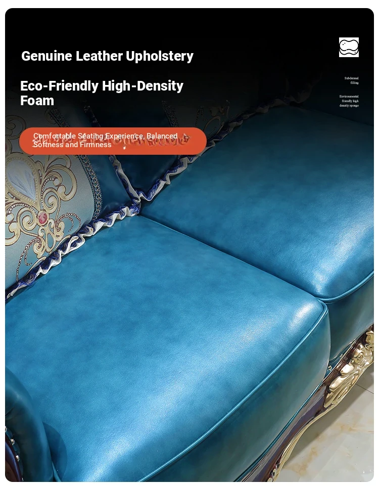 Luxurious European Style Genuine Leather Sofa Set - Hand-Carved Solid Wood Design in Rich Red Sandalwood Color, Perfect for Villa Living Rooms - Complete Range of Elegant Home Furniture