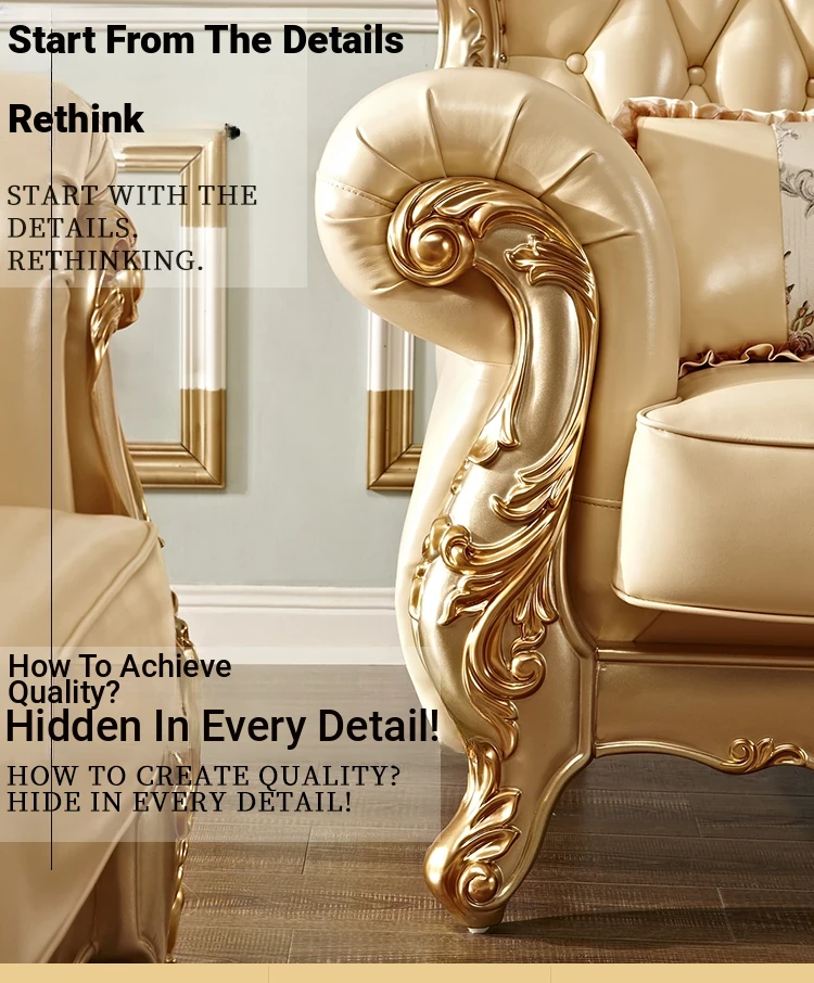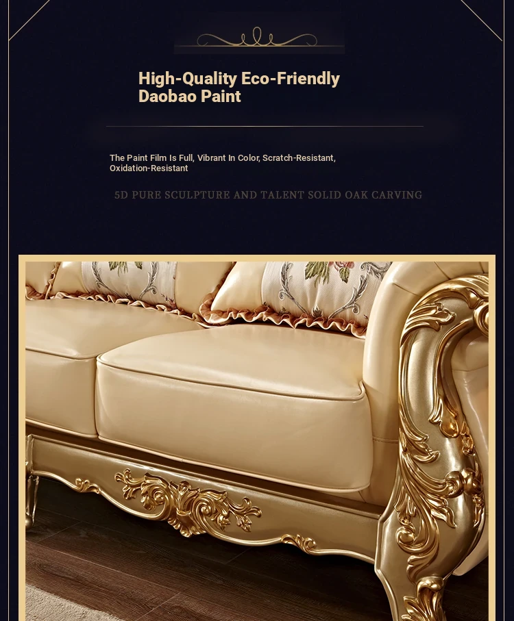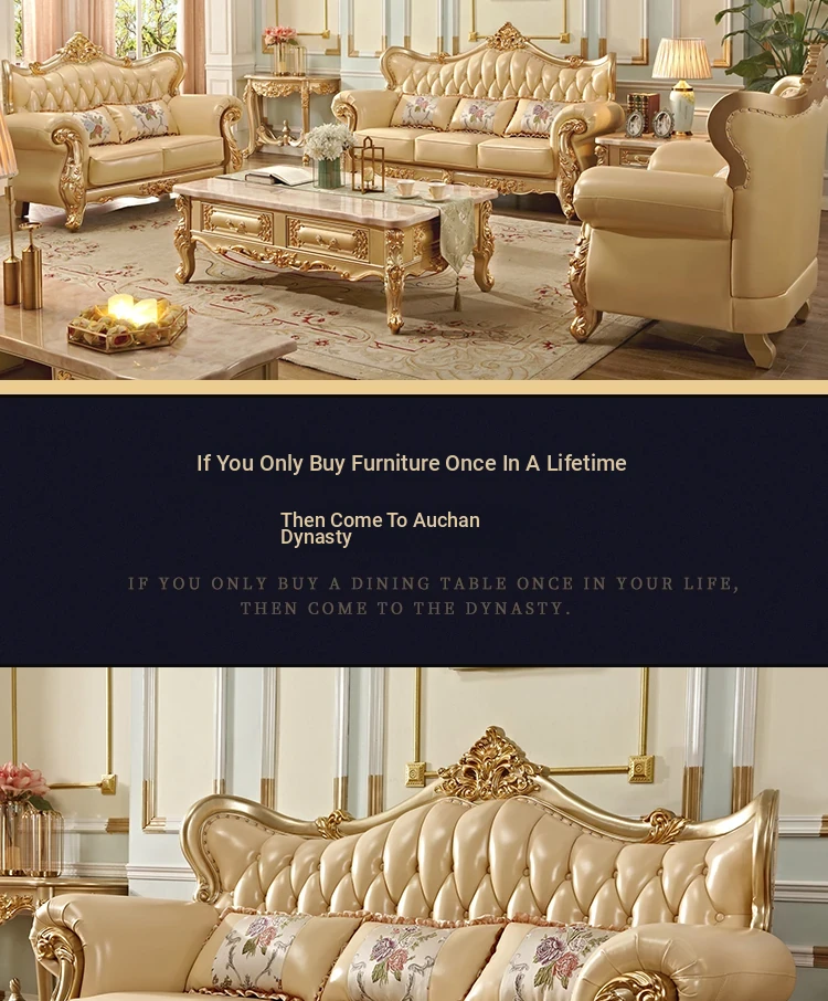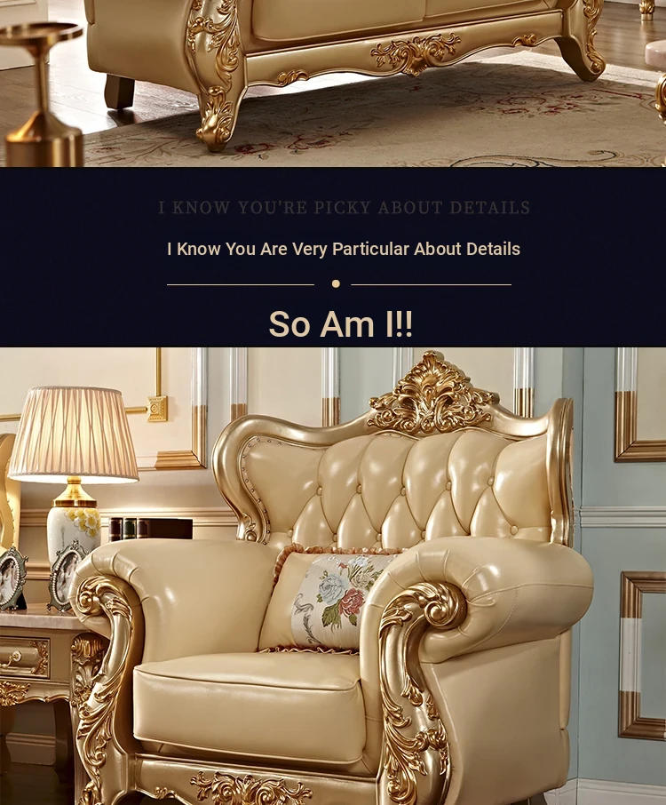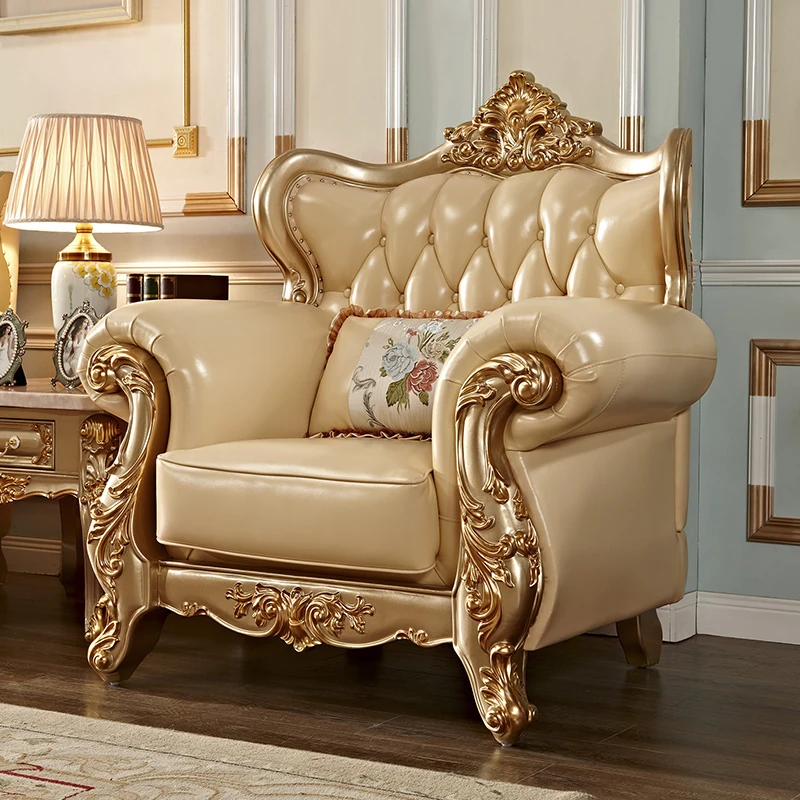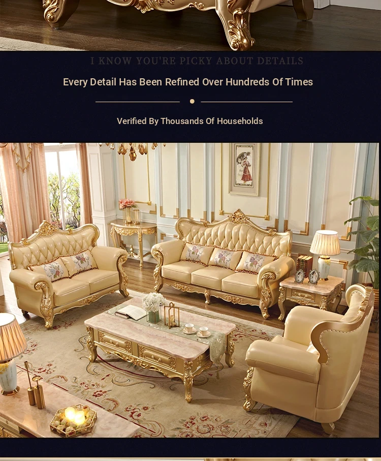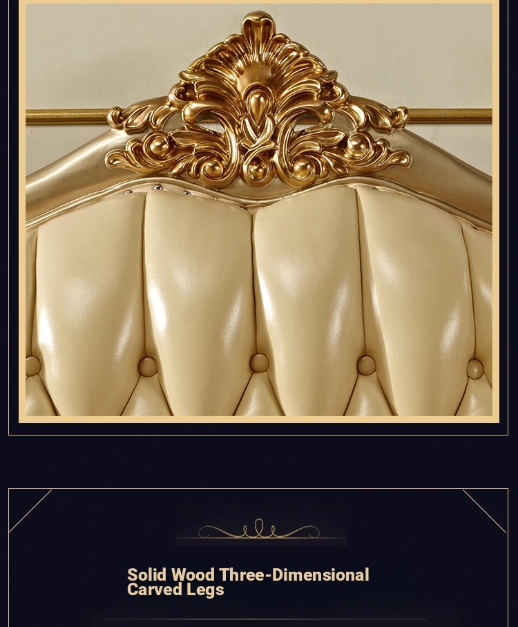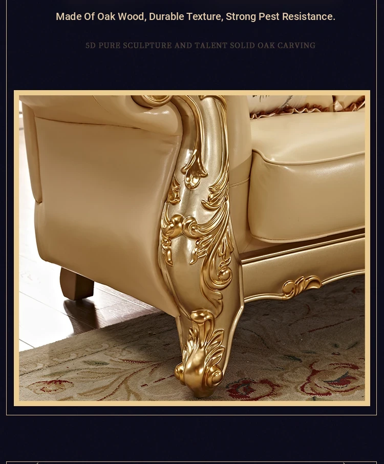 Luxurious European-style Villa Sofa Set - Genuine Leather Living Room Furniture in Champagne Gold with Exquisite Solid Wood Carvings for All Size Homes