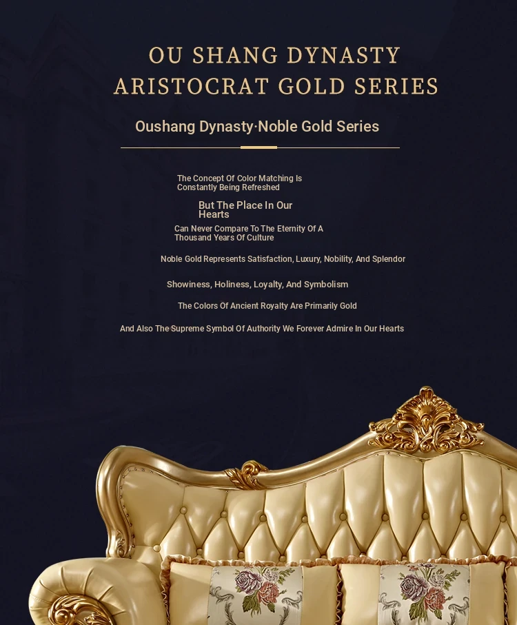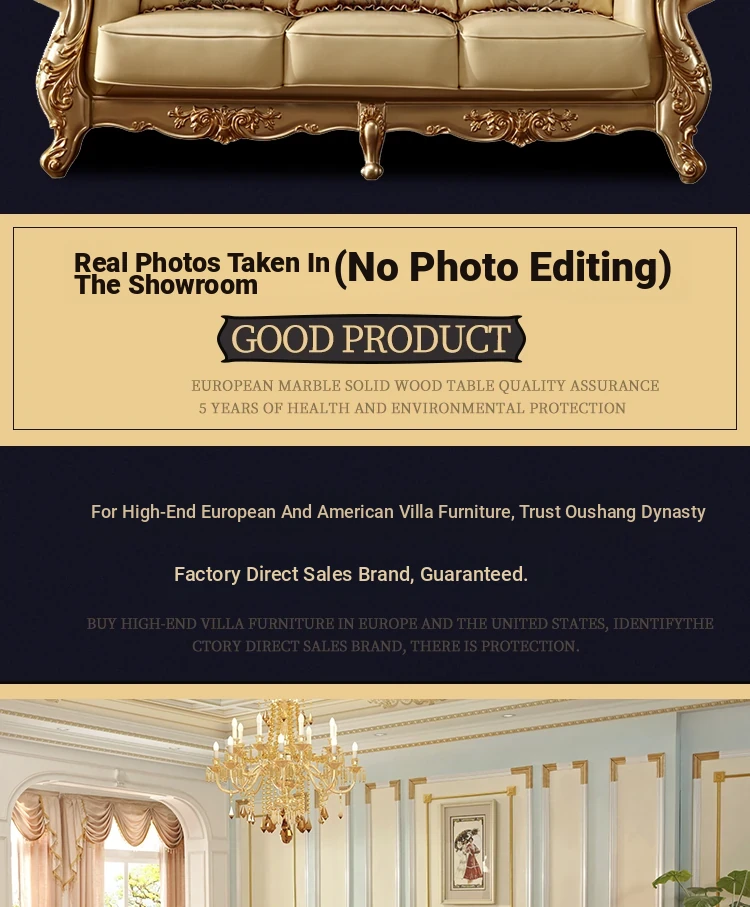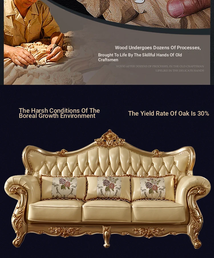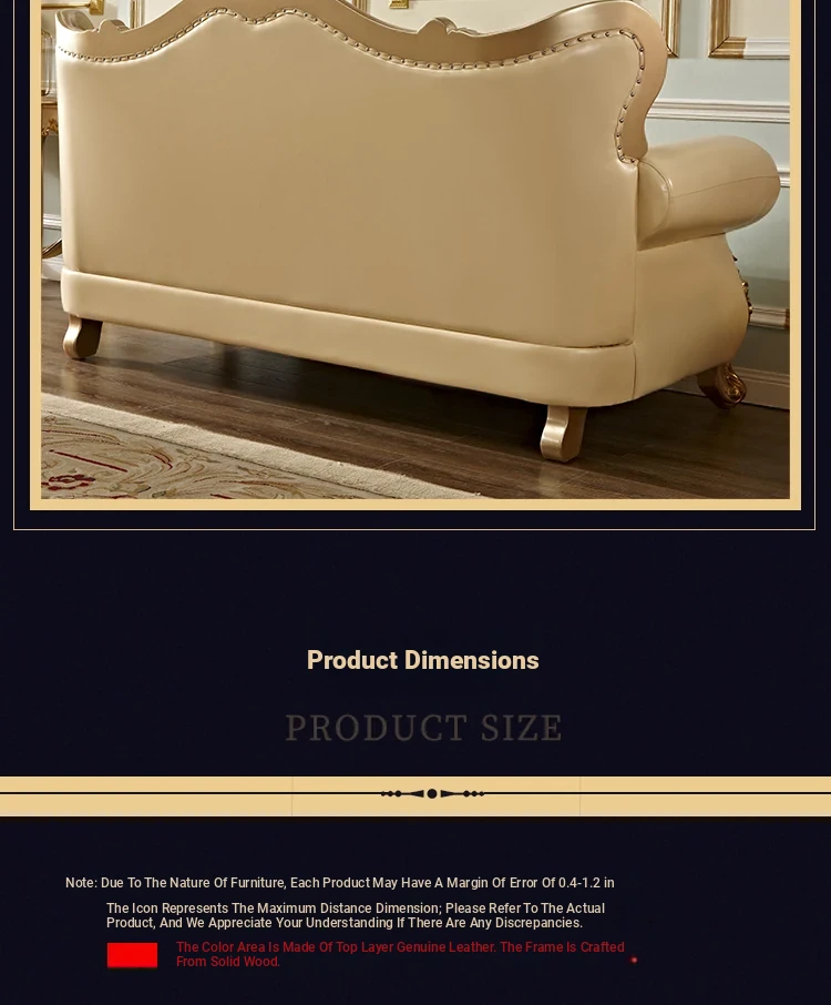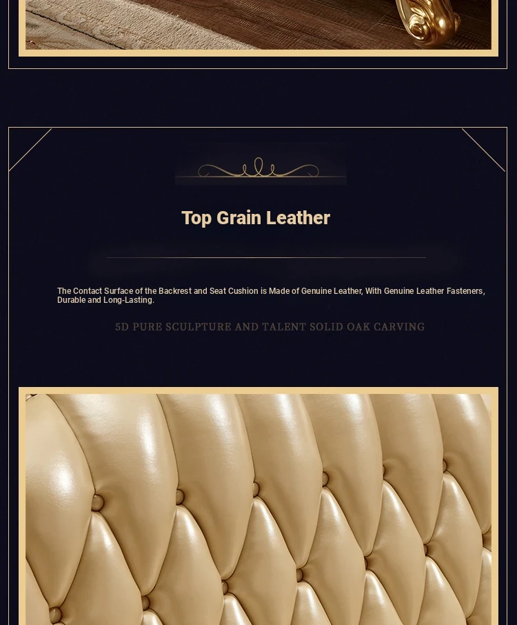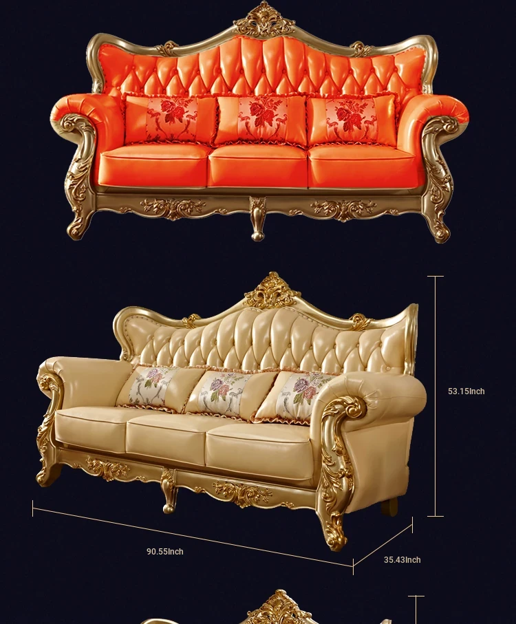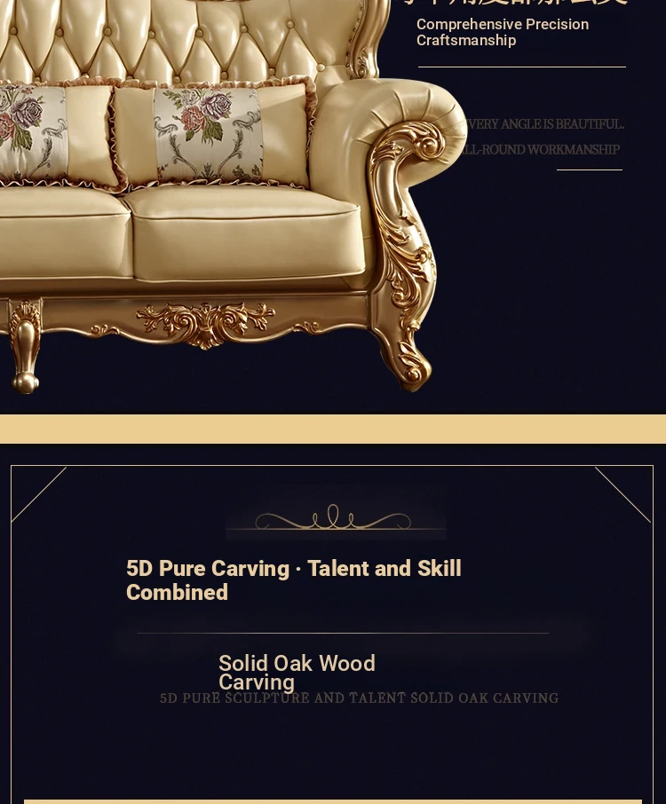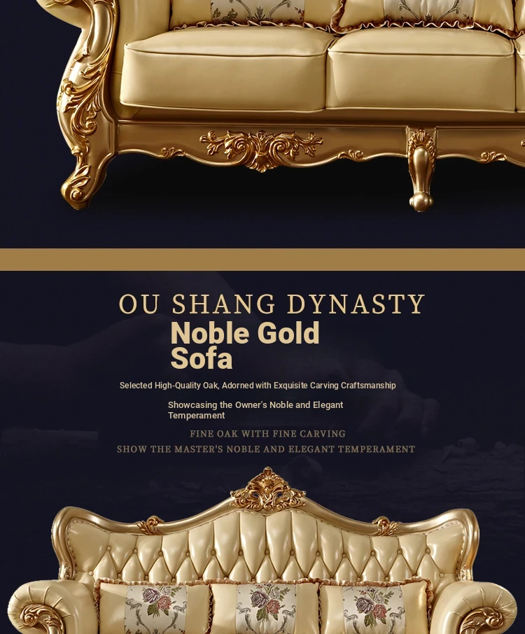 Luxurious European-style Villa Sofa Set - Genuine Leather Living Room Furniture in Champagne Gold with Exquisite Solid Wood Carvings for All Size Homes