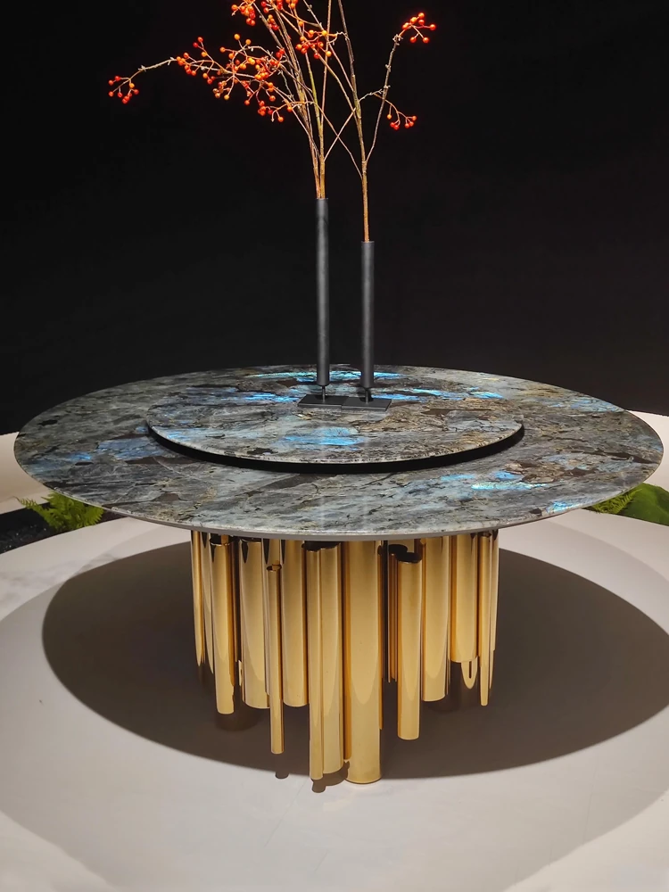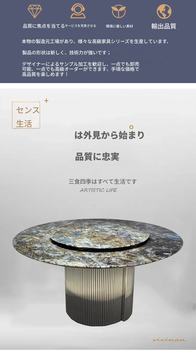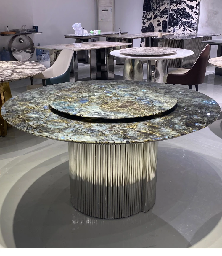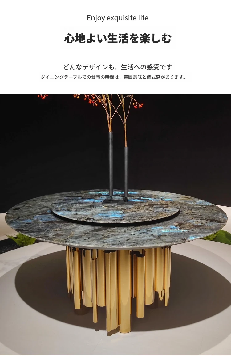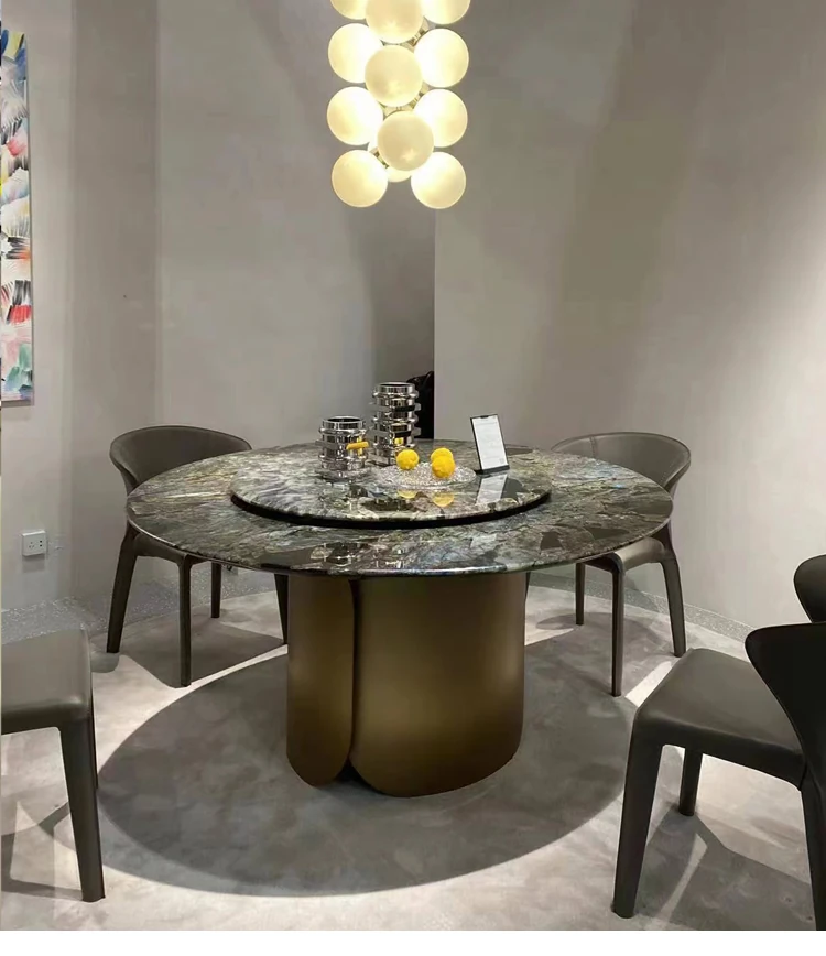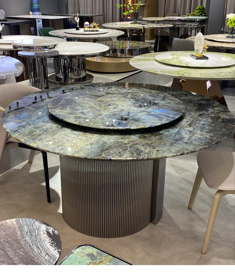 ラグジュアリーなブルージェイド大理石ラウンドテーブル - 2025年新作、豪華感溢れる別荘用円形ダイニングテーブル。洗練されたデザインで、上質な空間を演出します。