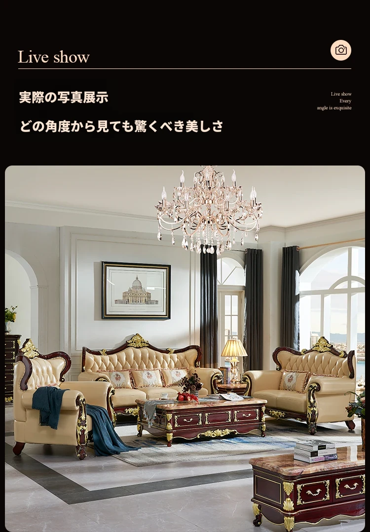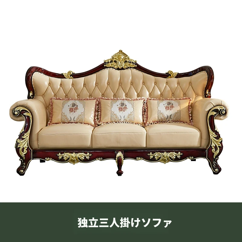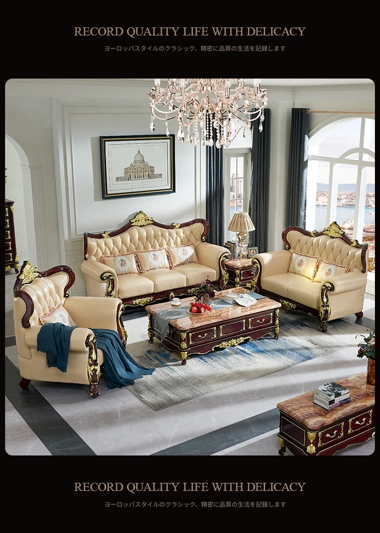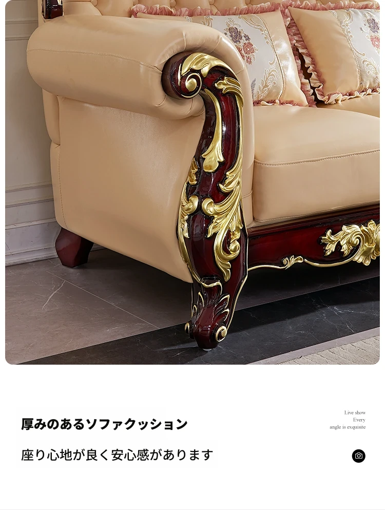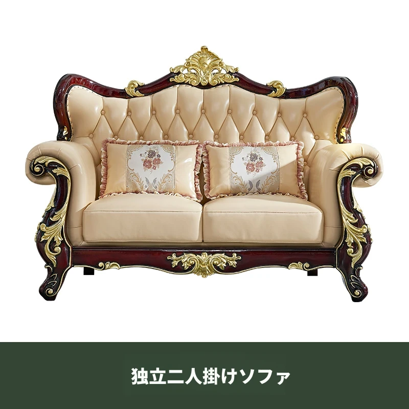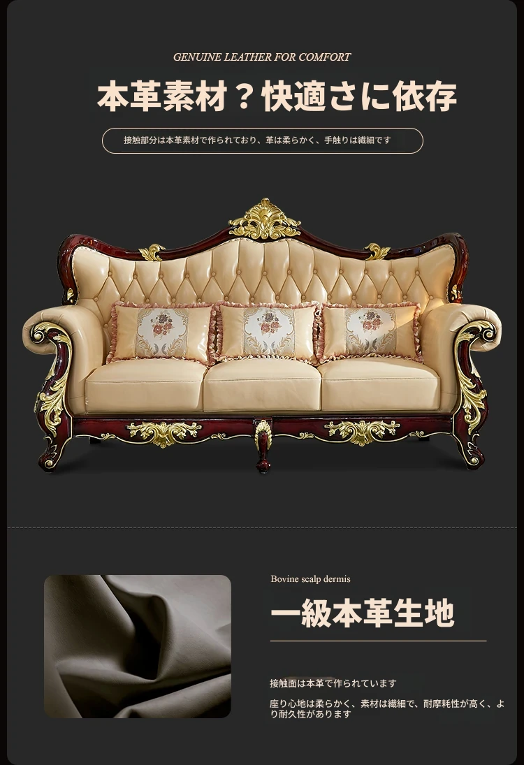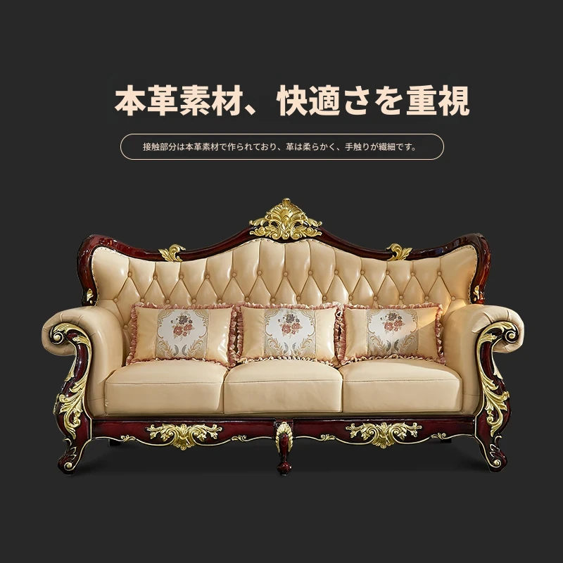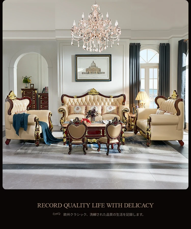 ラグジュアリーな欧州スタイルの別荘ソファセット - 本革製、シャンパンゴールドの実木彫刻仕上げ、どんなサイズのお部屋にもぴったり!豪華なリビング空間を演出します。
