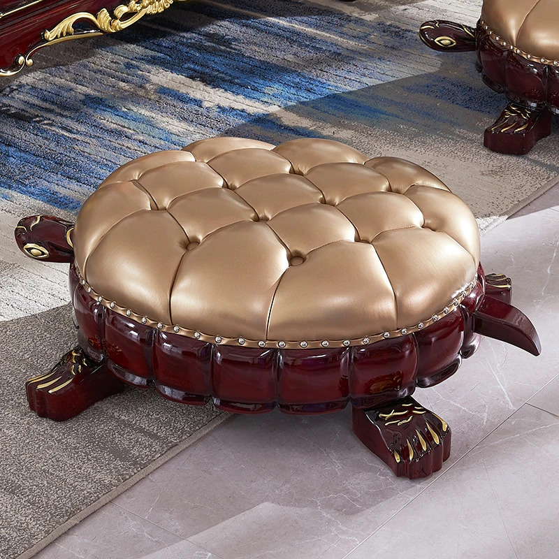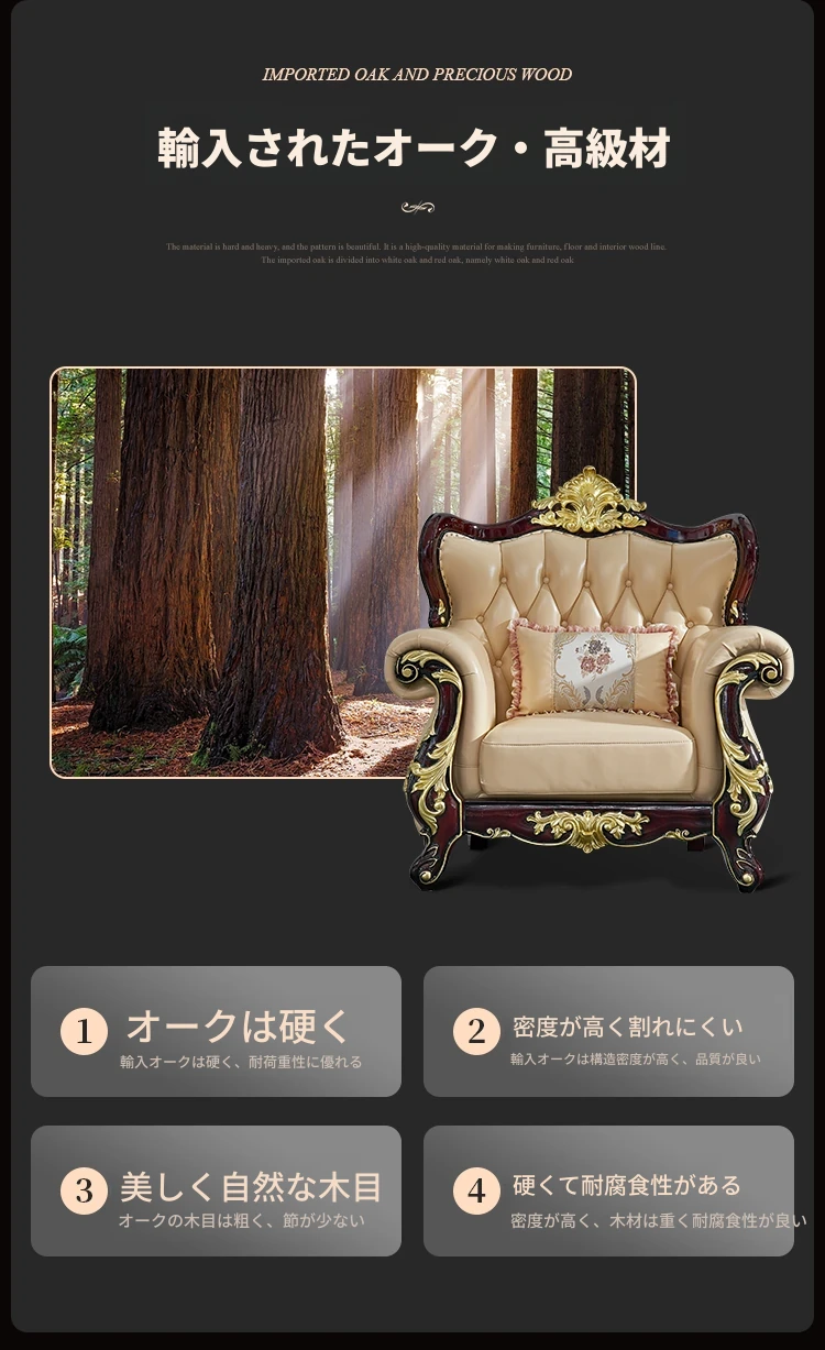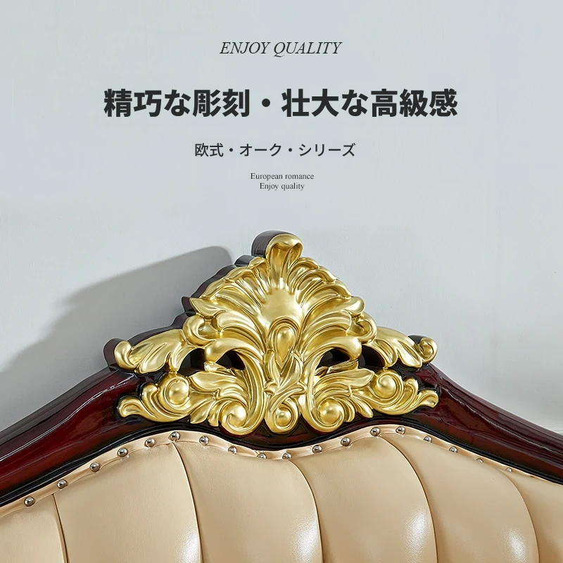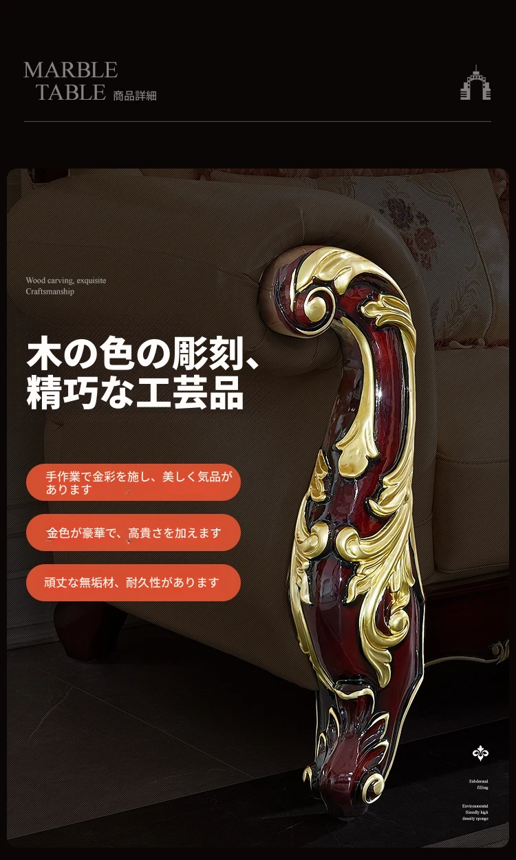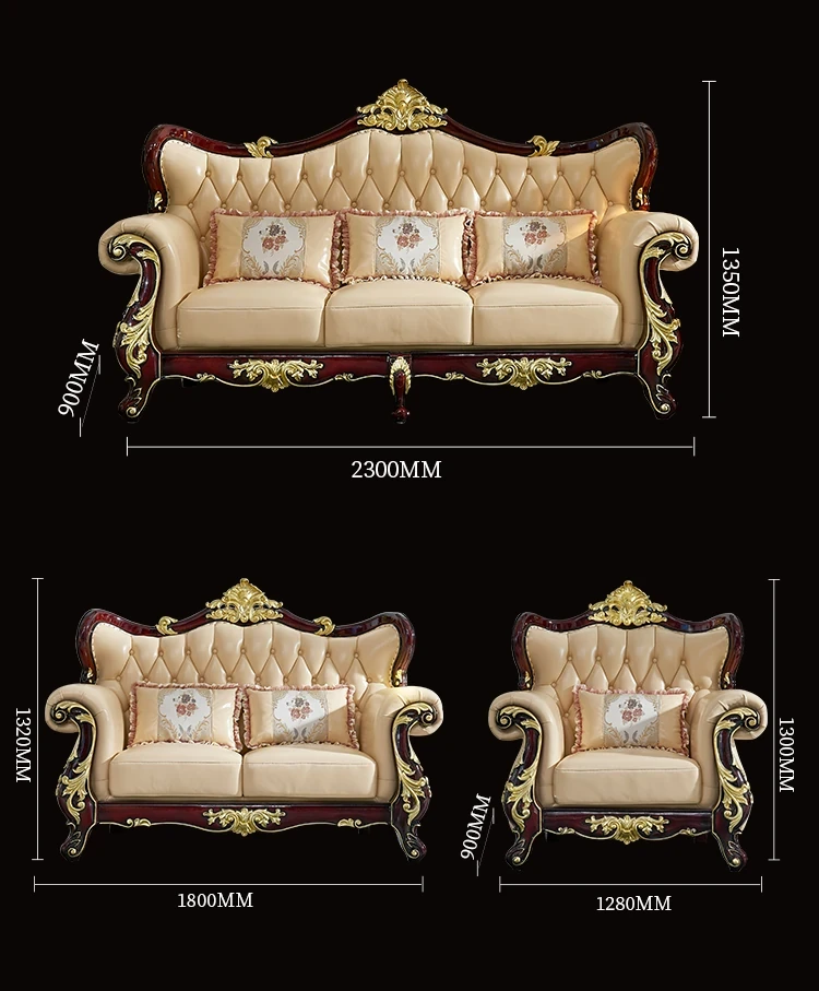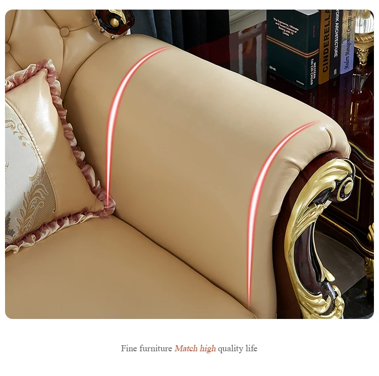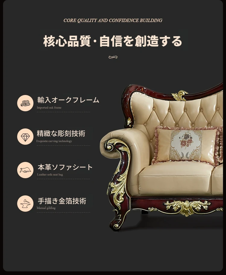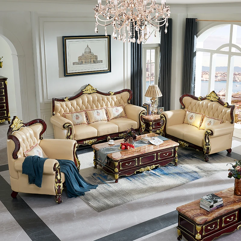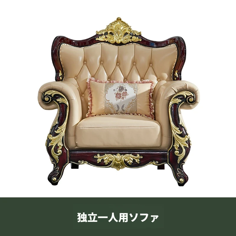 ラグジュアリーな欧州スタイルの別荘ソファセット - 本革製、シャンパンゴールドの実木彫刻仕上げ、どんなサイズのお部屋にもぴったり!豪華なリビング空間を演出します。