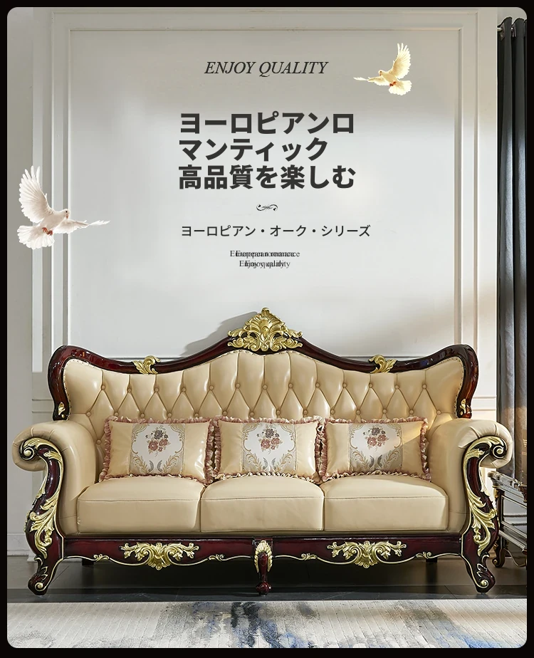エレガントな欧風本革ソファ|アメリカンラグジュアリー全無垢材使用|両面彫刻の高級白色123大サイズソファ|広々としたお住まいにぴったり!
