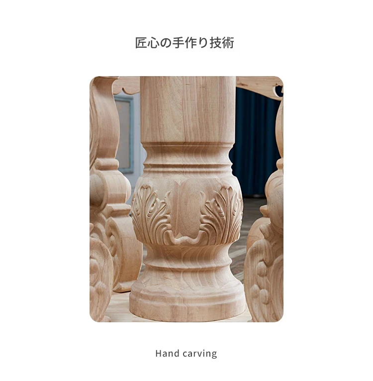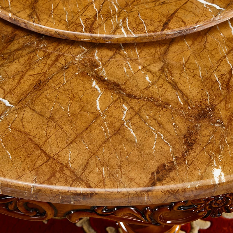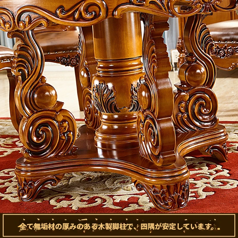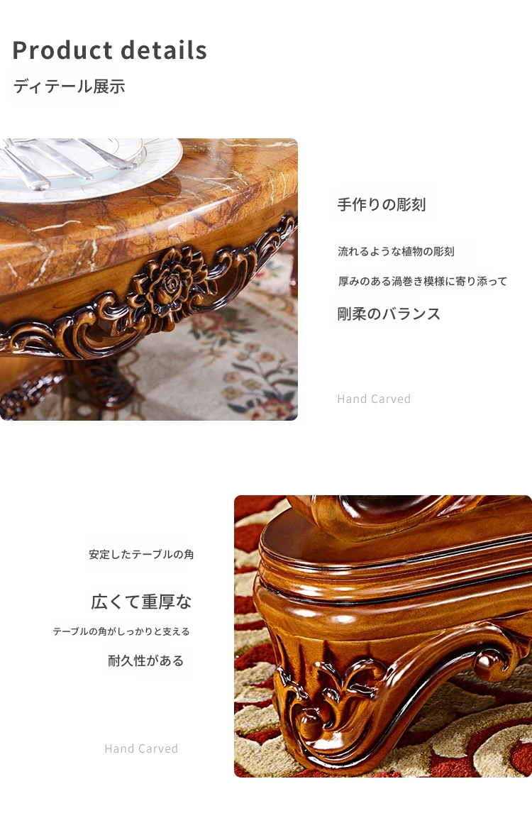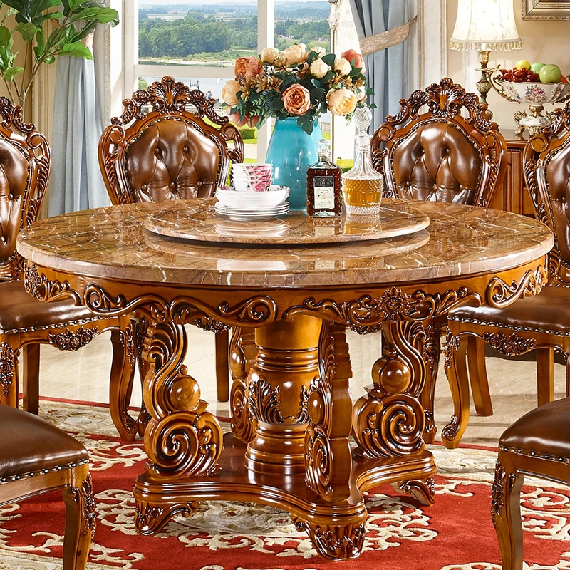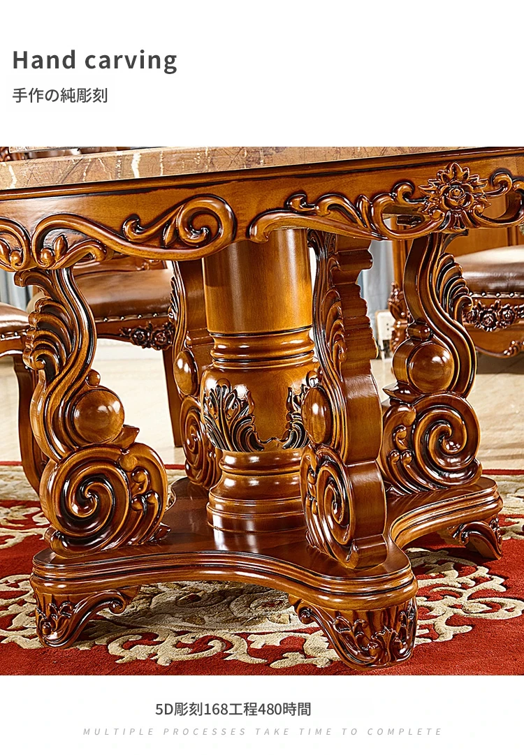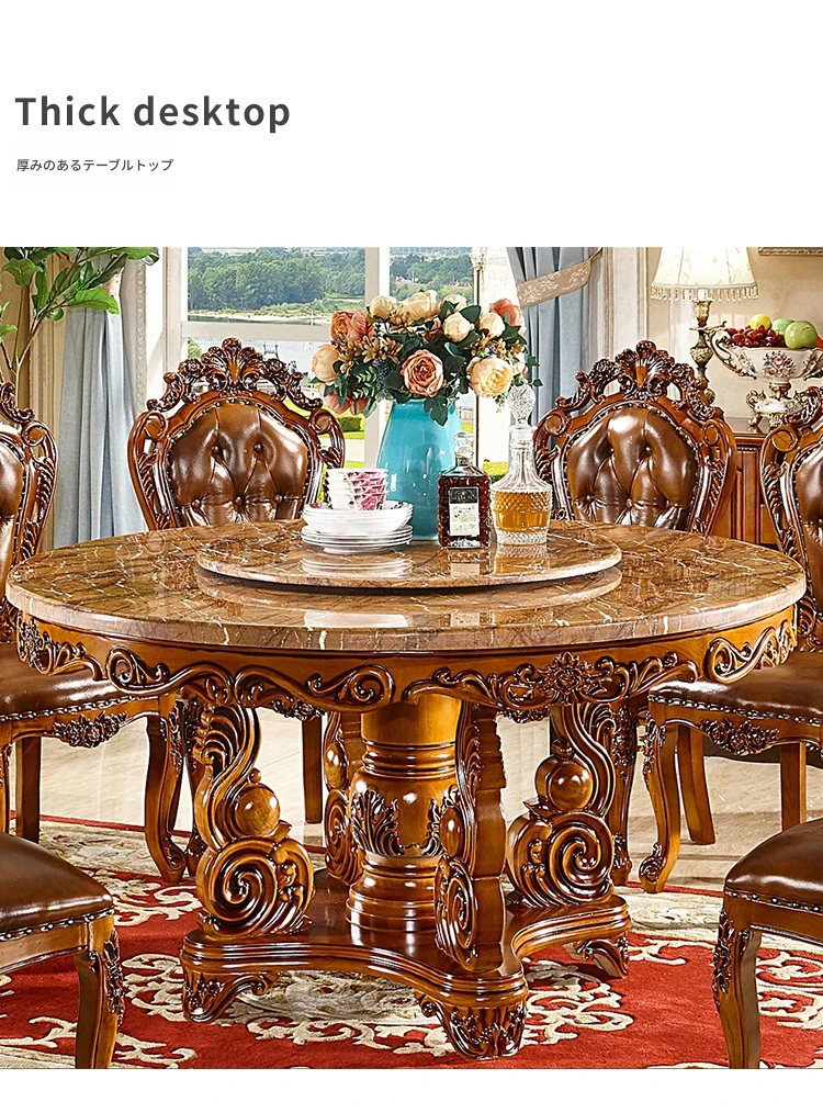エレガントなヨーロピアンスタイルの大理石ダイニングテーブルセット - 本物の木製彫刻円卓、8人用ダイニングテーブル、アメリカンヴィンテージ風6人用セットで、特別な食卓を演出します!