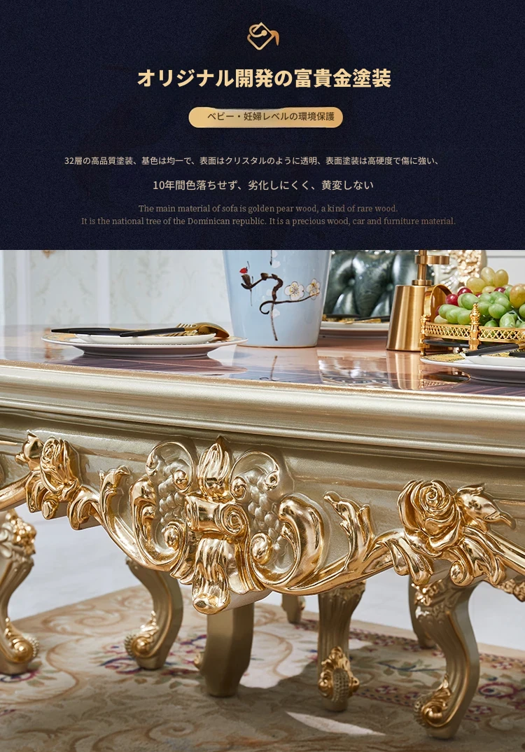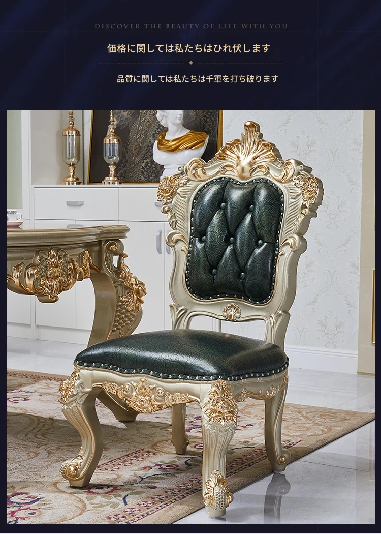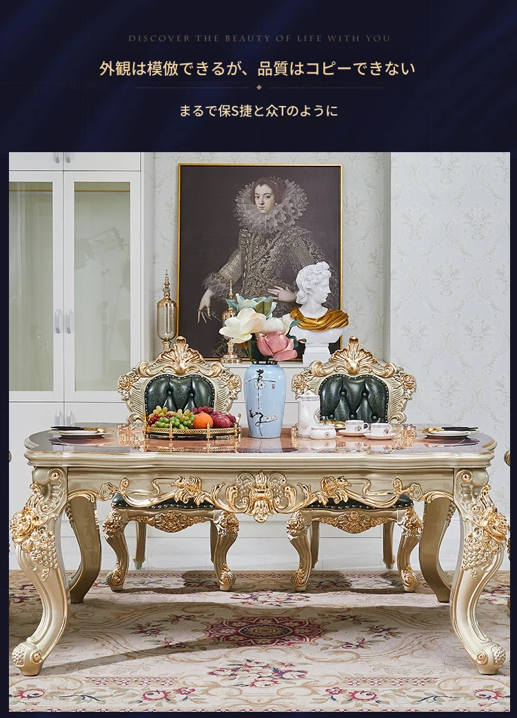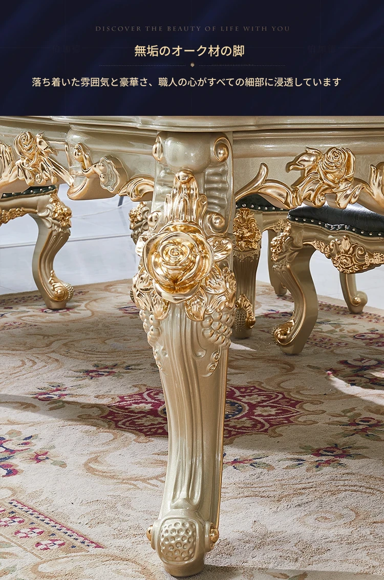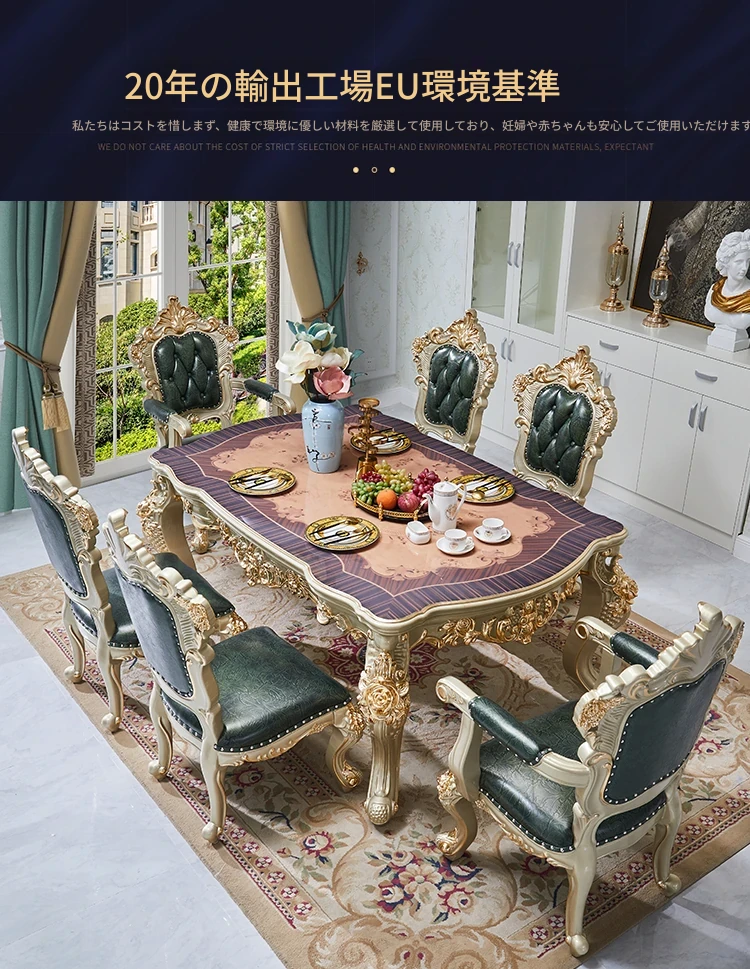 エレガントな別荘用ダイニングテーブル|オシャレな長方形大理石テーブル(1.9m)|シャンパンゴールドのフレームと深緑のレザー椅子セット|贅沢な食卓で特別なひとときを演出!