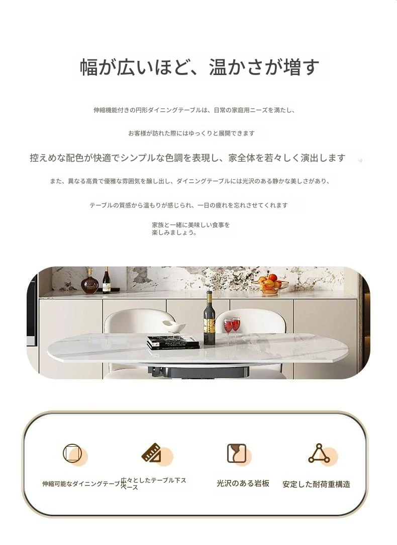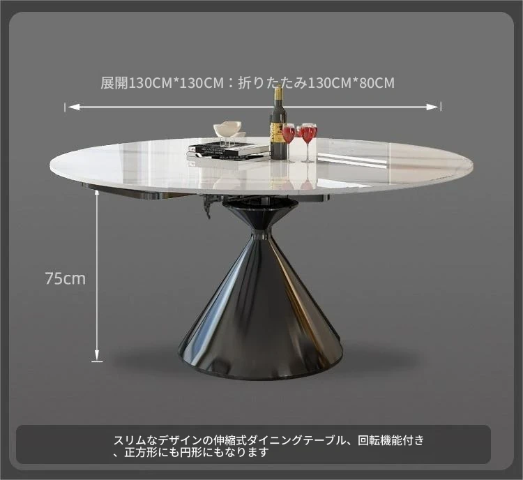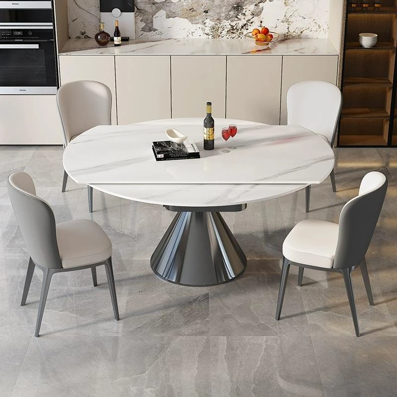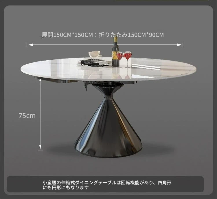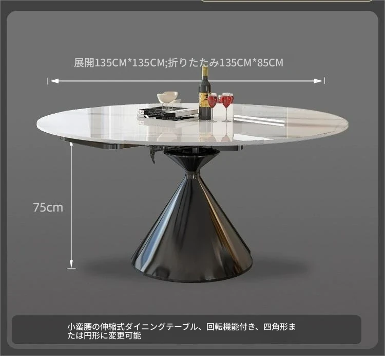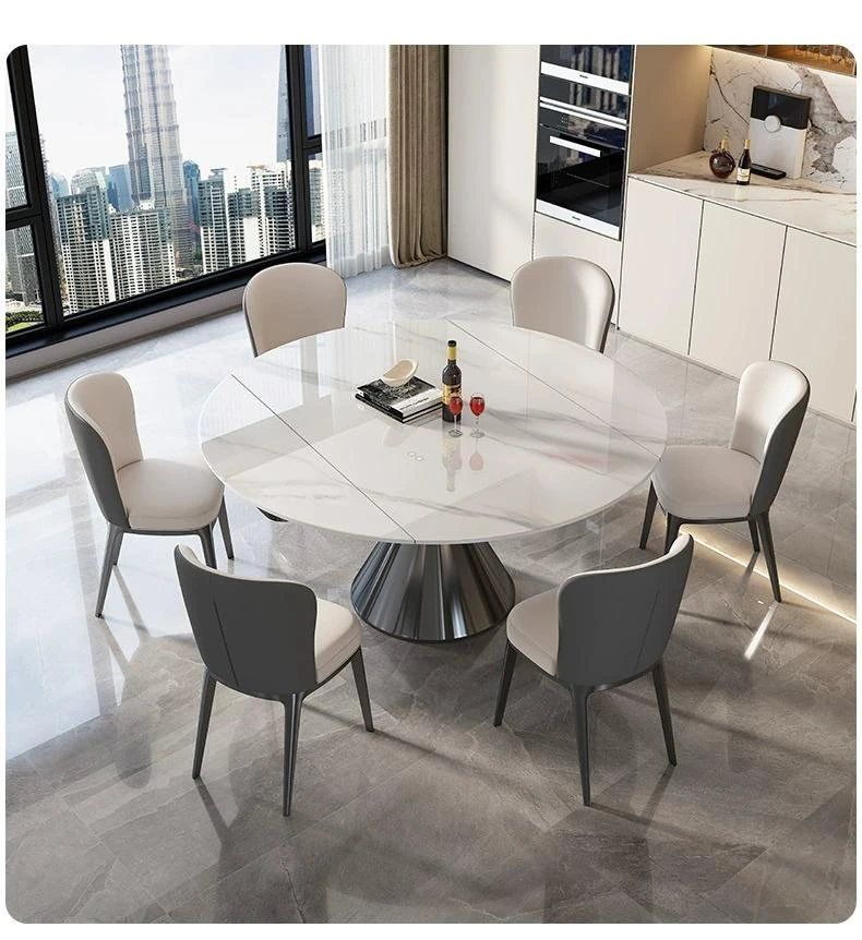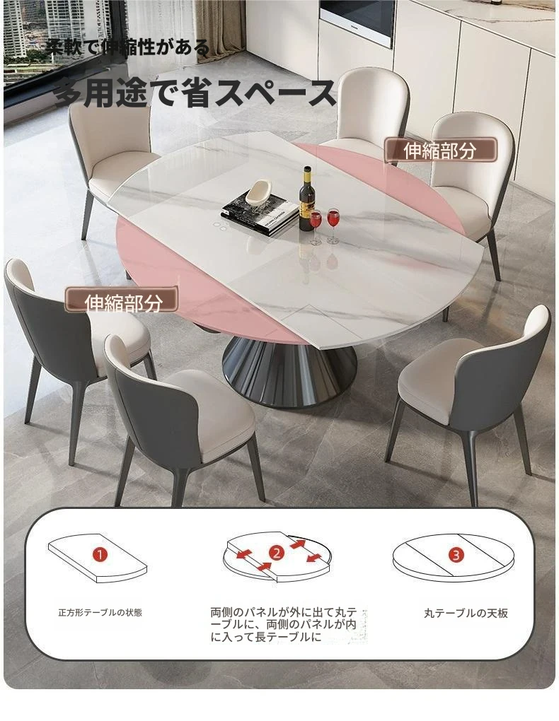 イタリアンミニマルデザインの高級感漂う伸縮式回転岩板ダイニングテーブルセット - 小型住宅に最適な折りたたみ円形テーブルと椅子のコンビネーション。快適な食卓を演出し、スペースを有効活用!