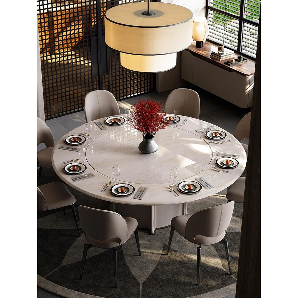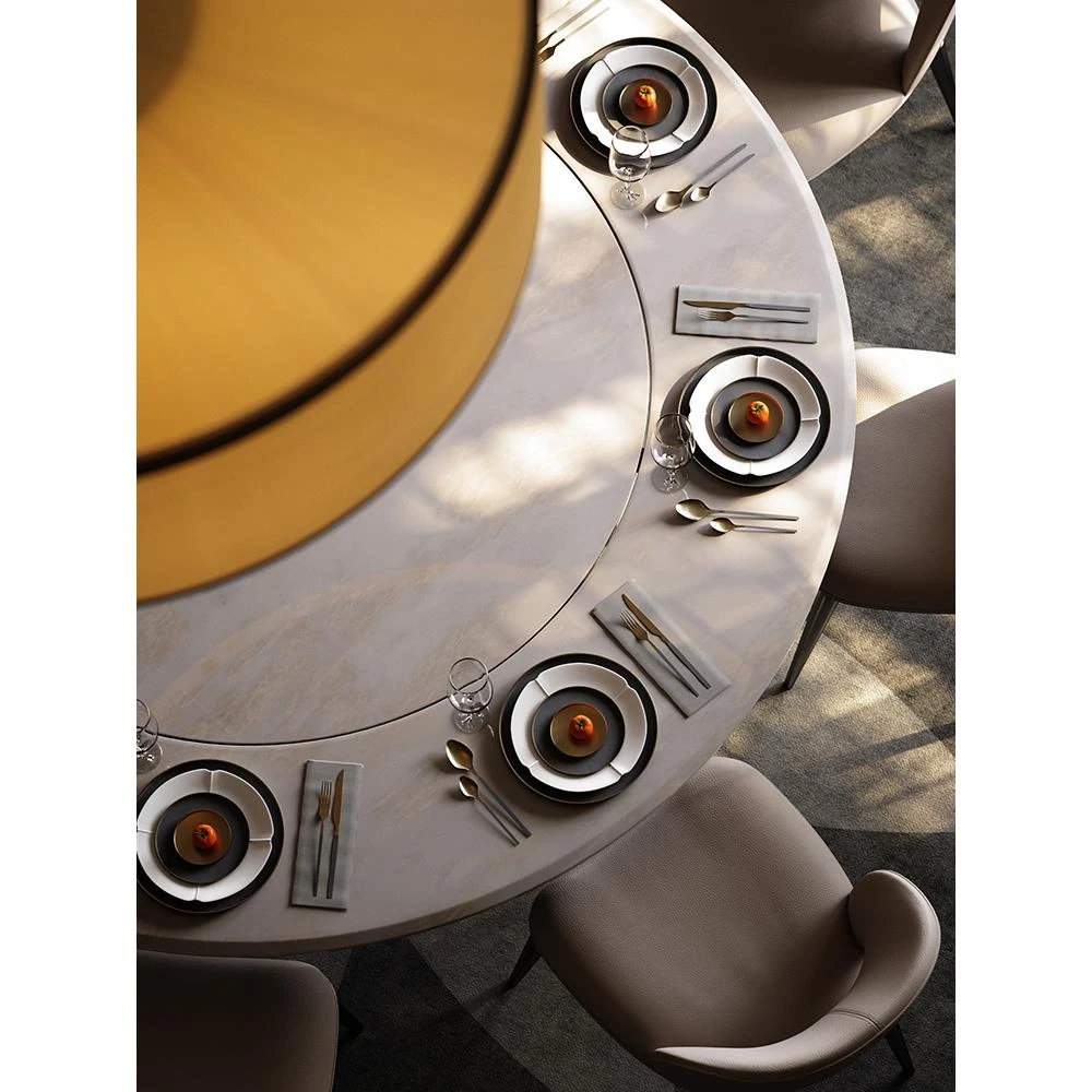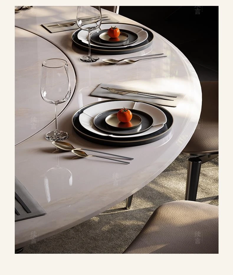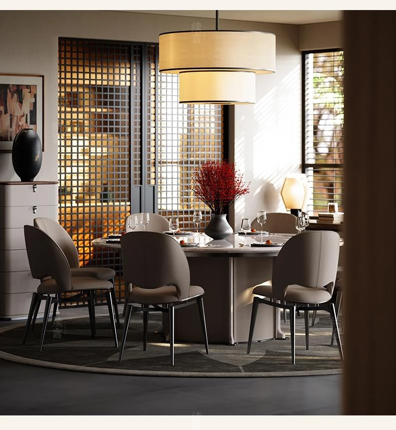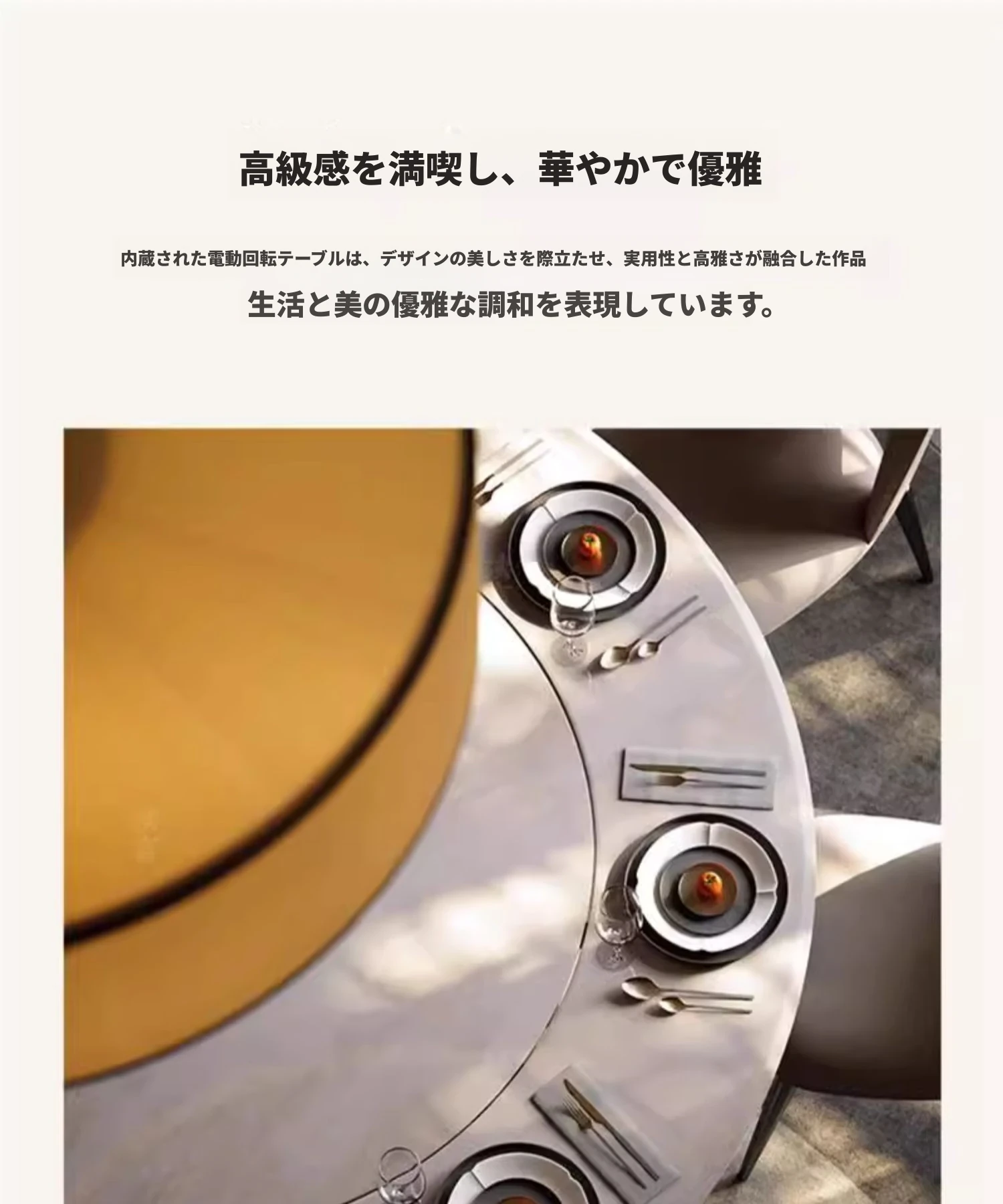 内蔵円形ダイニングテーブル/2.2M/カリアイスストーン+A631ダイニングチェア/超ファイバー皮*8/ブラックチタン