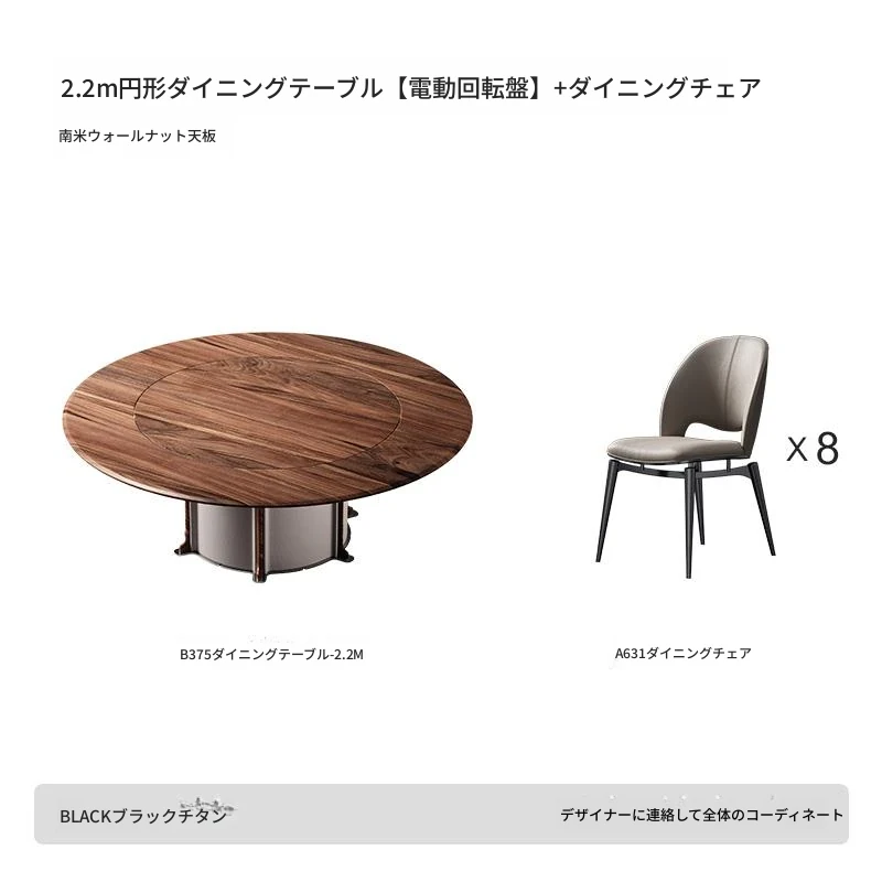 内蔵円形ダイニングテーブル/2.2M/南米ウォールナット+A631ダイニングチェア/超ファイバー皮*8/ブラックチタン