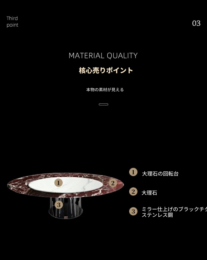 豪華な大理石ダイニングテーブル - ヴィラにぴったり!回転式デザインで、イタリアンモダンな極簡スタイルの天然石製ラウンドテーブルセット。洗練された雰囲気を演出し、特別な食事のひとときを提供します。
