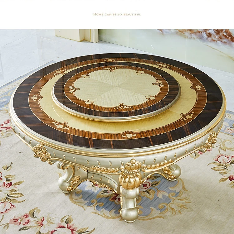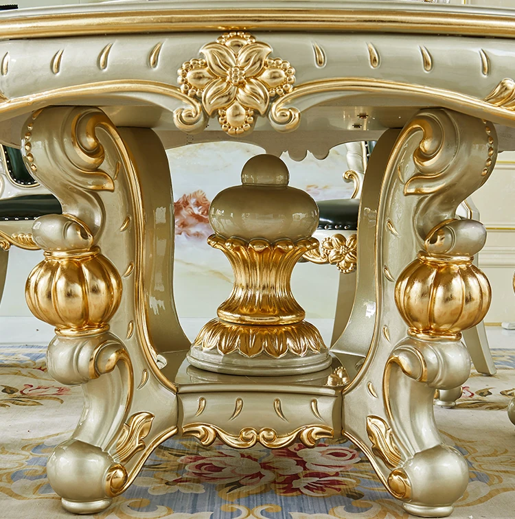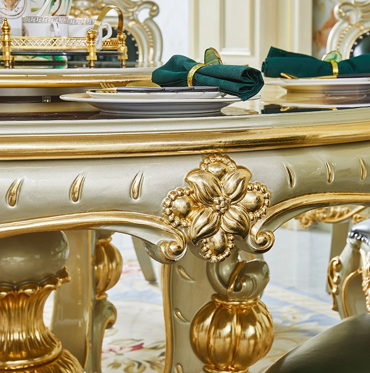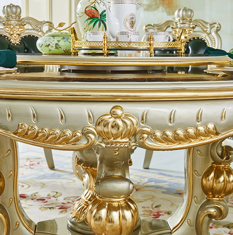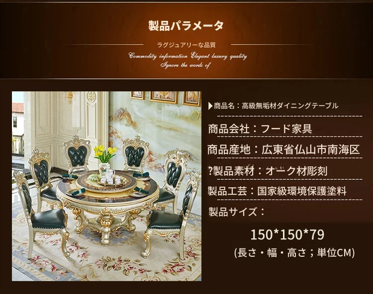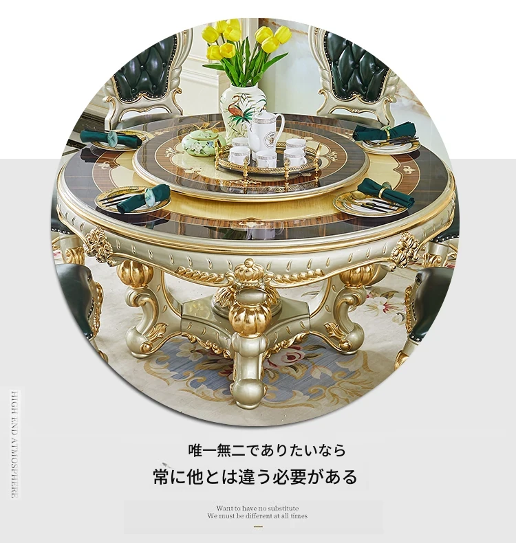 豪華な欧式ヴィラ用ダイニングテーブルセット!全実木製の円形テーブルとエレガントなクラウン型ダークグリーンチェア、シャンパンゴールドの大理石が美しい。家族や友人との特別なひとときを演出します。