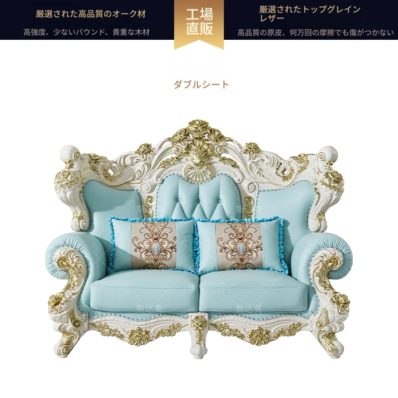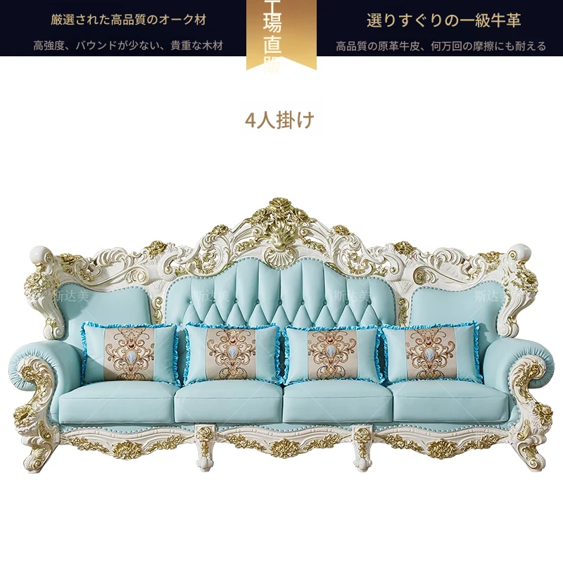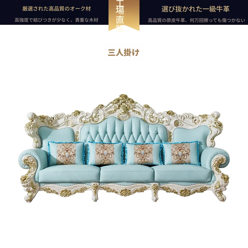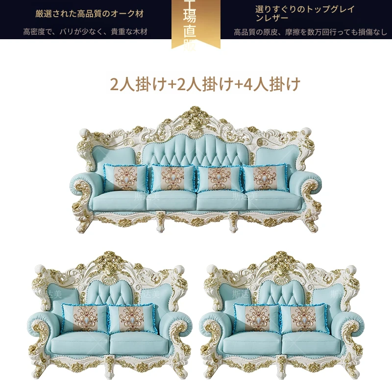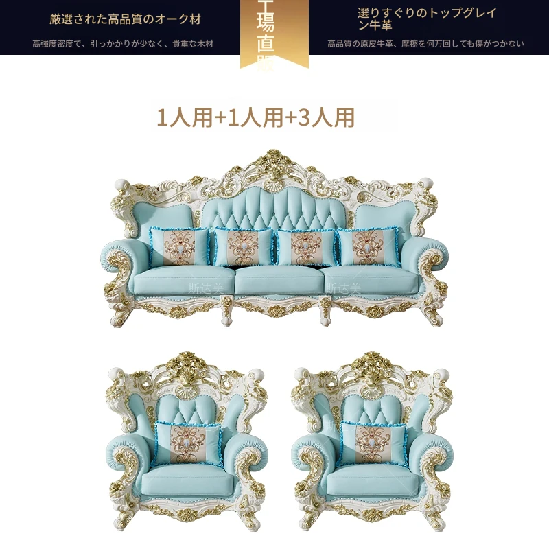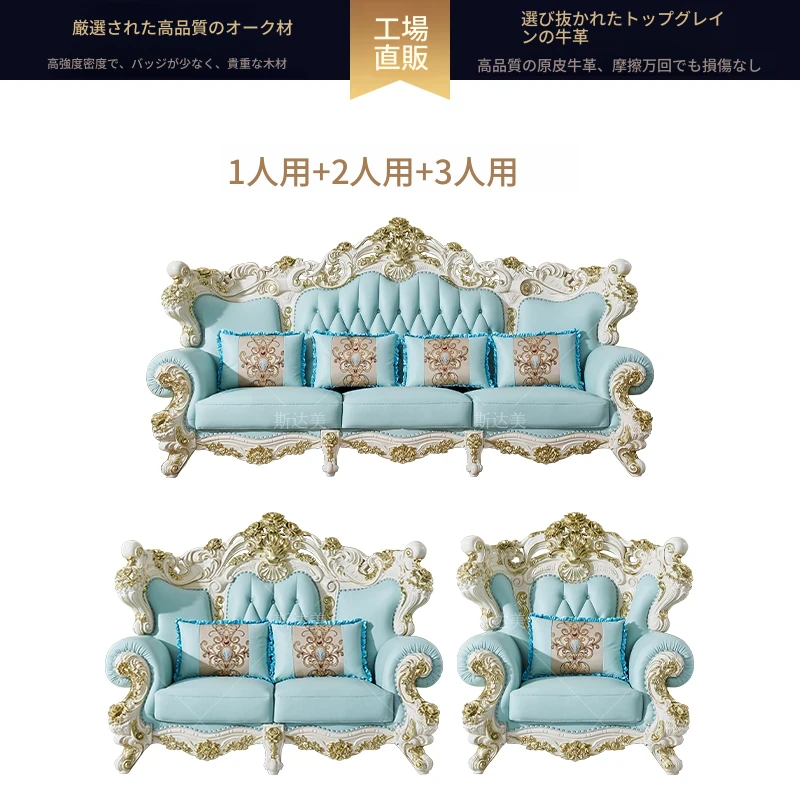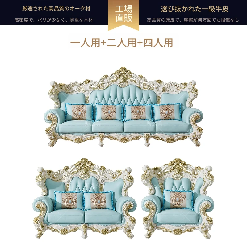 ラグジュアリーな欧州スタイルの別荘ソファセット - 本革製、シャンパンゴールドの実木彫刻仕上げ、どんなサイズのお部屋にもぴったり!豪華なリビング空間を演出します。