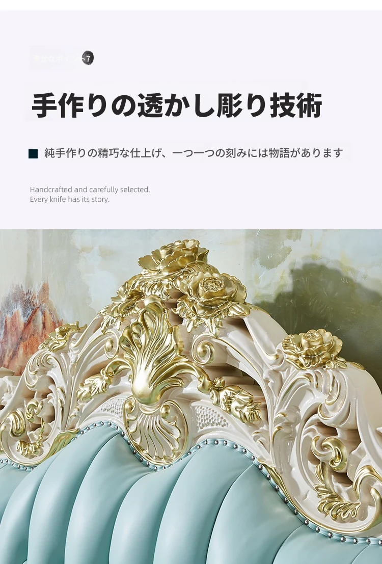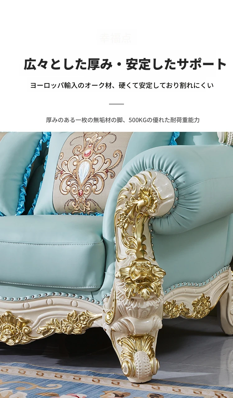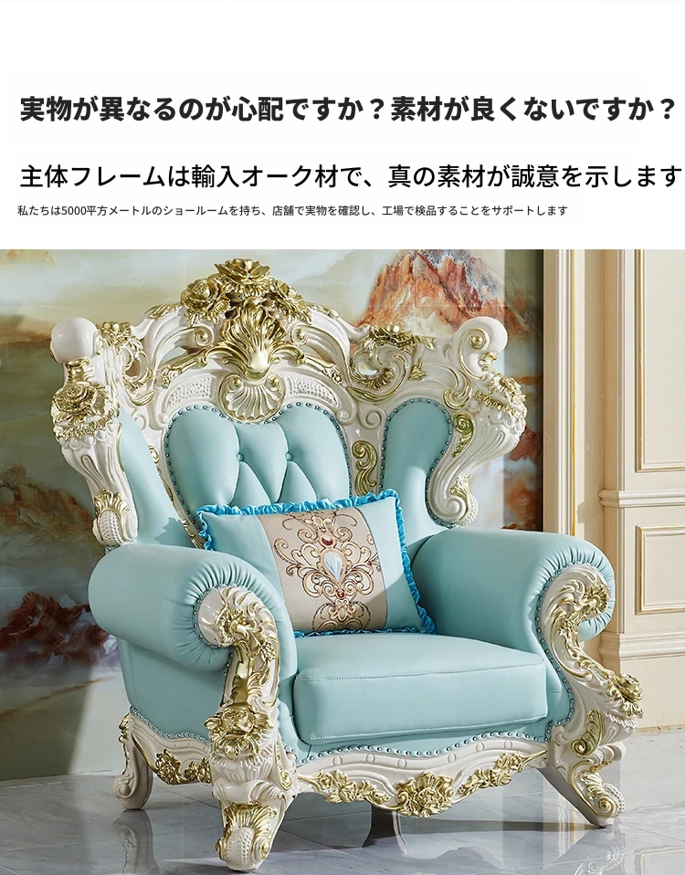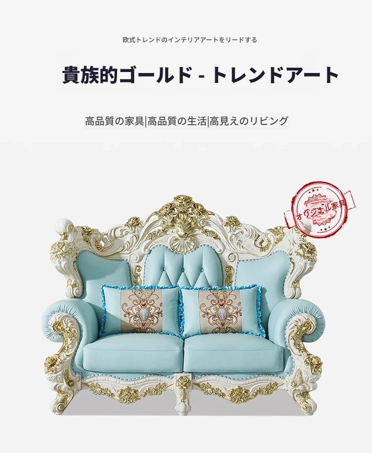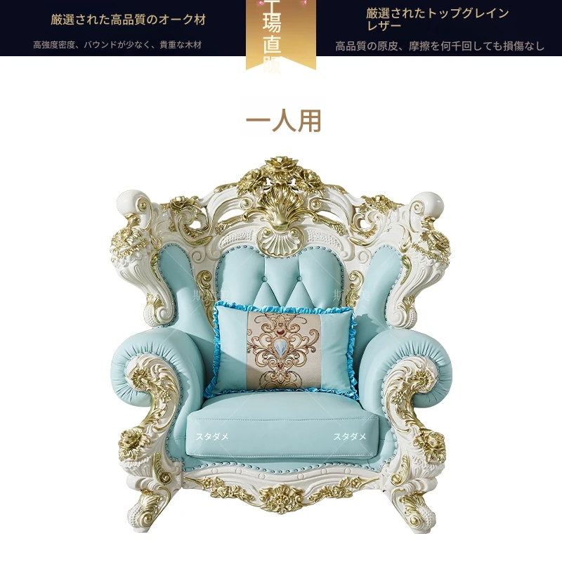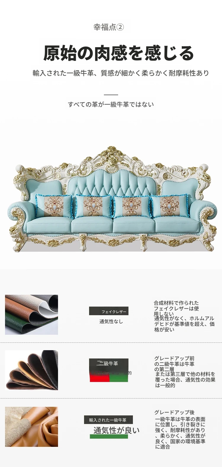 ラグジュアリーな欧州スタイルの別荘ソファセット - 本革製、シャンパンゴールドの実木彫刻仕上げ、どんなサイズのお部屋にもぴったり!豪華なリビング空間を演出します。