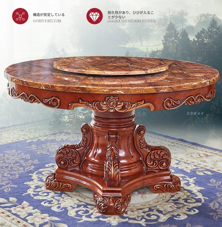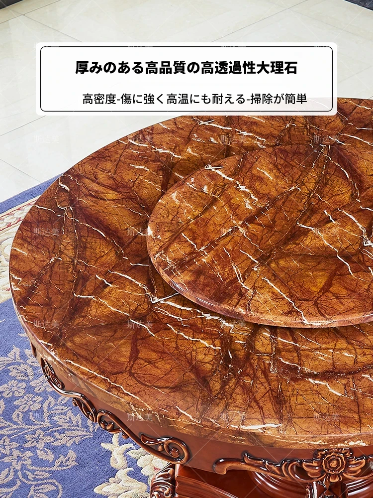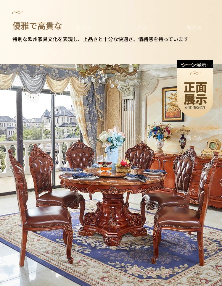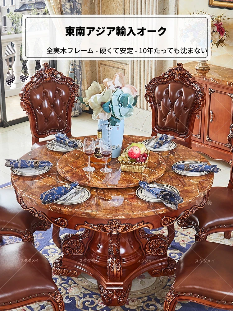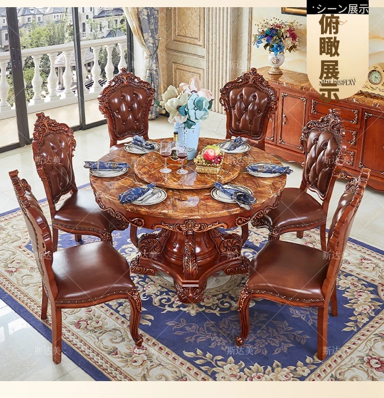 欧風全実木のレトロダイニングテーブルセット - 電動火鍋機能付き、回転式大理石テーブル&椅子のコンビネーションで、家族や友人との特別な食事を演出します!