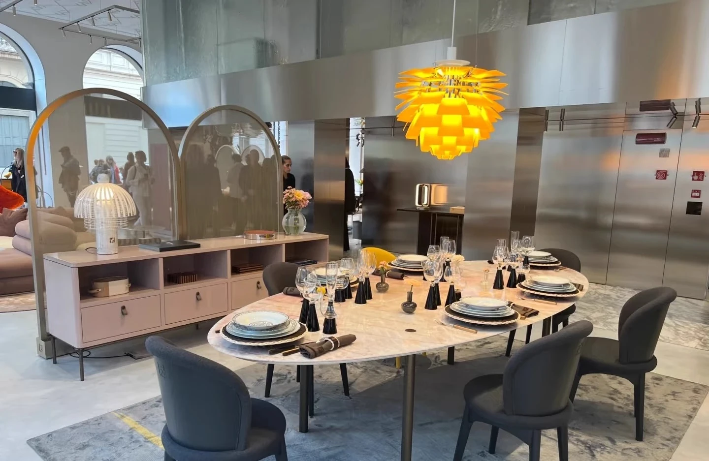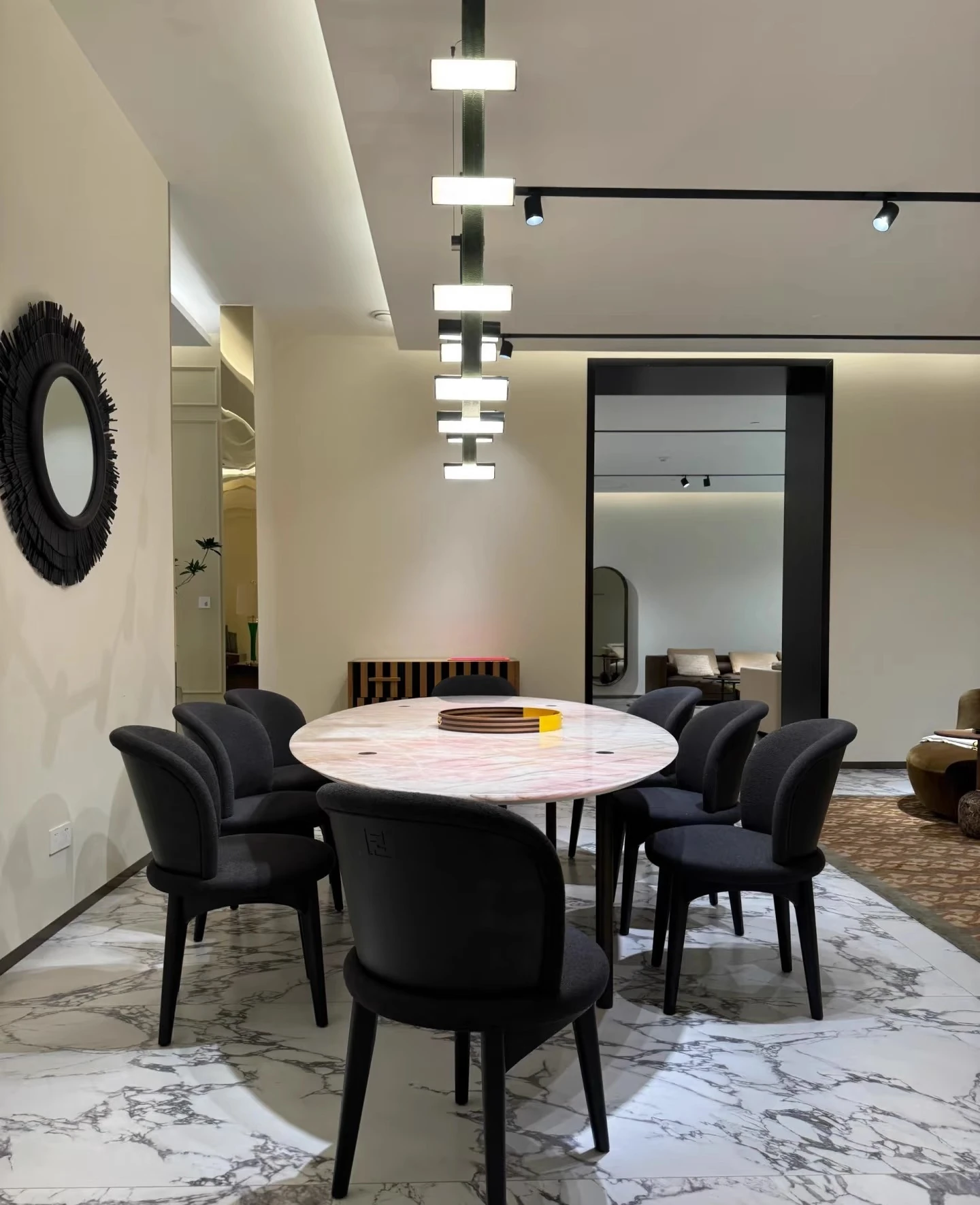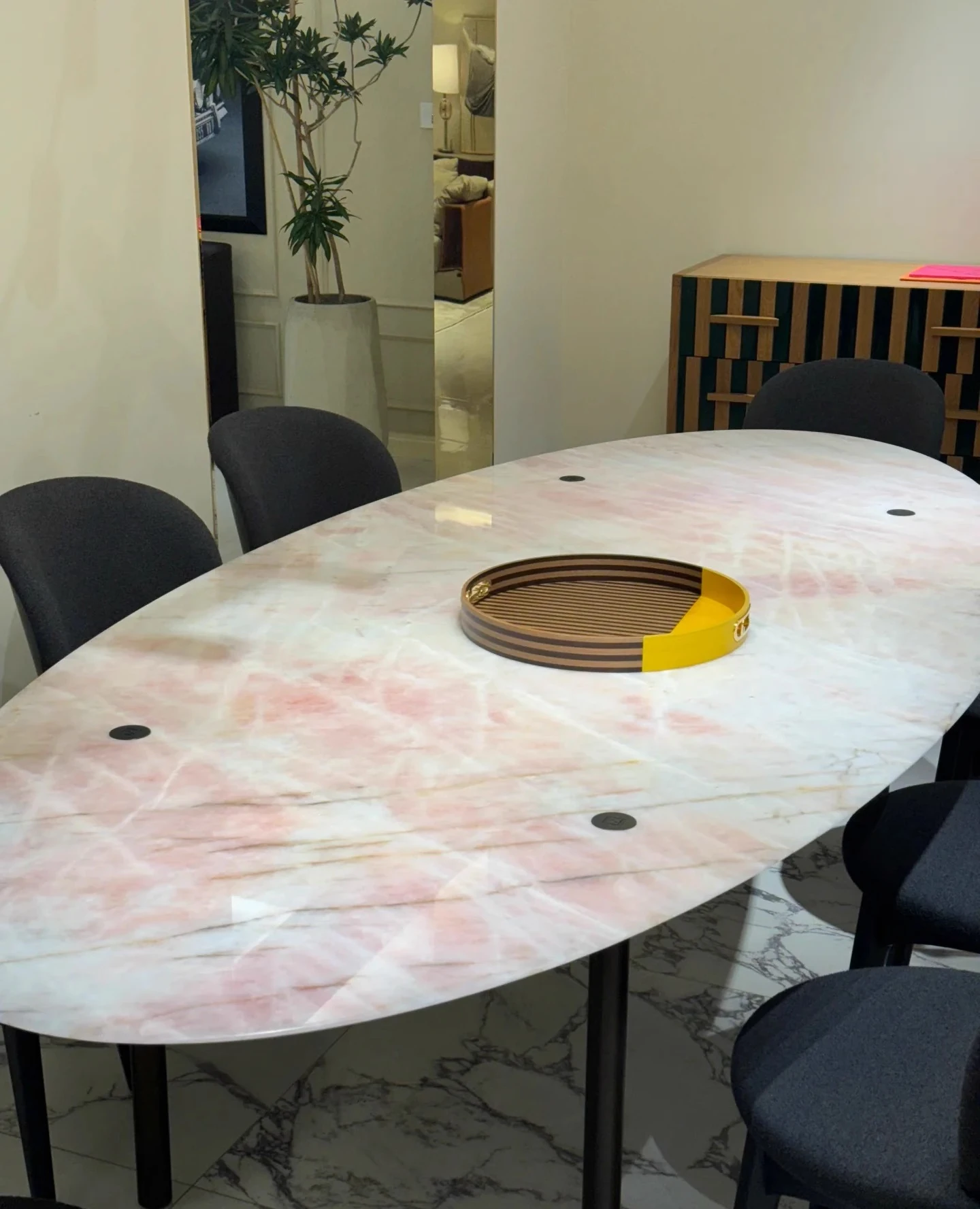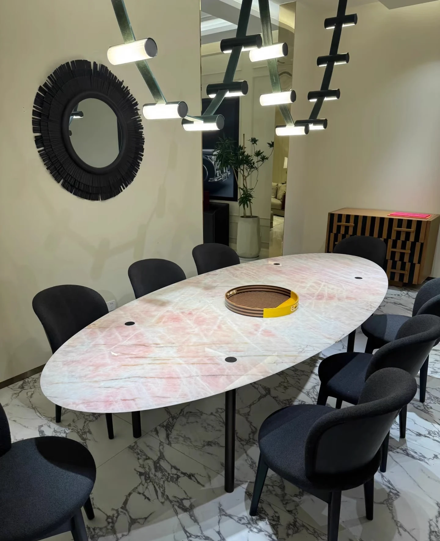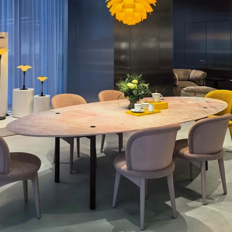アーティストブランドFendiのトト粉色大理石エラプス型ダイニングテーブル - フレインイスタイルのロングテーブルで、洗練された美しさと快適な食事体験をお楽しみください。