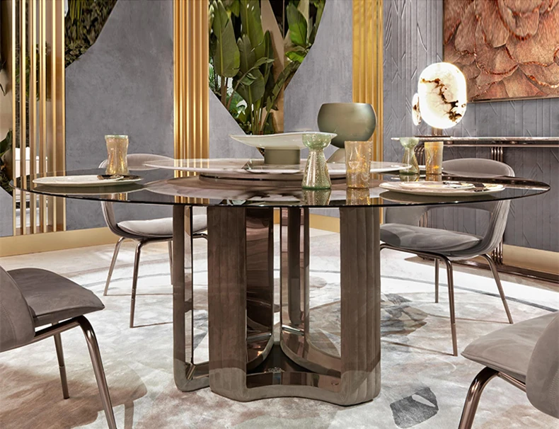 イタリアンラグジュアリー現代ダイニングテーブルセット|高級ヴィラや香港スタイルの家庭にぴったり!天然大理石のラウンドテーブルで、優雅な食事体験を実現。おしゃれで洗練された空間を演出します!