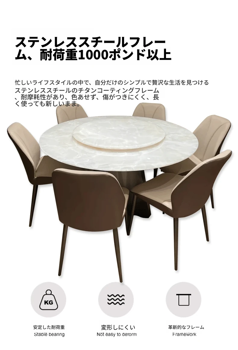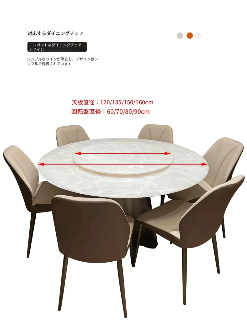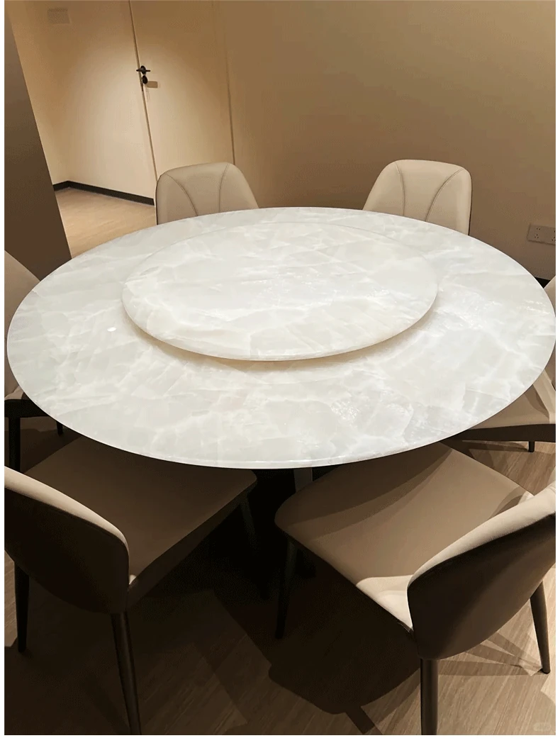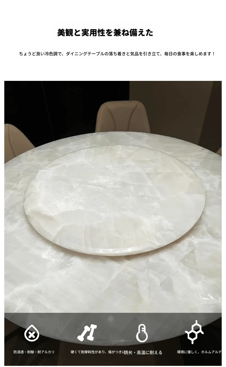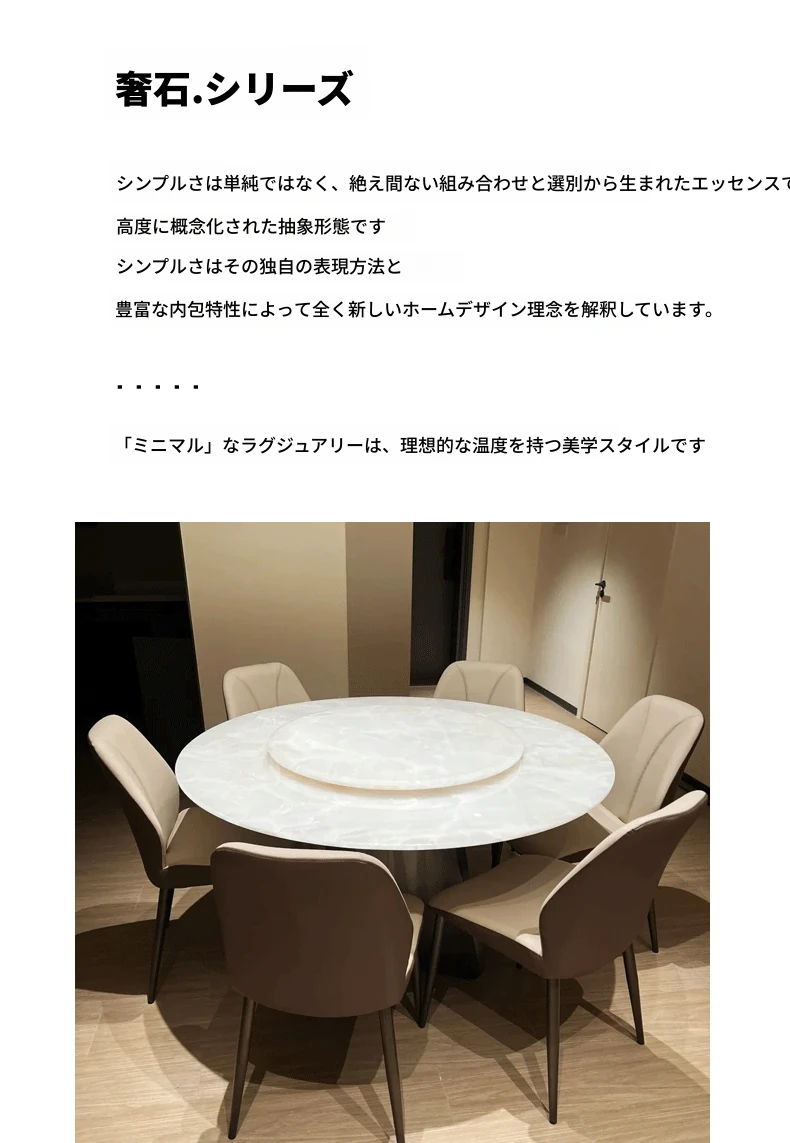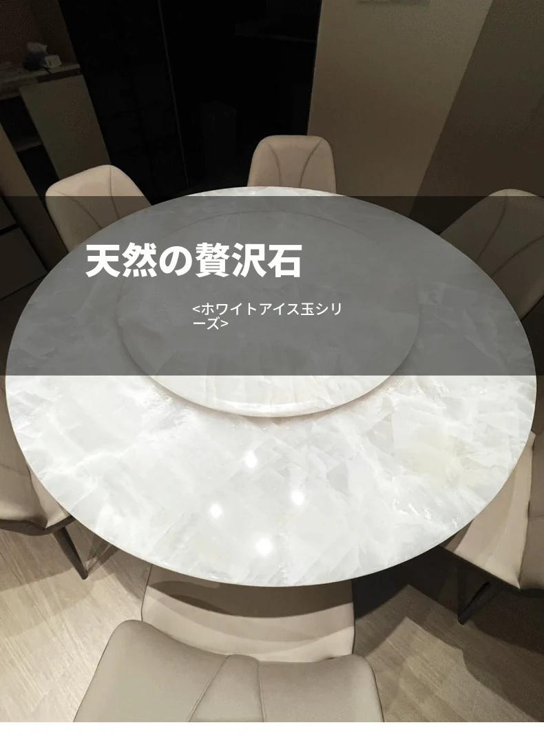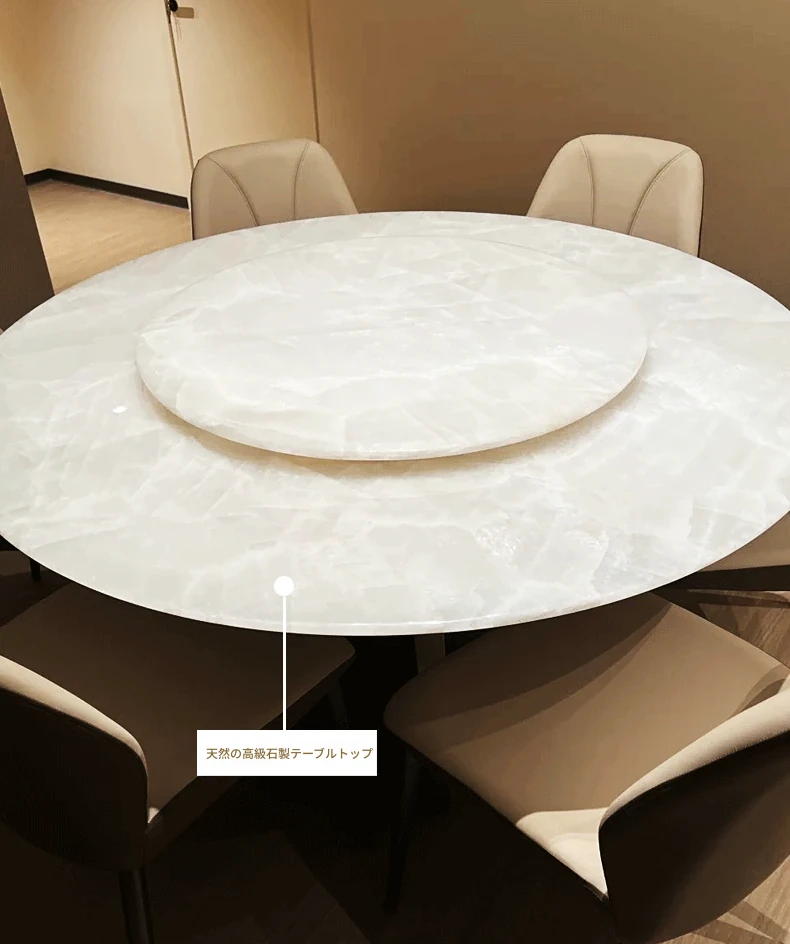 イタリアンラグジュアリー 天然大理石 ホワイトクリスタルダイニングテーブル 高級別荘用 円形テーブル 回転盤付き ダイニングチェアセットで贅沢な食事体験を!