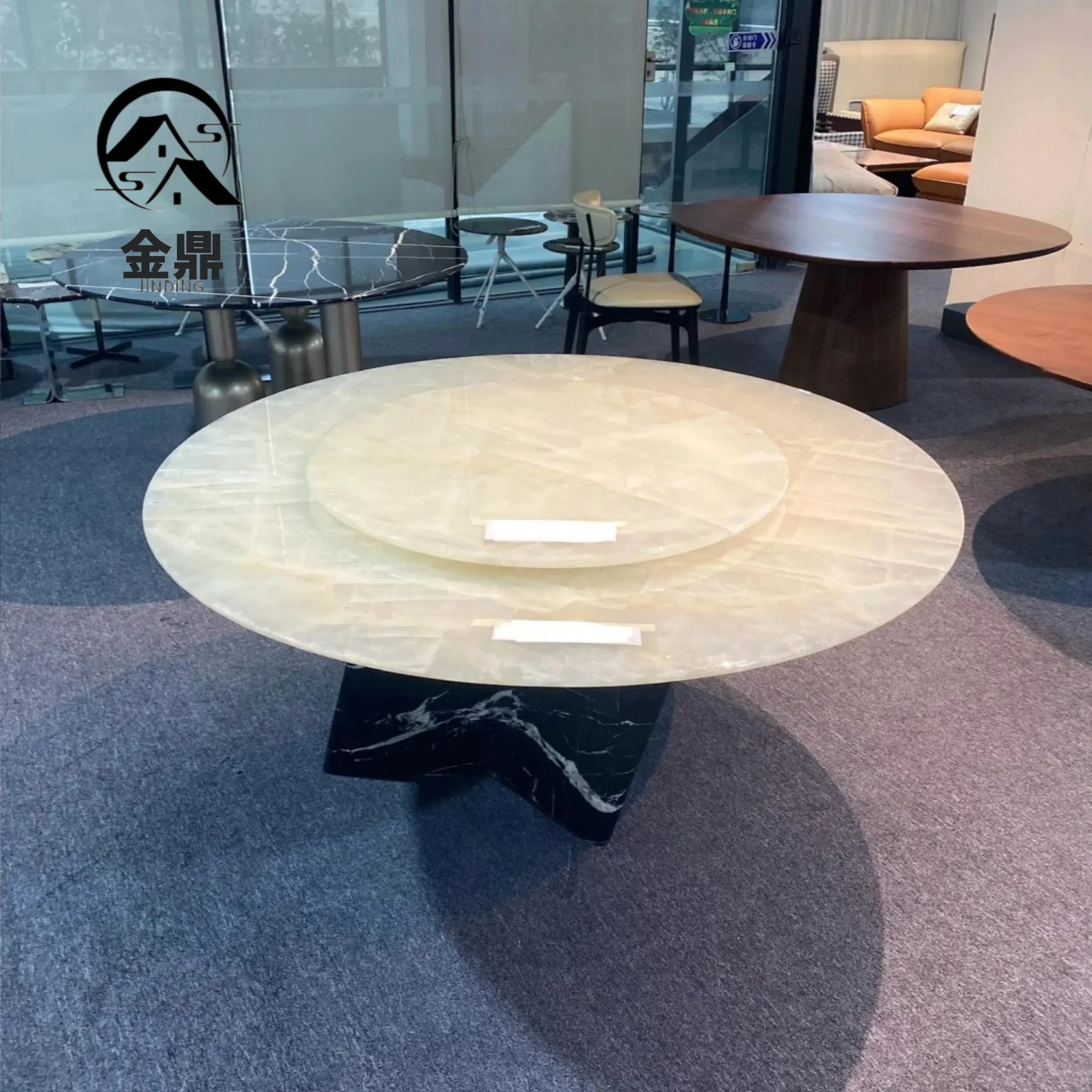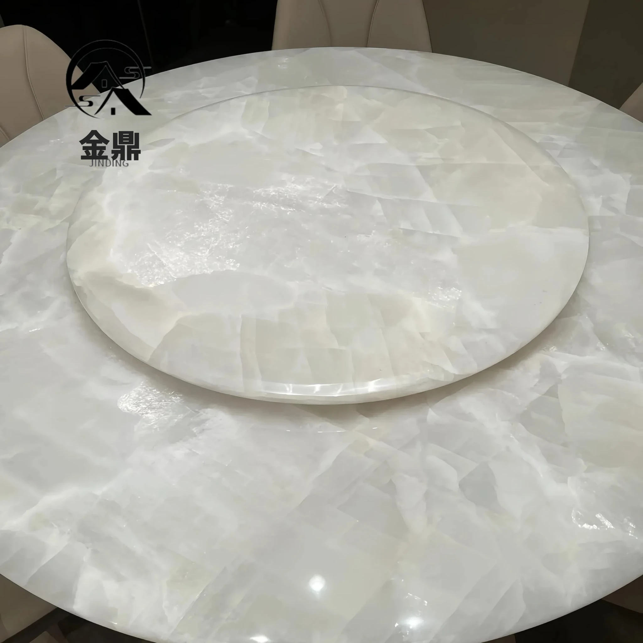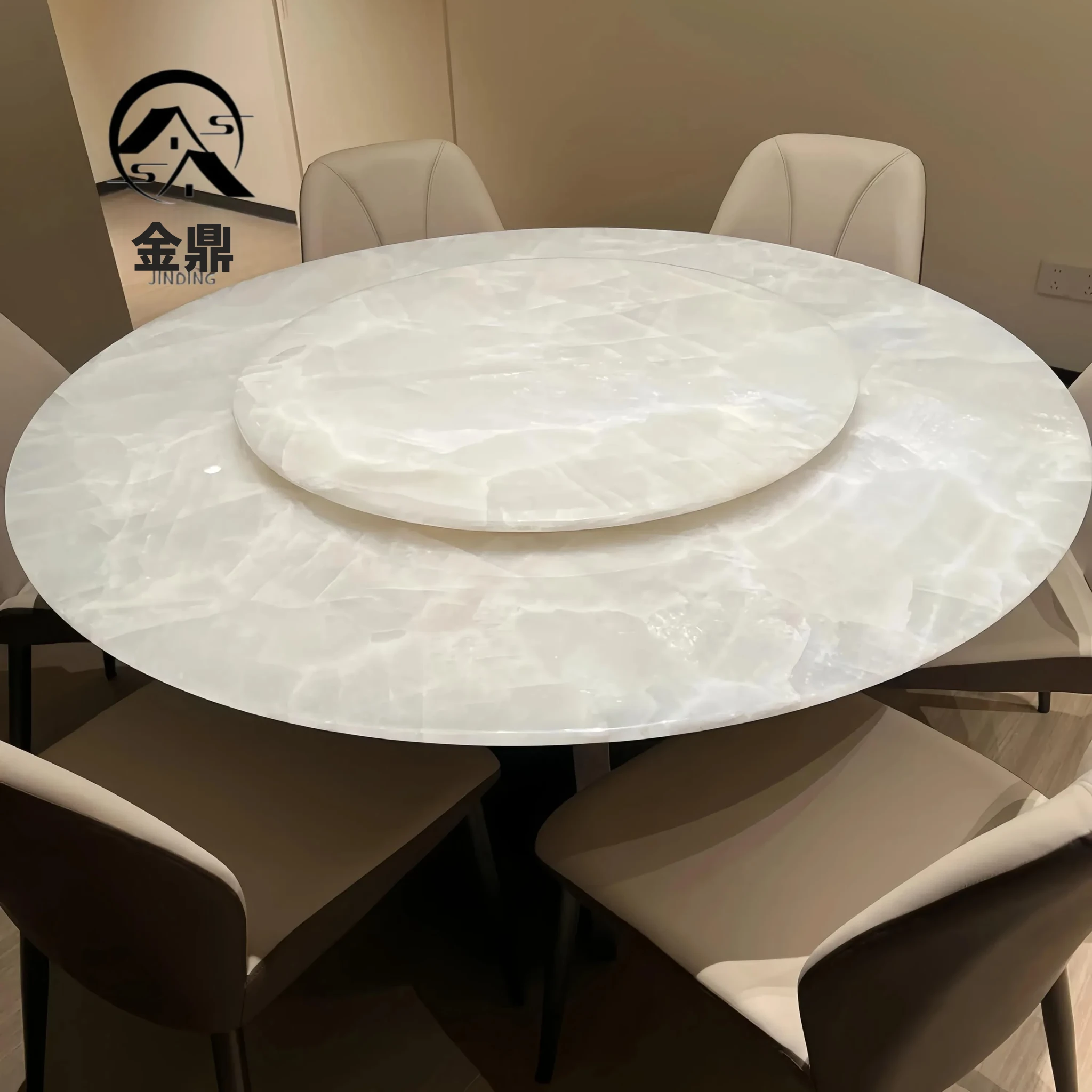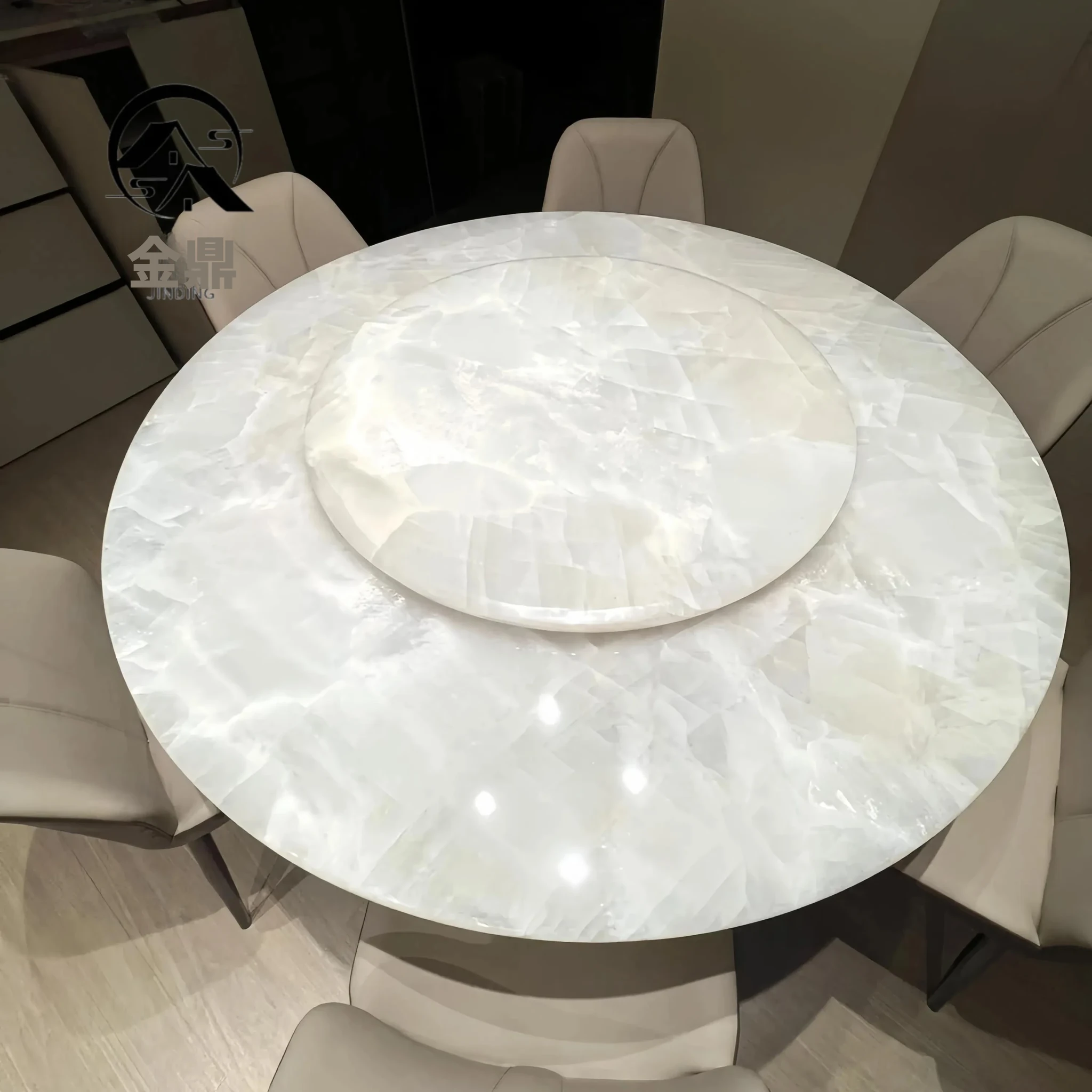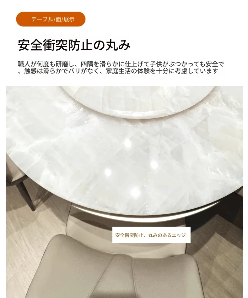 イタリアンラグジュアリー 天然大理石 ホワイトクリスタルダイニングテーブル 高級別荘用 円形テーブル 回転盤付き ダイニングチェアセットで贅沢な食事体験を!