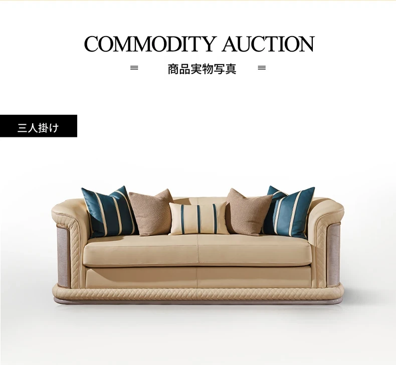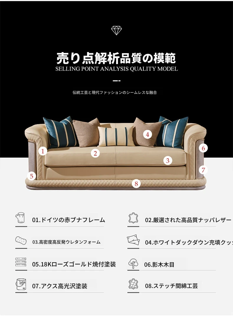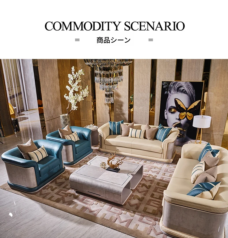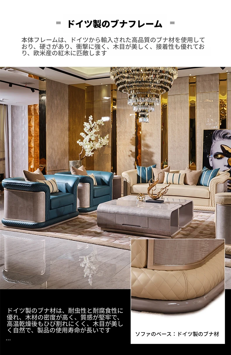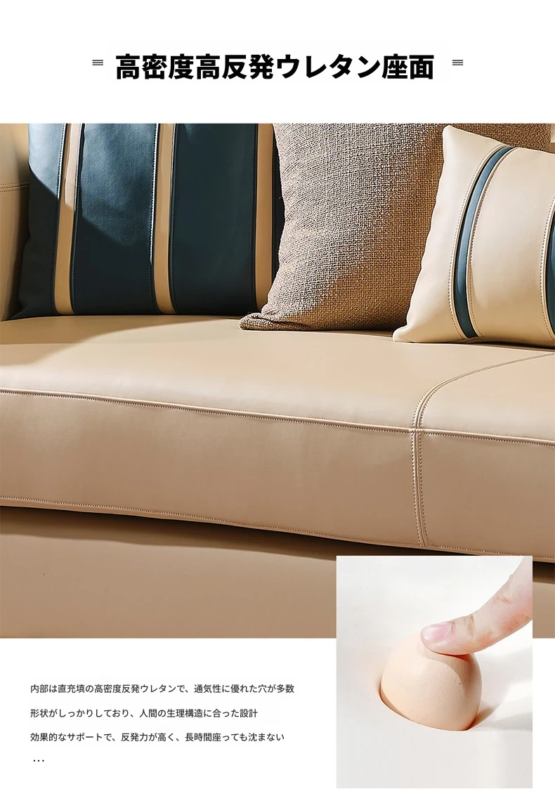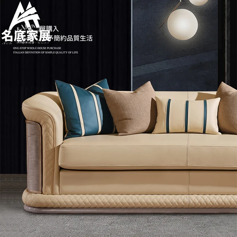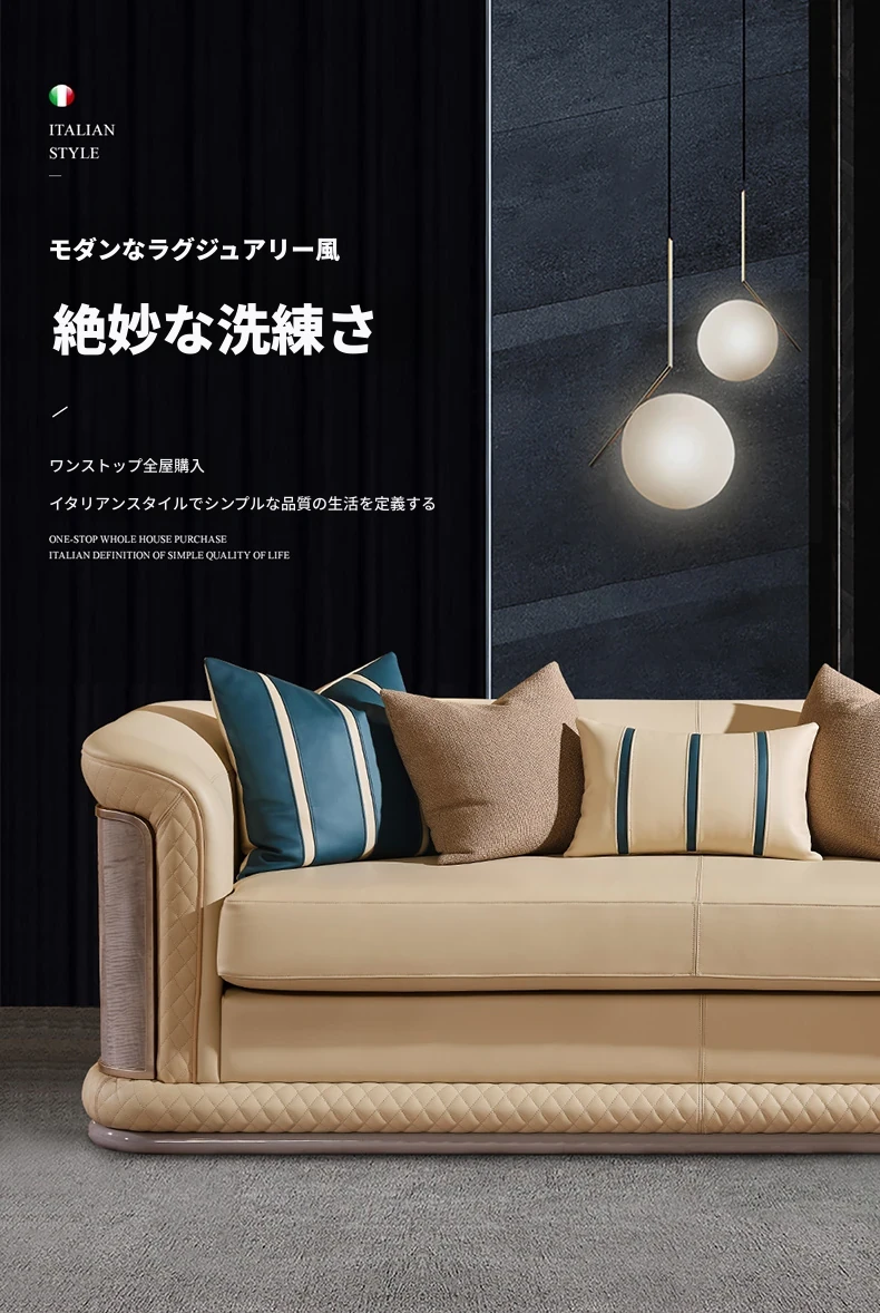 イタリア製ラグジュアリー本革ソファセット - モダンでシンプルなデザイン、豪華なヴィラのリビングにぴったり。全室に調和する高品質な無垢材家具で、快適な空間を演出します。
