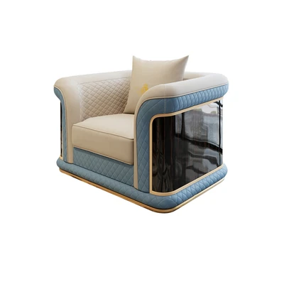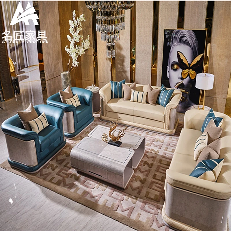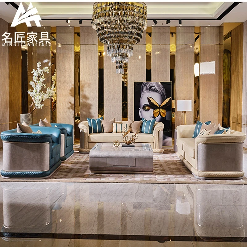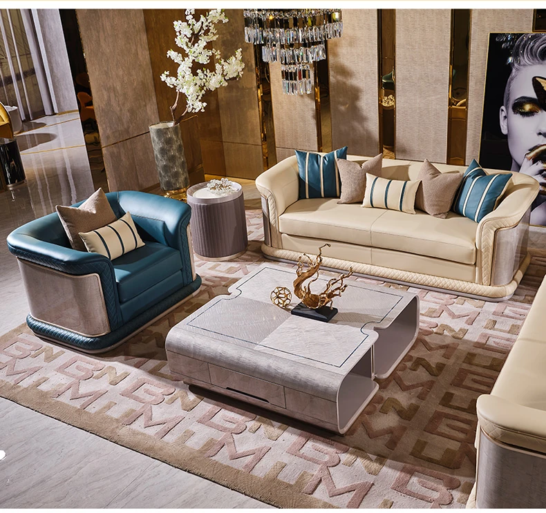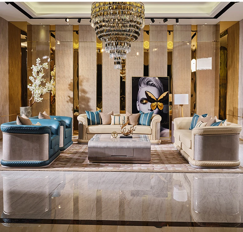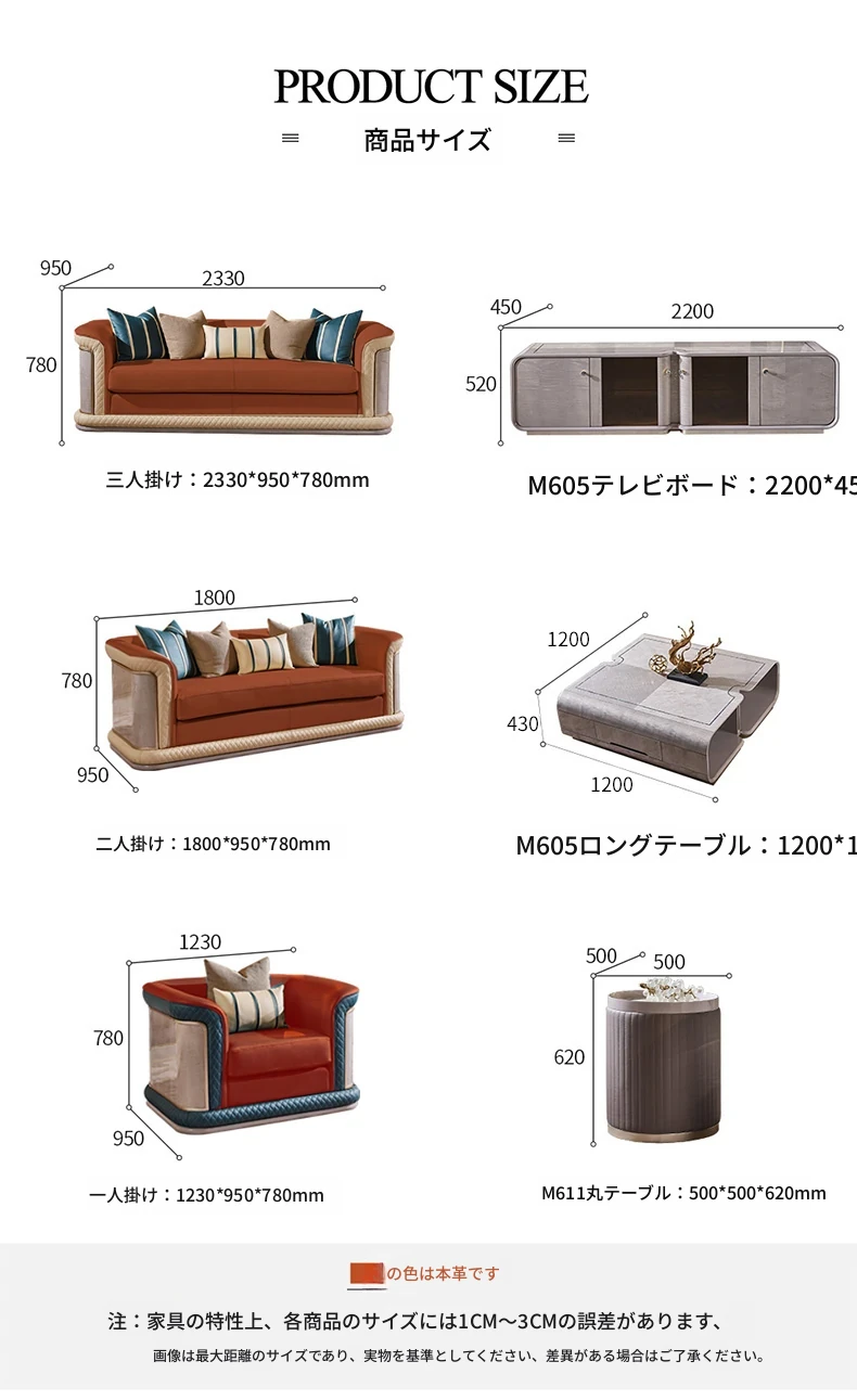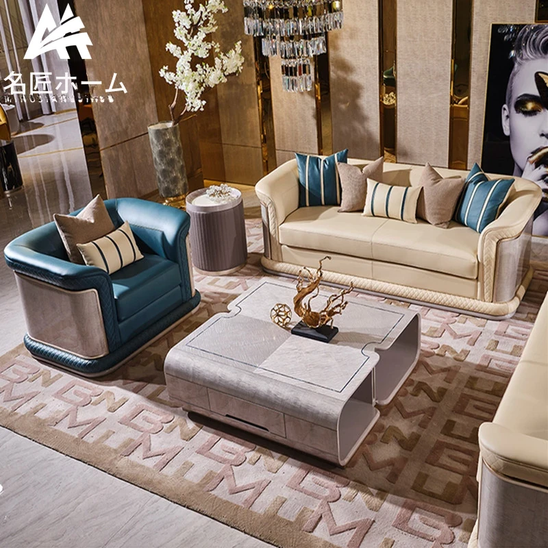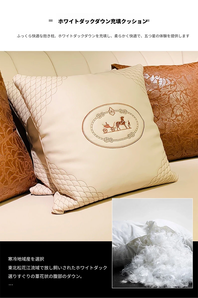 イタリア製ラグジュアリー本革ソファセット - モダンでシンプルなデザイン、豪華なヴィラのリビングにぴったり。全室に調和する高品質な無垢材家具で、快適な空間を演出します。