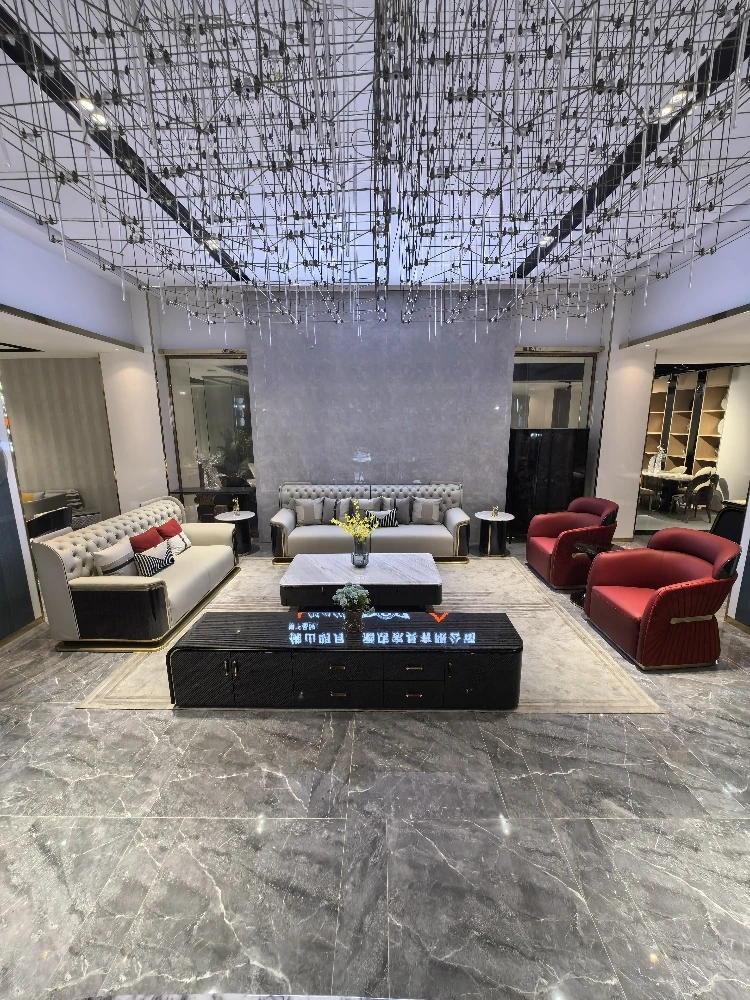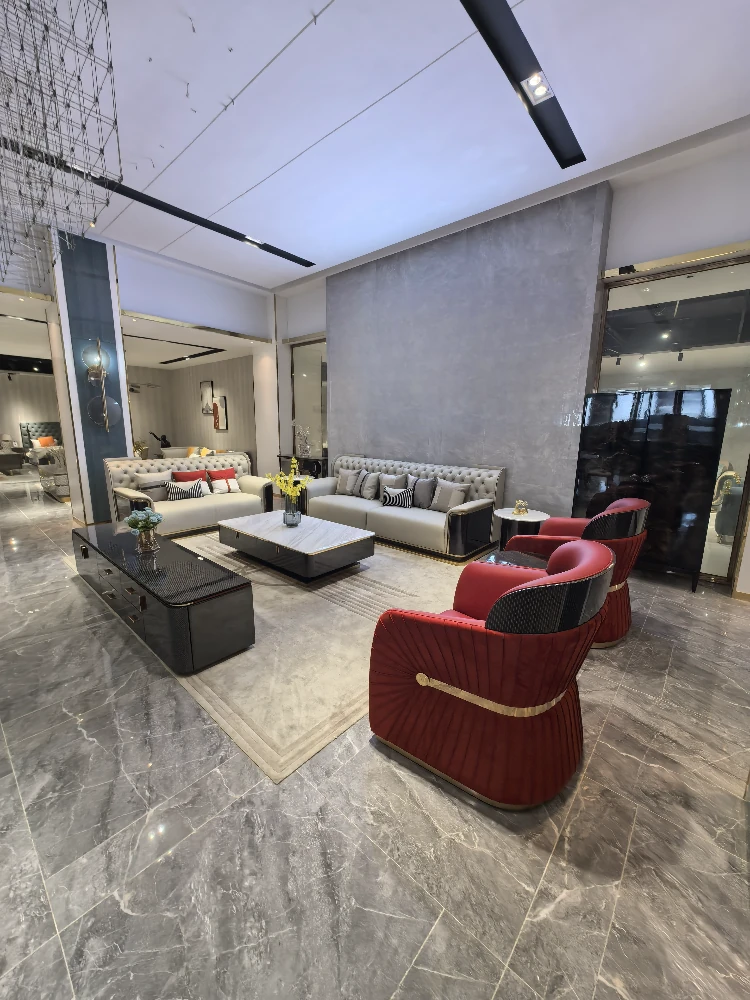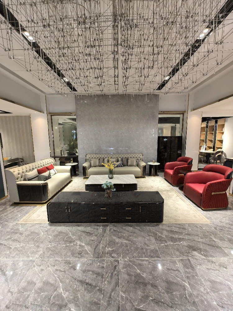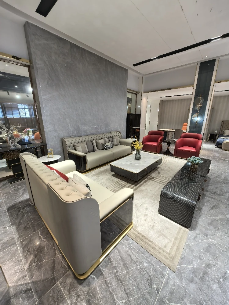 イタリア製ラグジュアリー本革ソファセット - モダンでシンプルなデザイン、豪華なヴィラのリビングにぴったり。全室に調和する高品質な無垢材家具で、快適な空間を演出します。