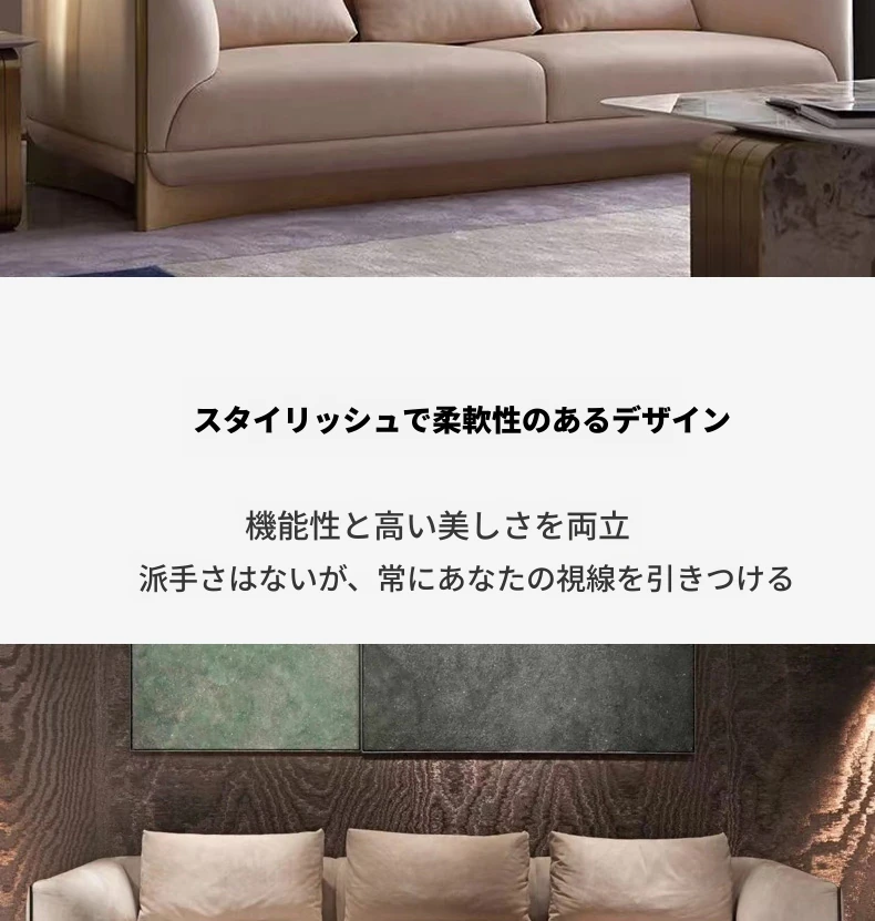 イタリア製ラグジュアリー本革ソファセット - モダンでシンプルなデザイン、豪華なヴィラのリビングにぴったり。全室に調和する高品質な無垢材家具で、快適な空間を演出します。