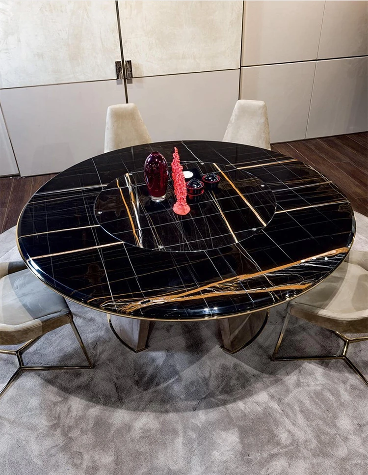 豪華な大理石ダイニングテーブル - ヴィラにぴったり!回転式デザインで、イタリアンモダンな極簡スタイルの天然石製ラウンドテーブルセット。洗練された雰囲気を演出し、特別な食事のひとときを提供します。