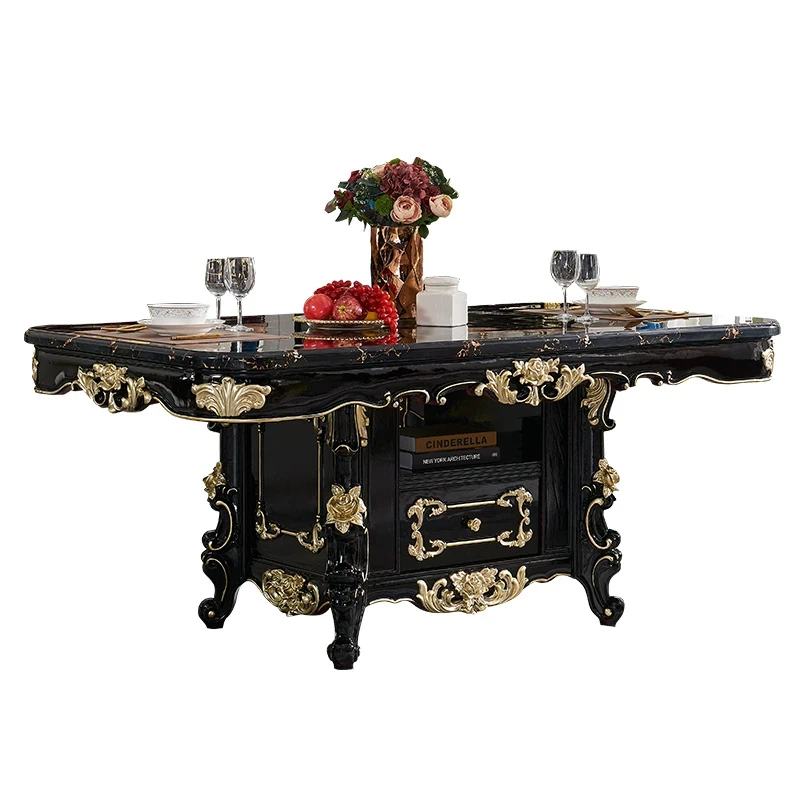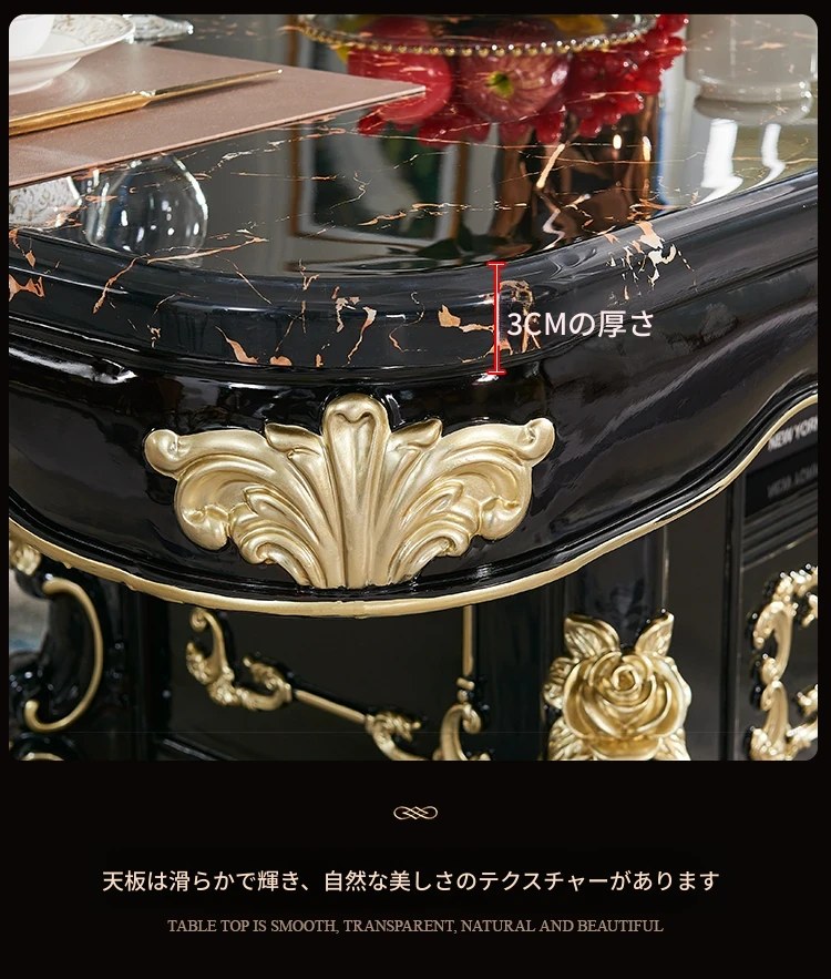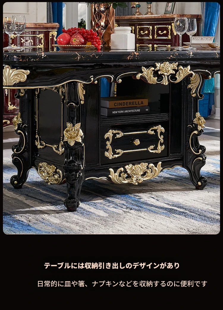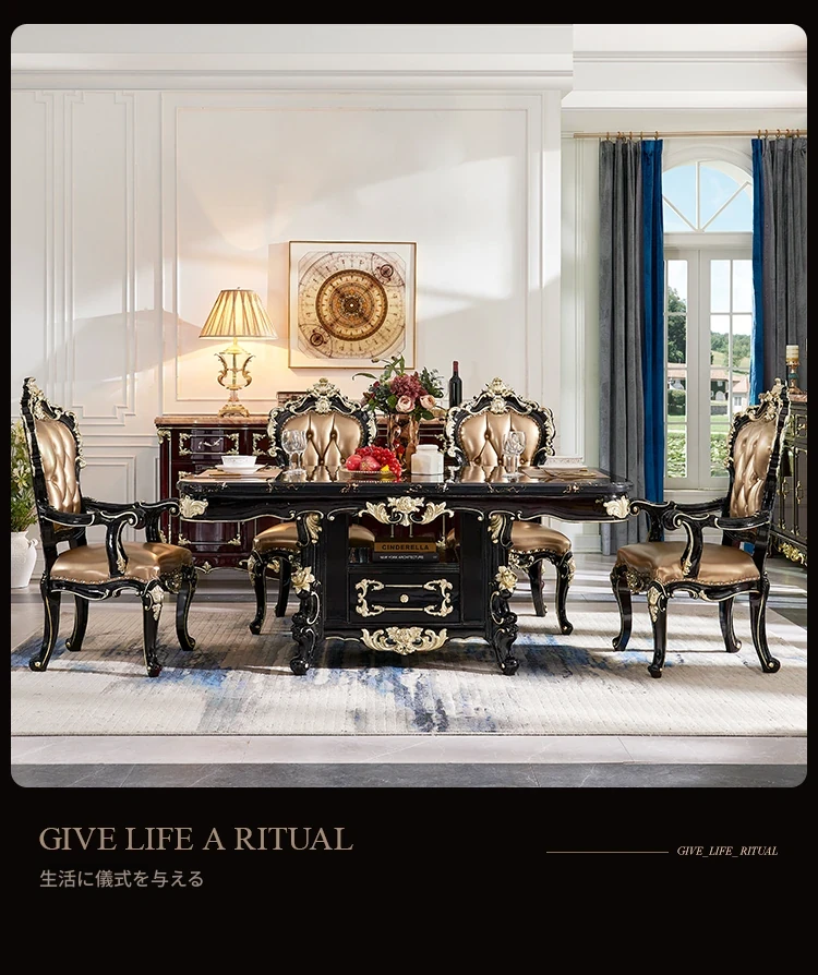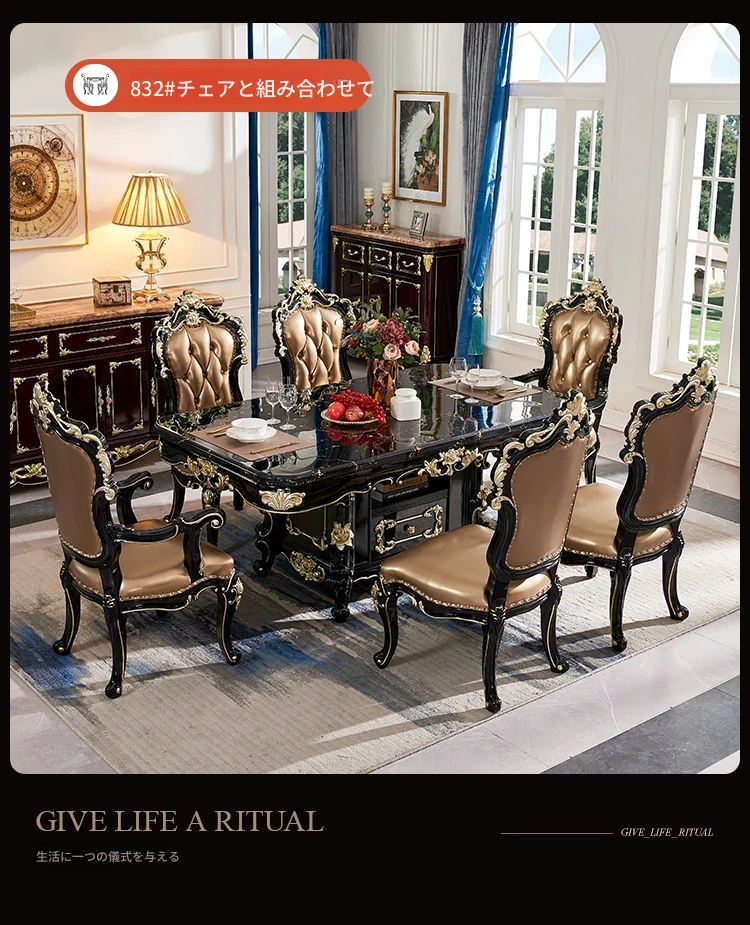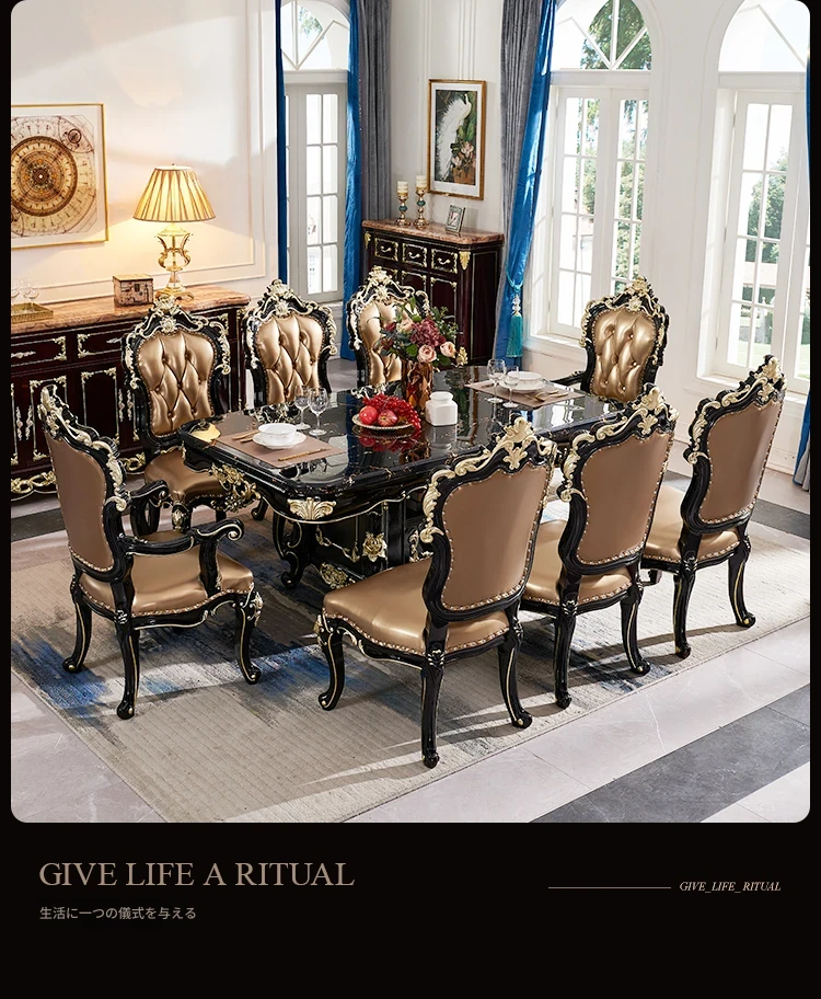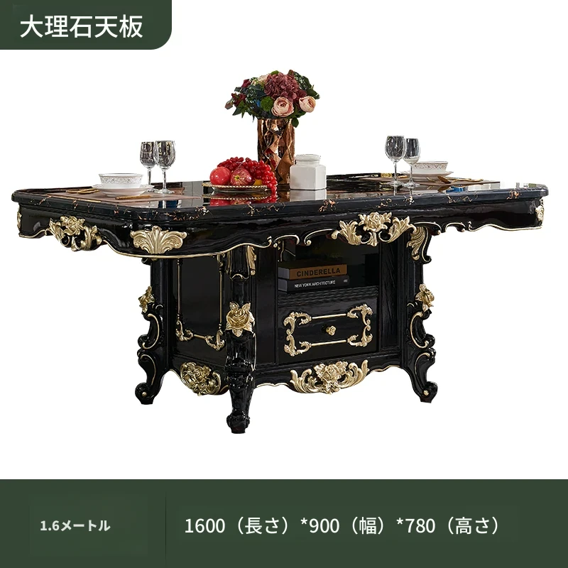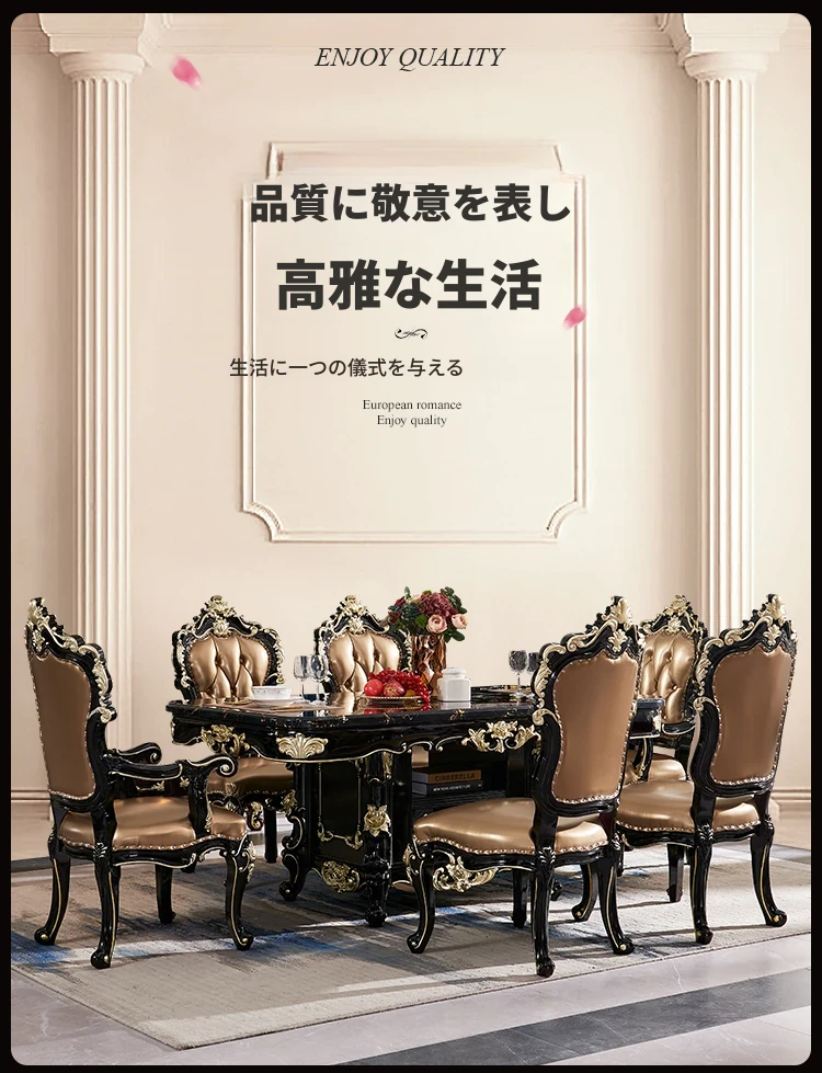 ラグジュアリーな欧式大理石ダイニングテーブル - ブラックエボニー色の全実木製ロングテーブル&チェアセット、洗練された長方形デザインで、優雅な食事空間を演出します。