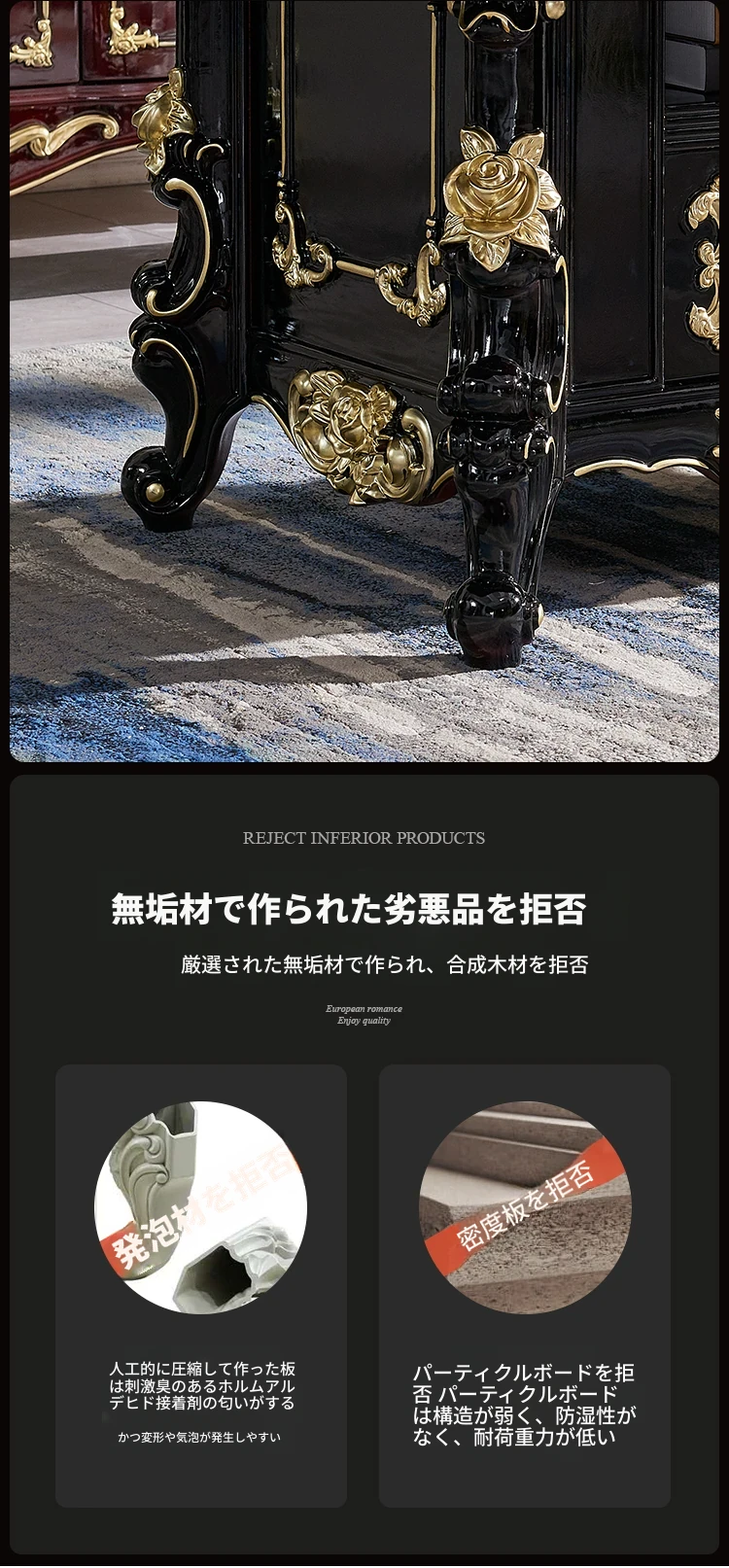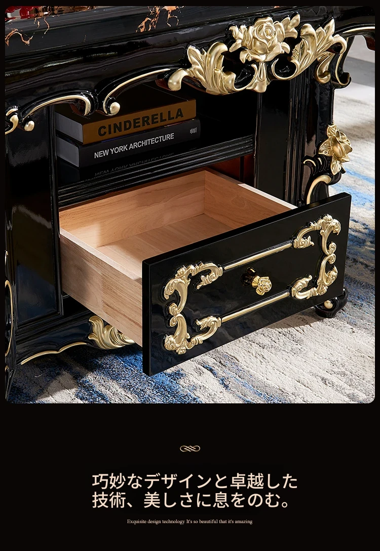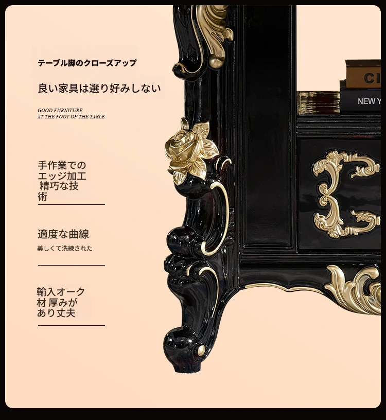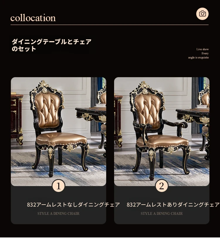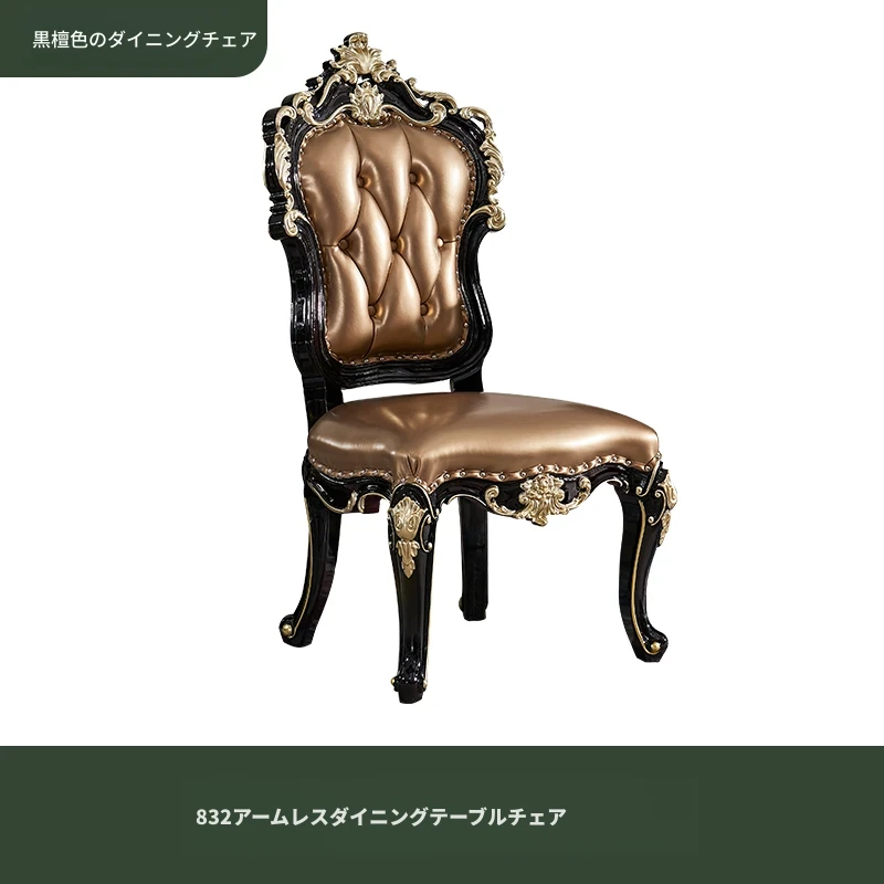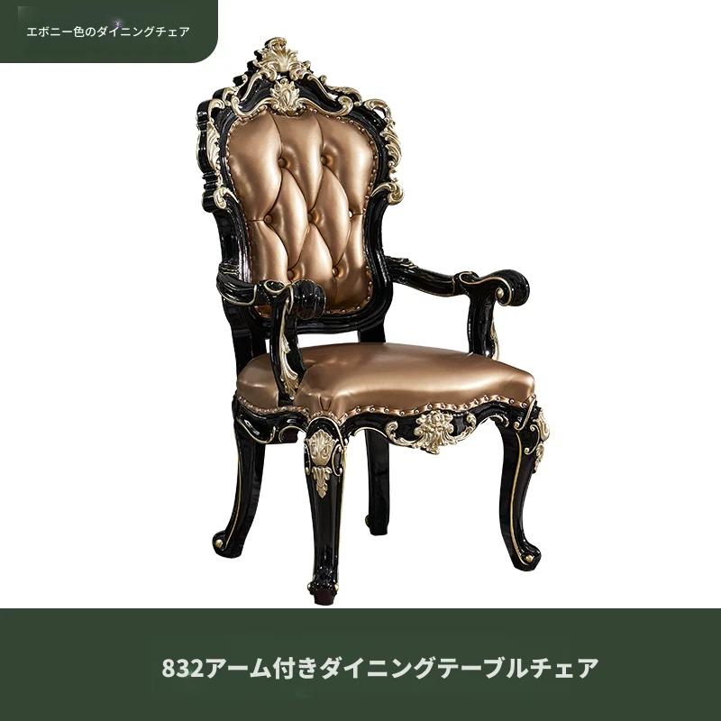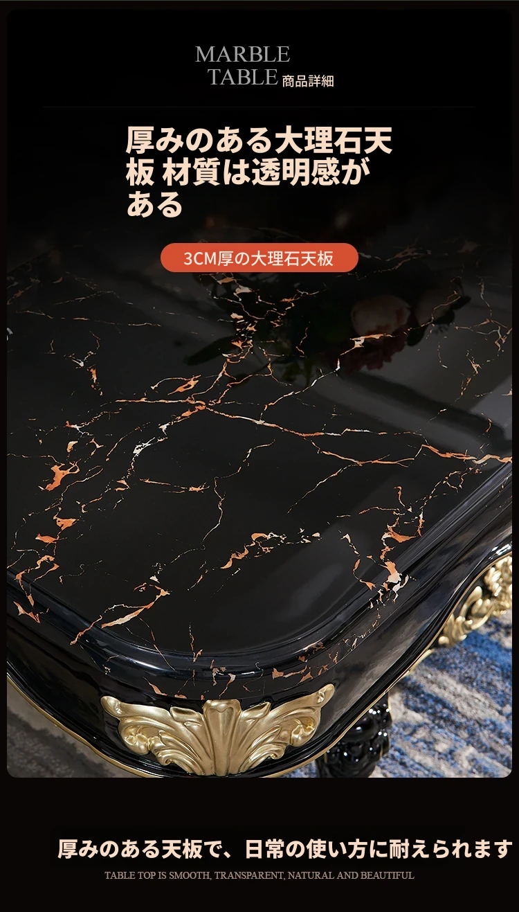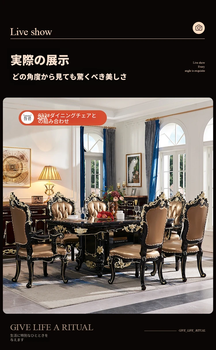 ラグジュアリーな欧式大理石ダイニングテーブル - ブラックエボニー色の全実木製ロングテーブル&チェアセット、洗練された長方形デザインで、優雅な食事空間を演出します。