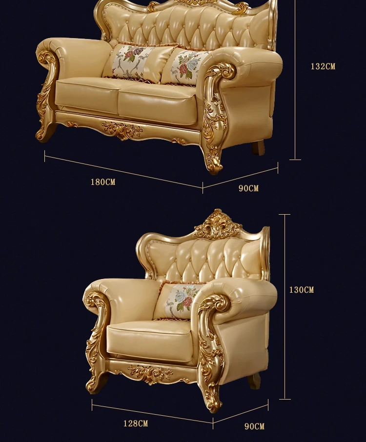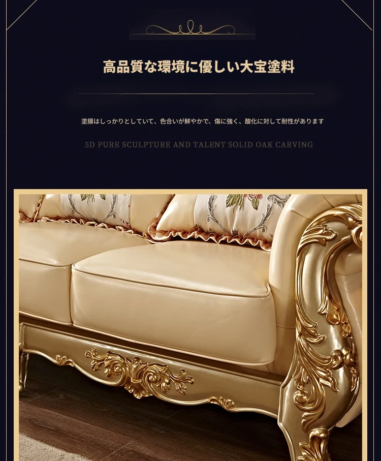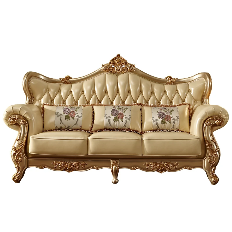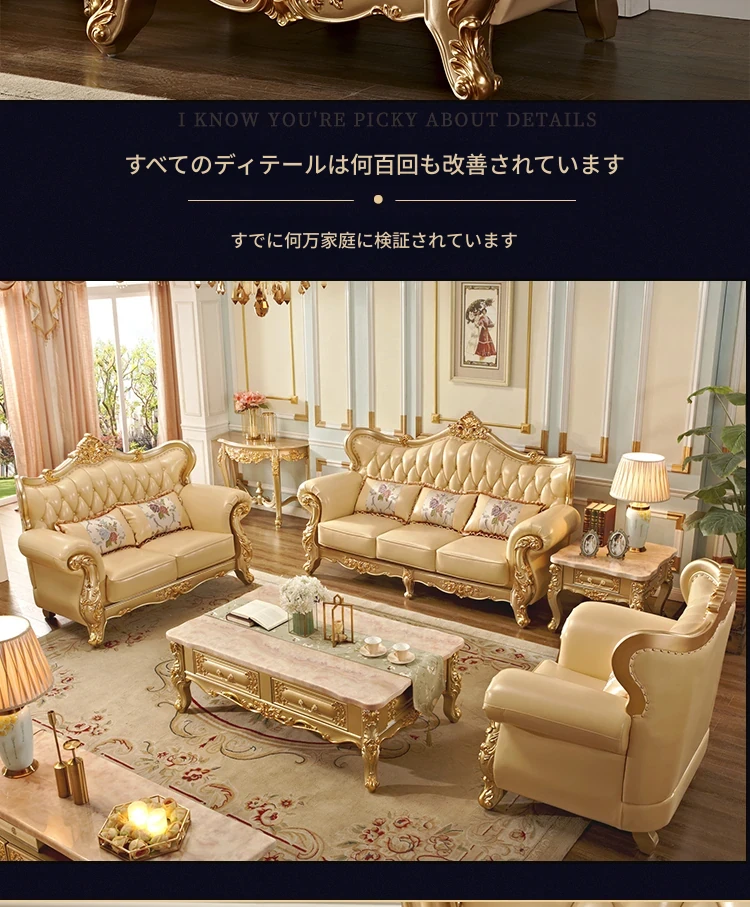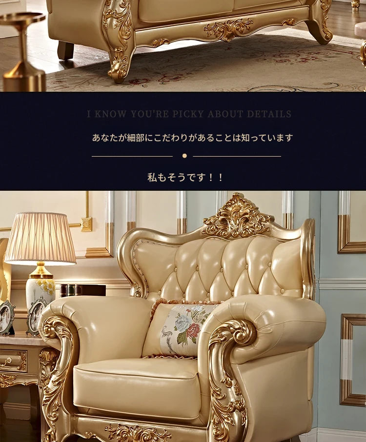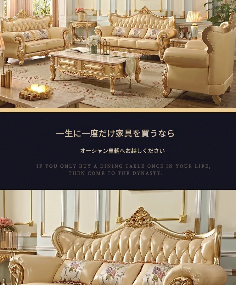 ラグジュアリーな欧州スタイルの別荘ソファセット - 本革製、シャンパンゴールドの実木彫刻仕上げ、どんなサイズのお部屋にもぴったり!豪華なリビング空間を演出します。