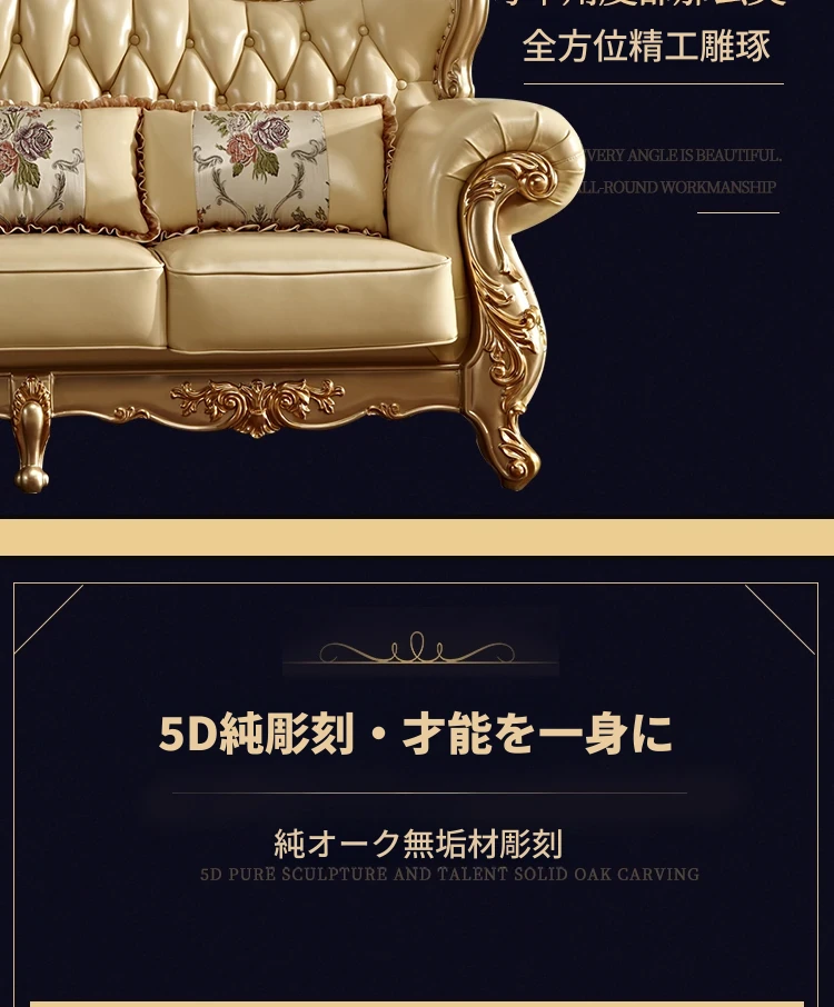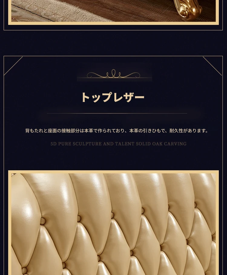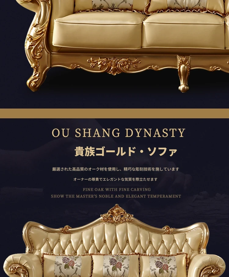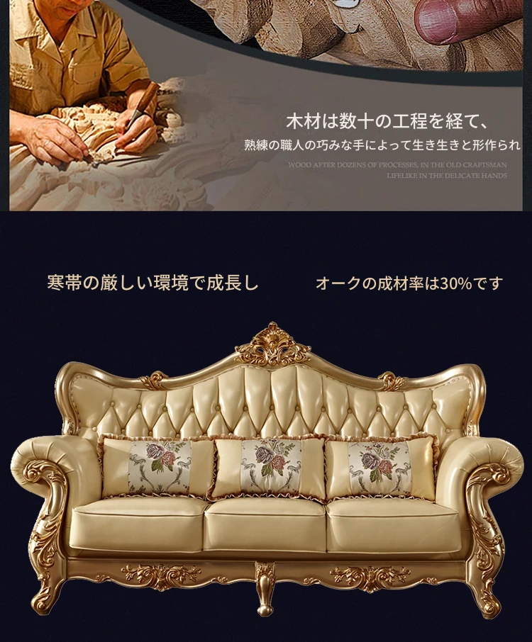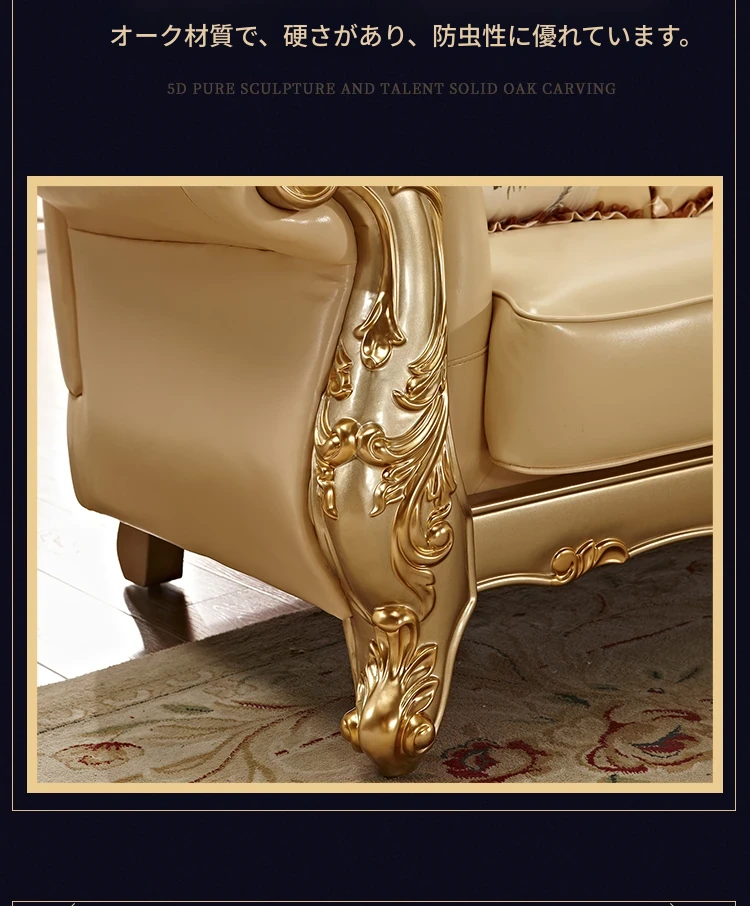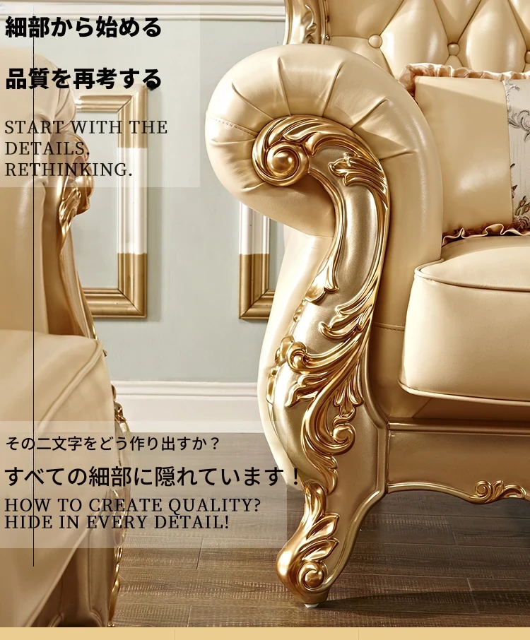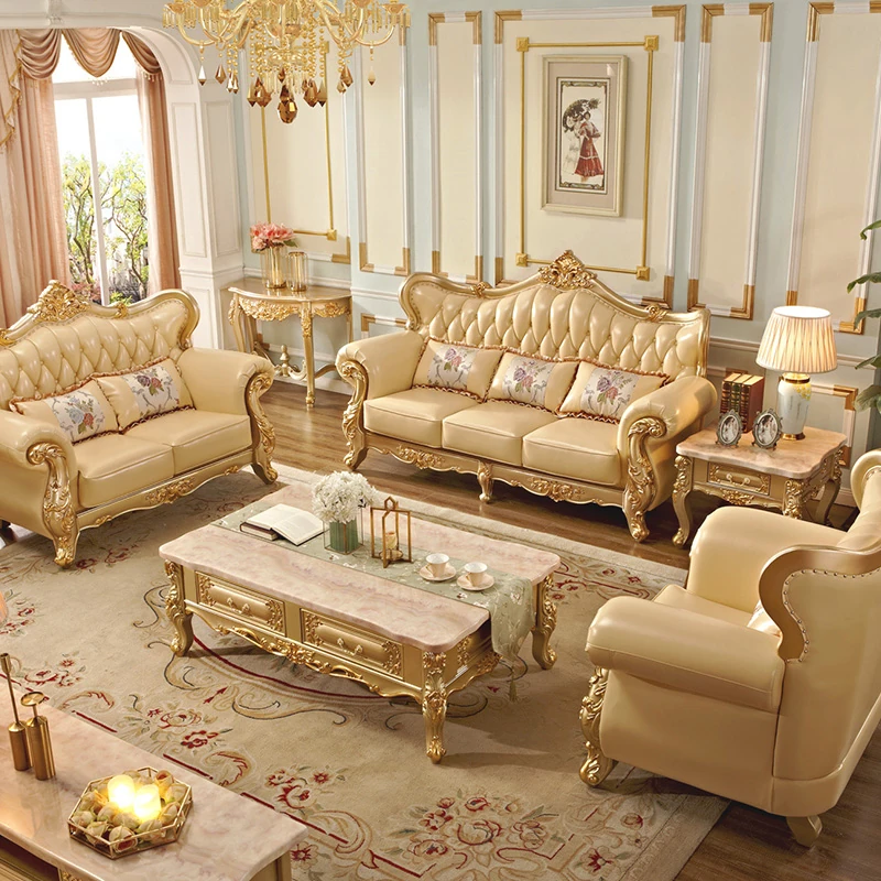 ラグジュアリーな欧州スタイルの別荘ソファセット - 本革製、シャンパンゴールドの実木彫刻仕上げ、どんなサイズのお部屋にもぴったり!豪華なリビング空間を演出します。