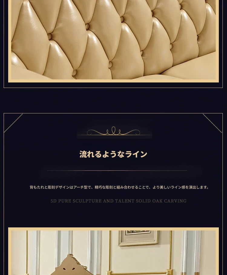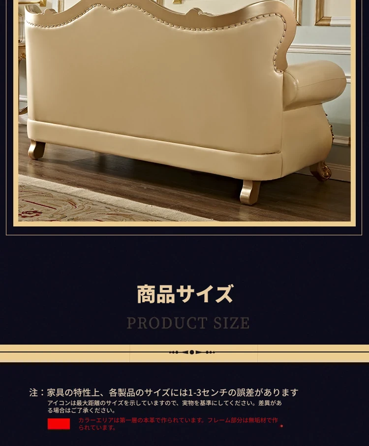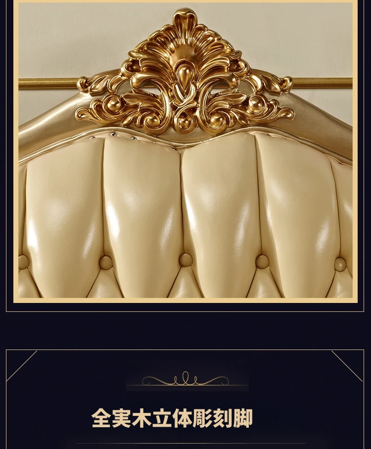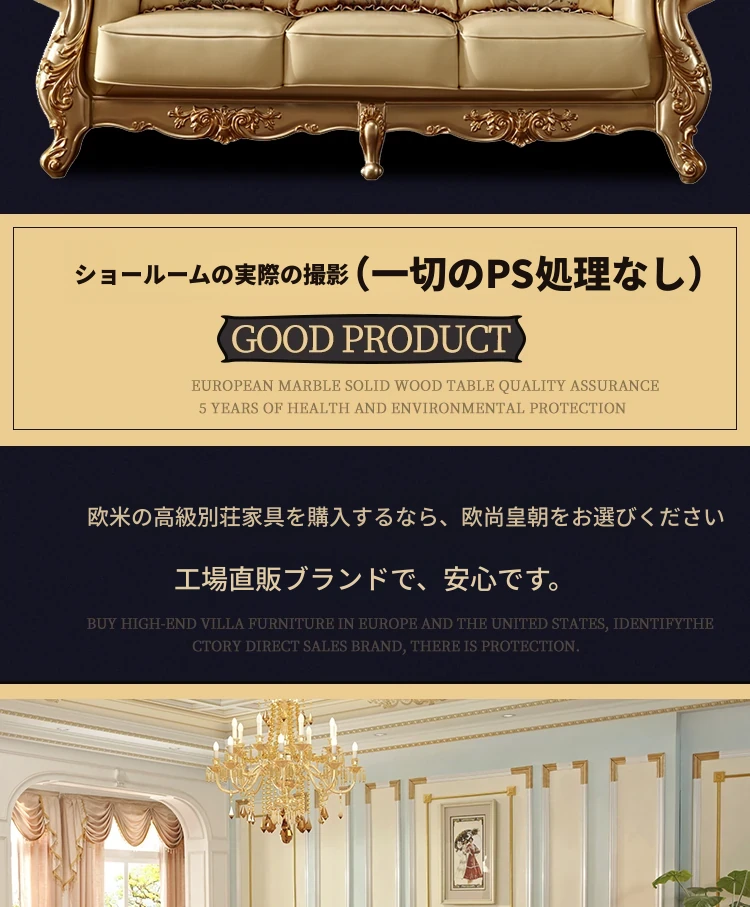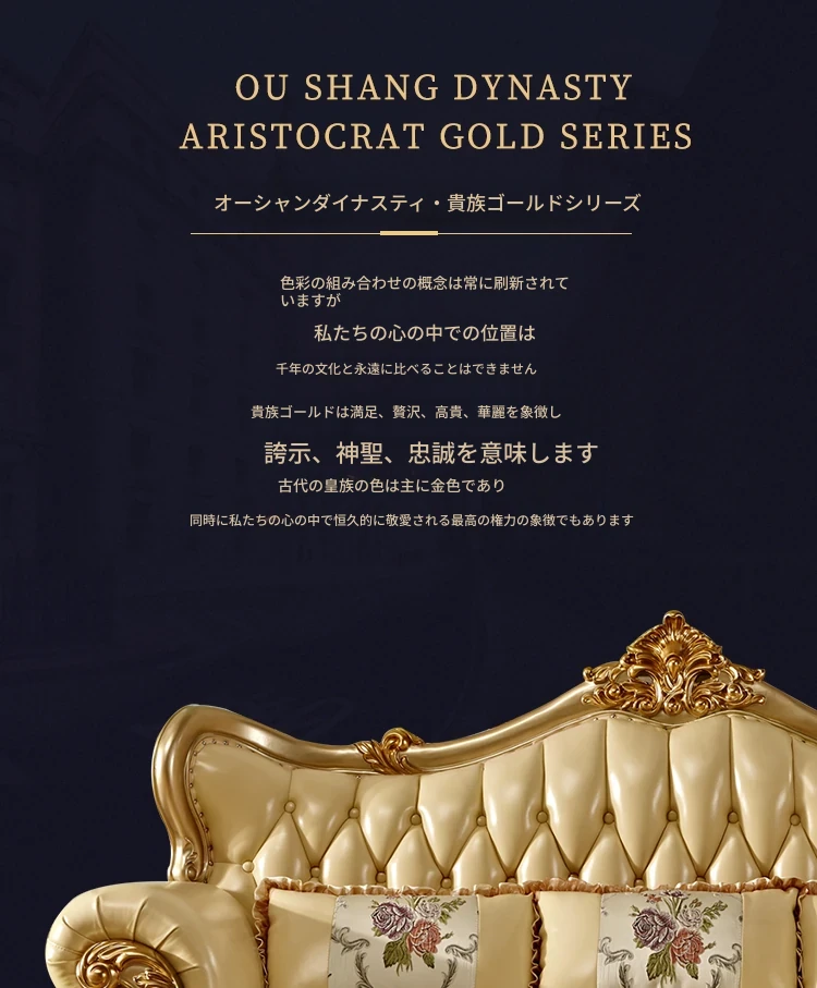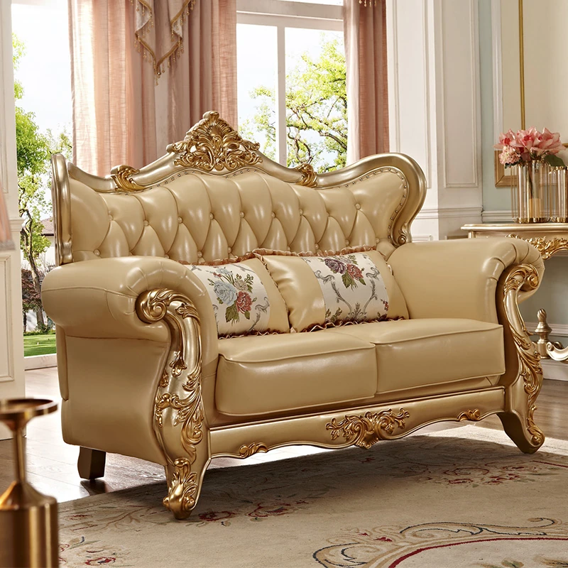 ラグジュアリーな欧州スタイルの別荘ソファセット - 本革製、シャンパンゴールドの実木彫刻仕上げ、どんなサイズのお部屋にもぴったり!豪華なリビング空間を演出します。