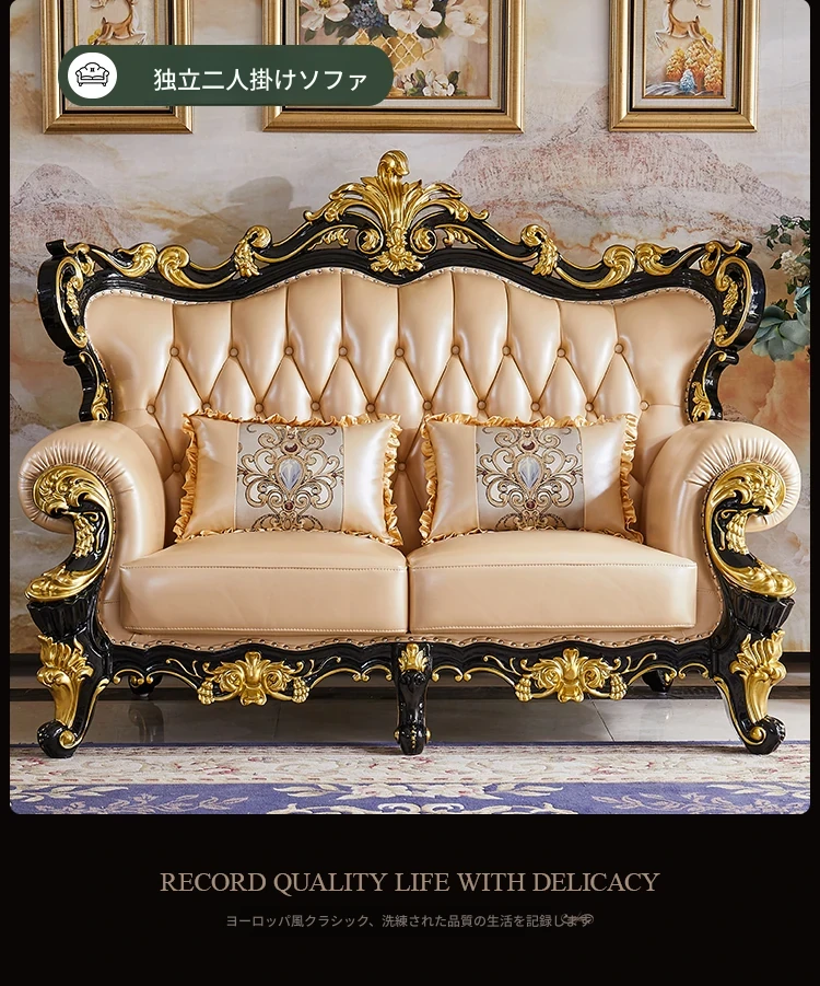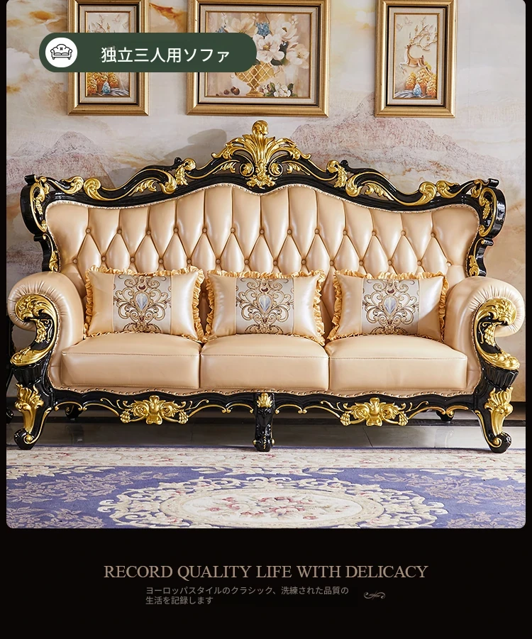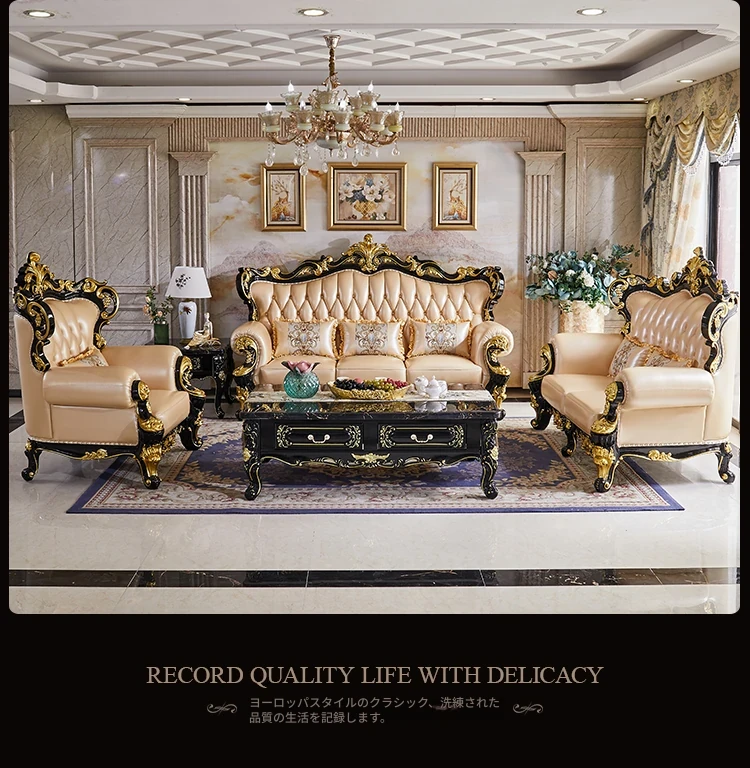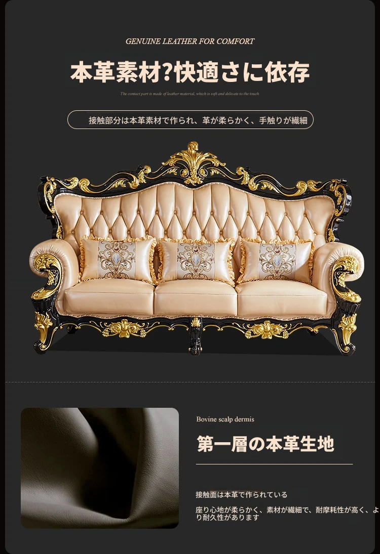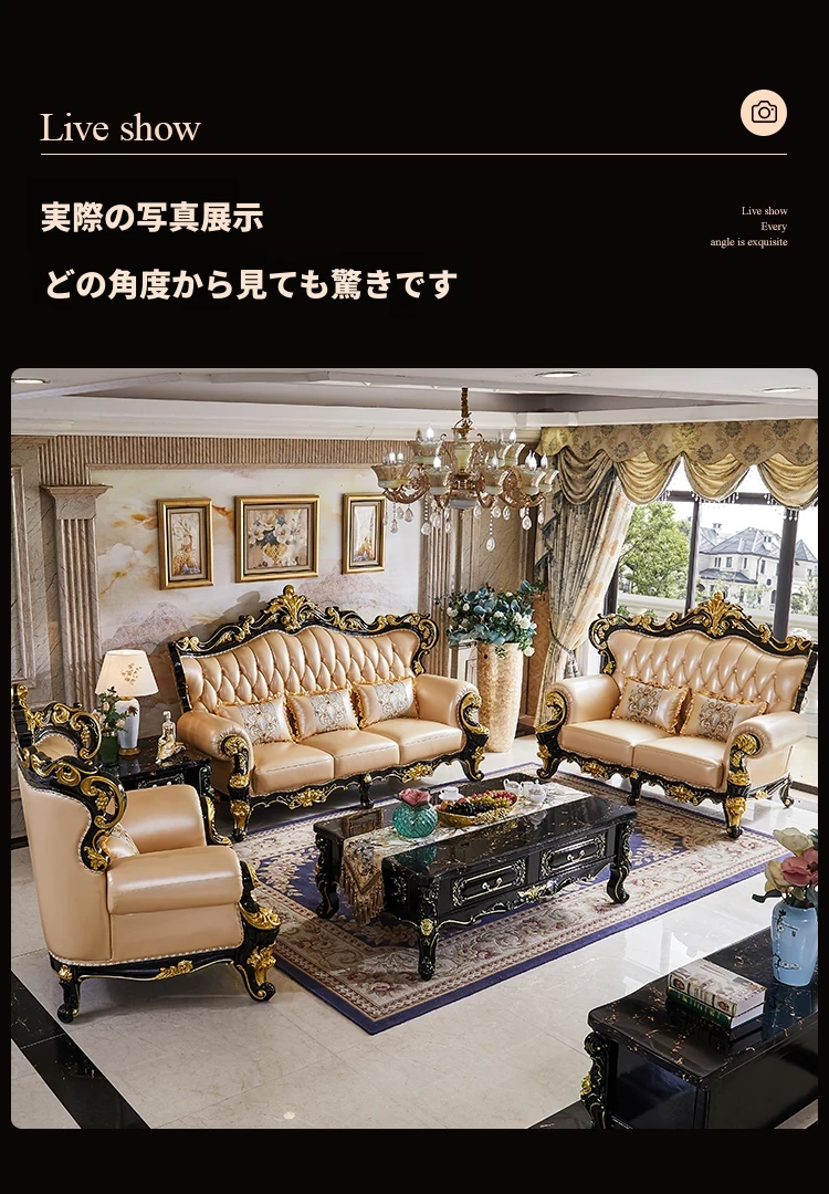 豪華なブラックエボニー色の欧州スタイルソファセット - 大型リビングにぴったりの高級真皮家具コンビネーション。優雅さと快適さを兼ね備えた贅沢な別荘の必需品!
