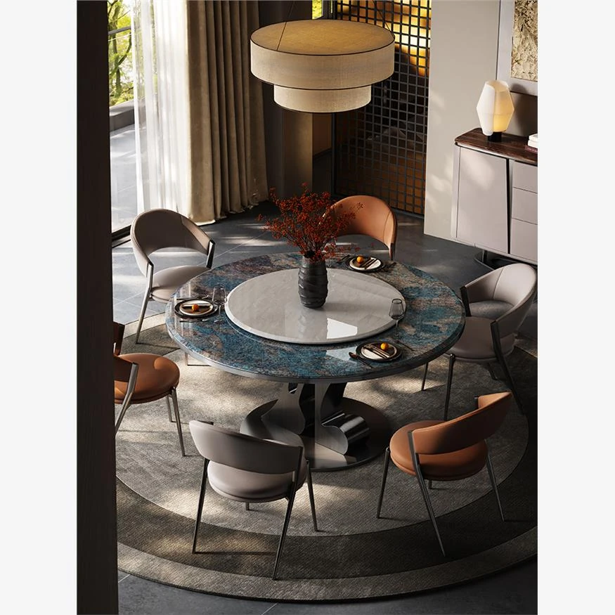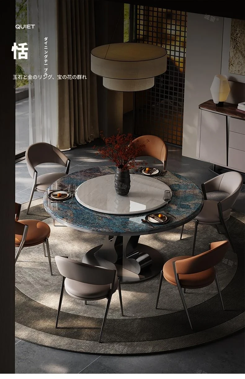 【アマゾンブルー/グレーのチタン金】1.5メートルのダイニングテーブル+カリ氷玉回転盤+ダイニングチェア*6