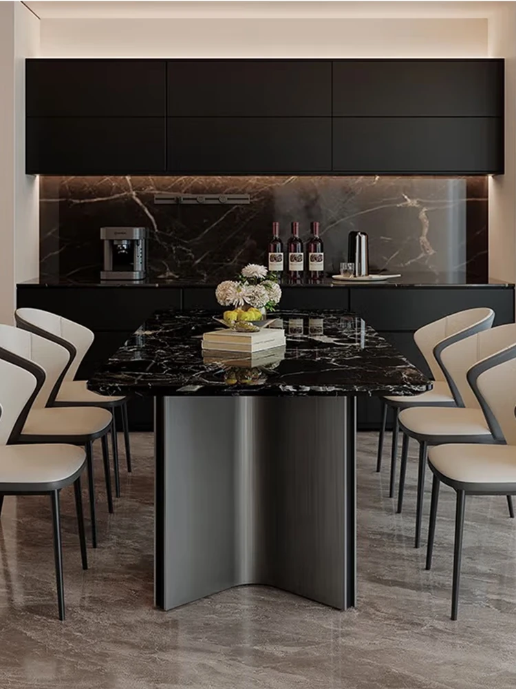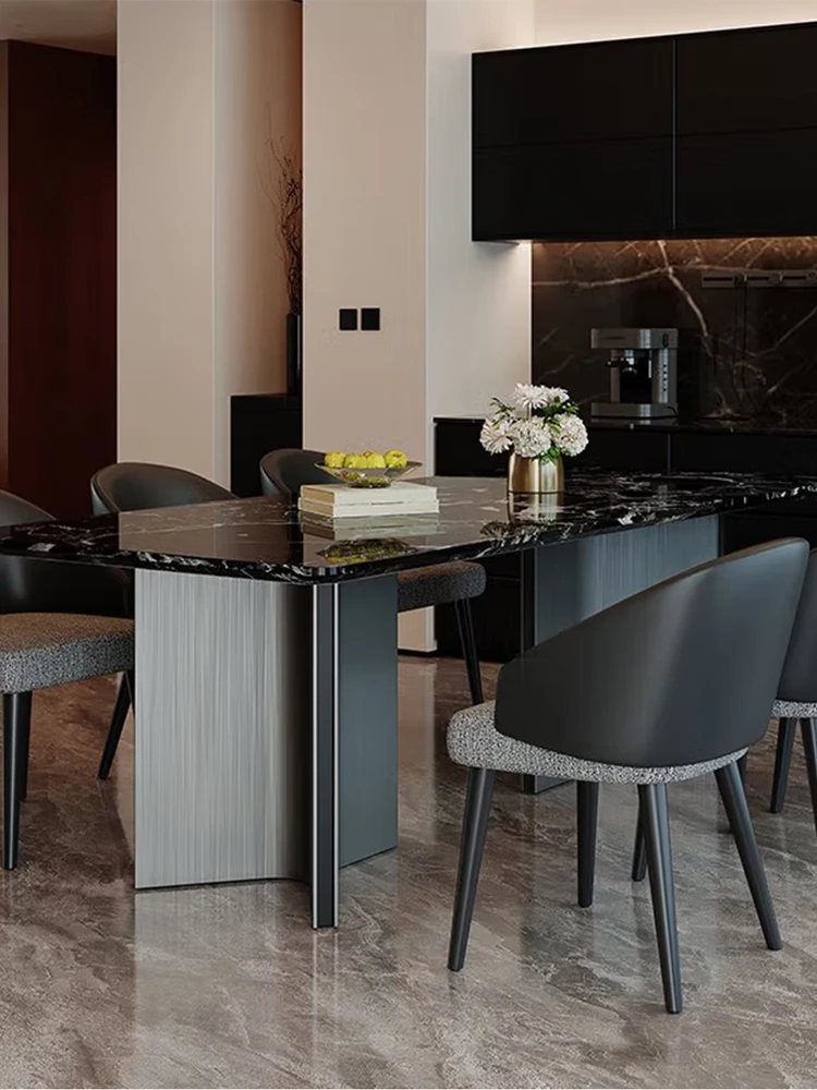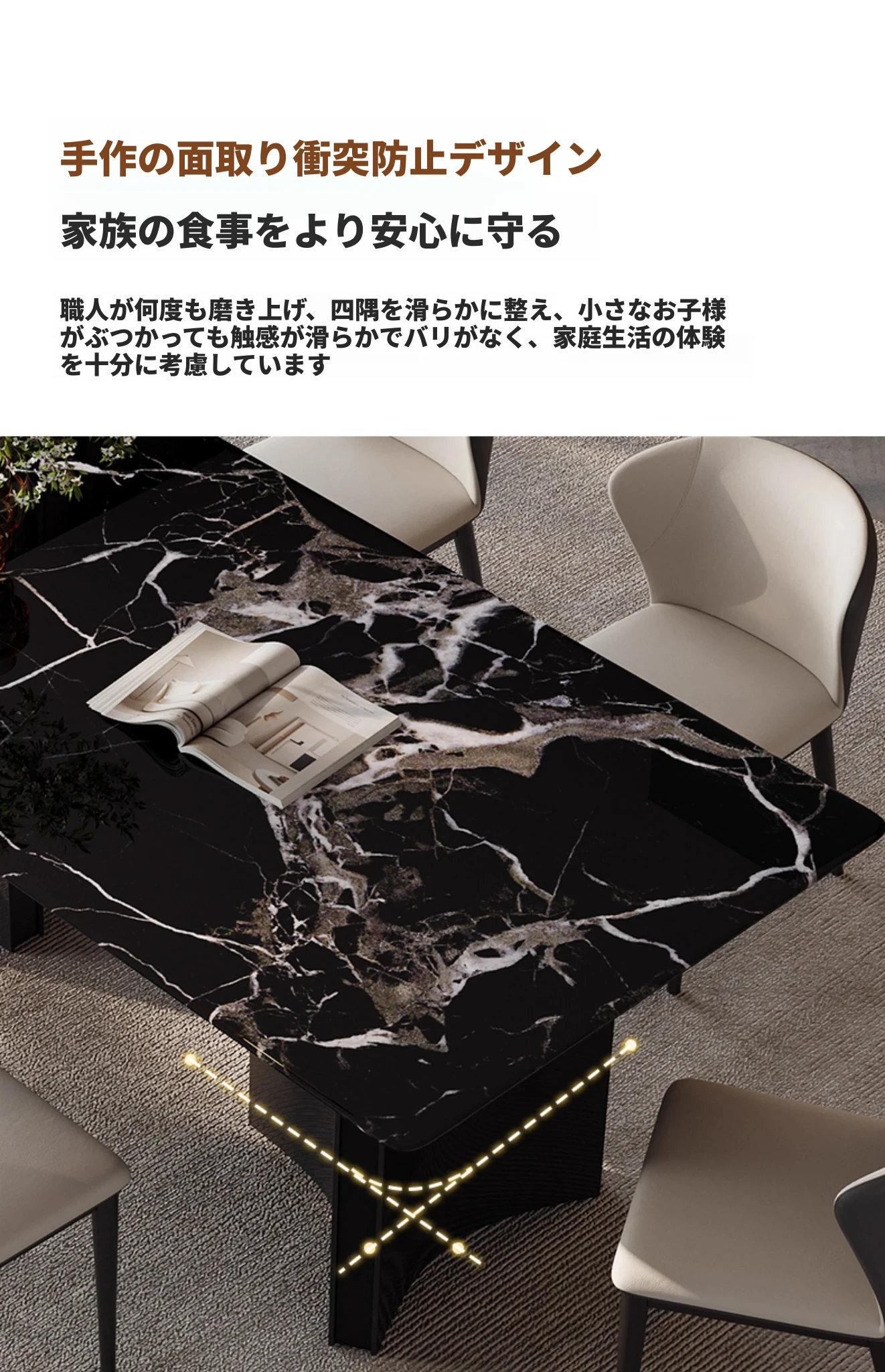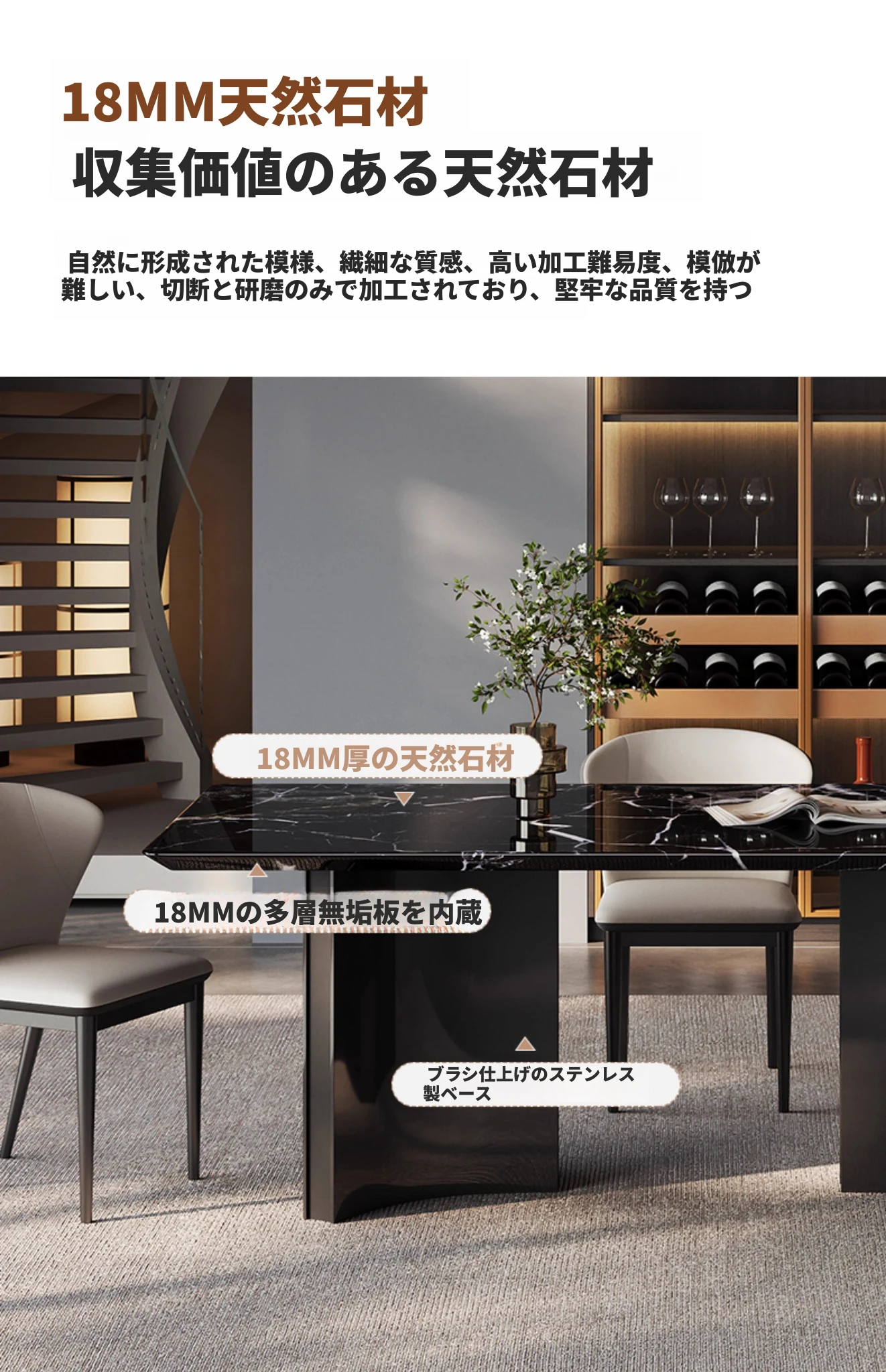 洗練された高級感の大理石ダイニングテーブル - モダンミニマリズムの長方形デザイン、ブラックローズの贅沢な石材で作られた小型住宅向けの理想的なテーブル。おしゃれな食卓で特別なひとときを!