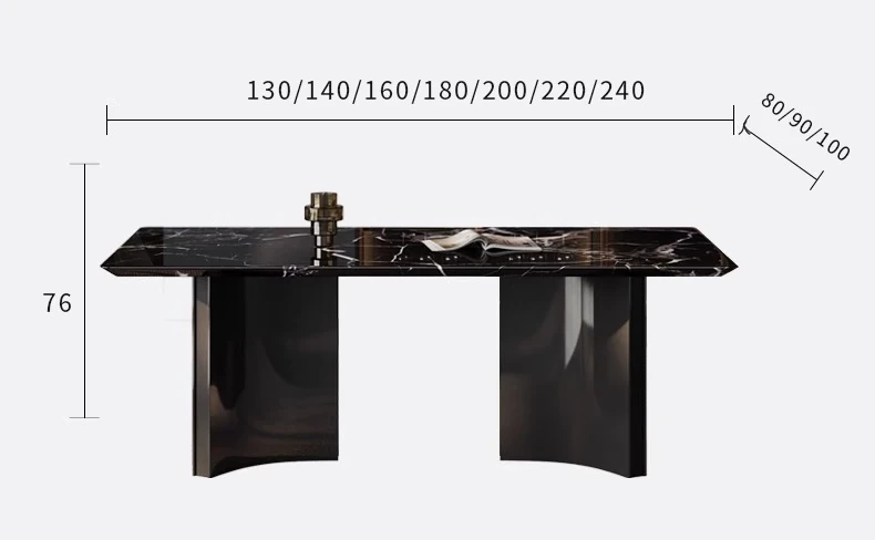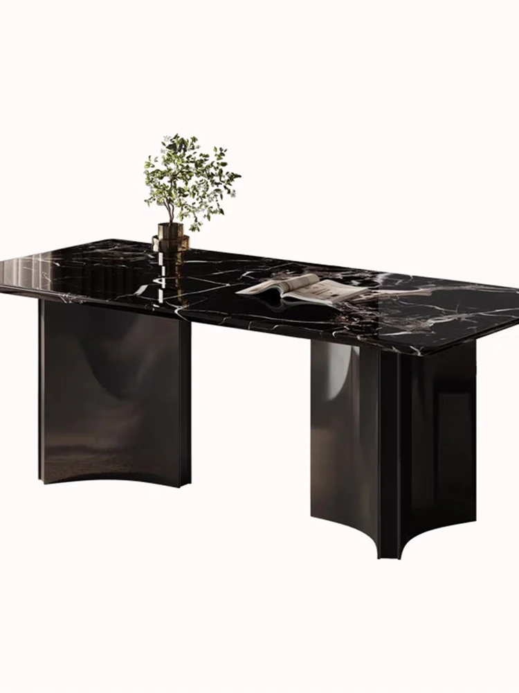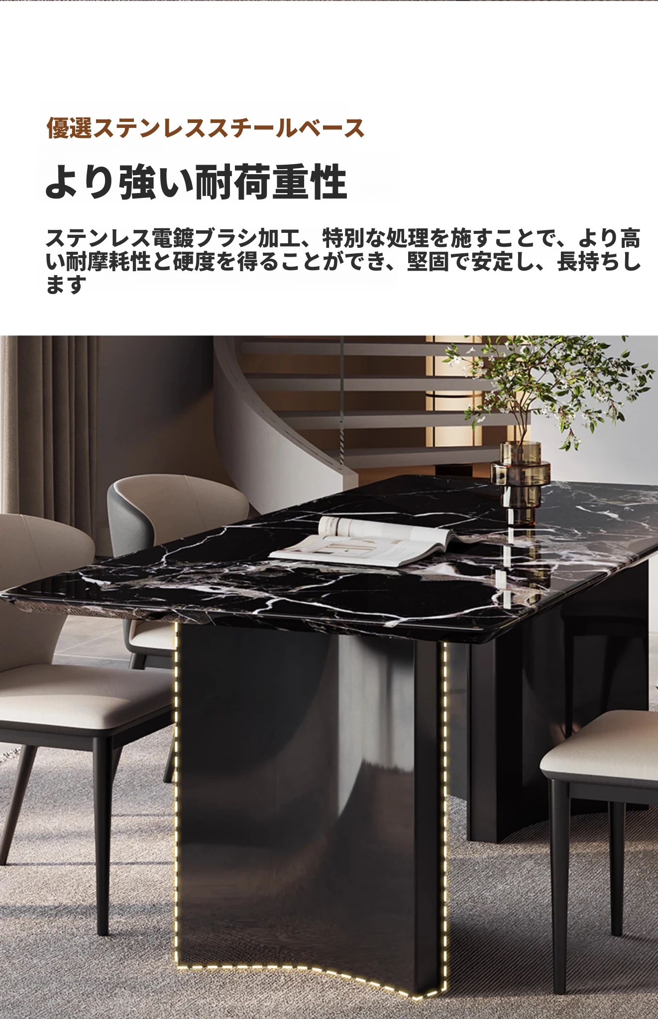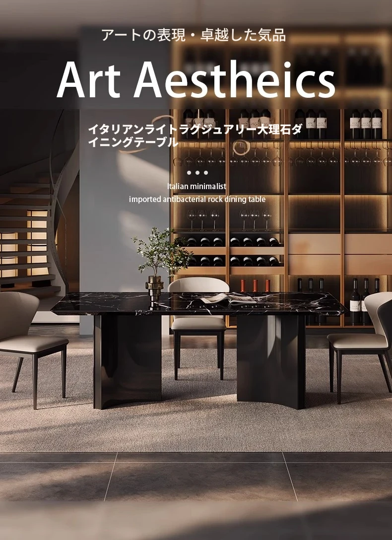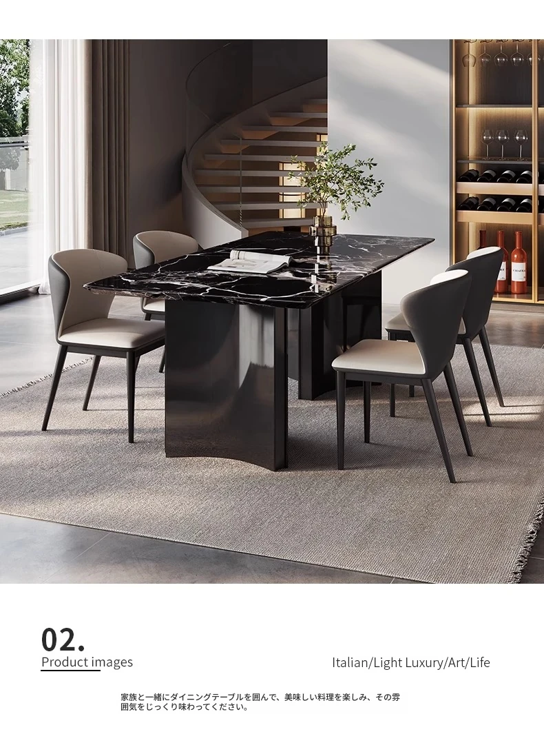 洗練された高級感の大理石ダイニングテーブル - モダンミニマリズムの長方形デザイン、ブラックローズの贅沢な石材で作られた小型住宅向けの理想的なテーブル。おしゃれな食卓で特別なひとときを!