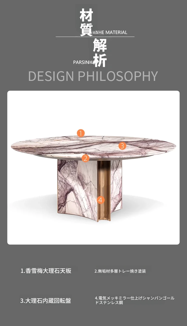 豪華な大理石ダイニングテーブル - ヴィラにぴったり!回転式デザインで、イタリアンモダンな極簡スタイルの天然石製ラウンドテーブルセット。洗練された雰囲気を演出し、特別な食事のひとときを提供します。