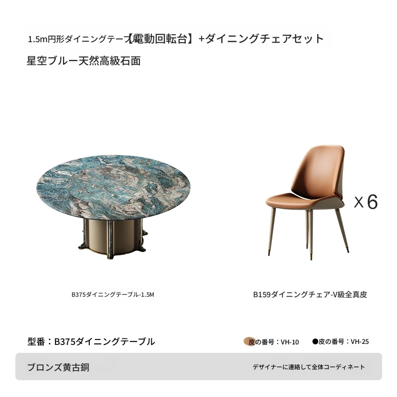 1.5m電動ダイニングテーブル[スターryブルーラグジュアリーストーン天板+ターンテーブル]+B159ダイニングチェア[V級本革]*6