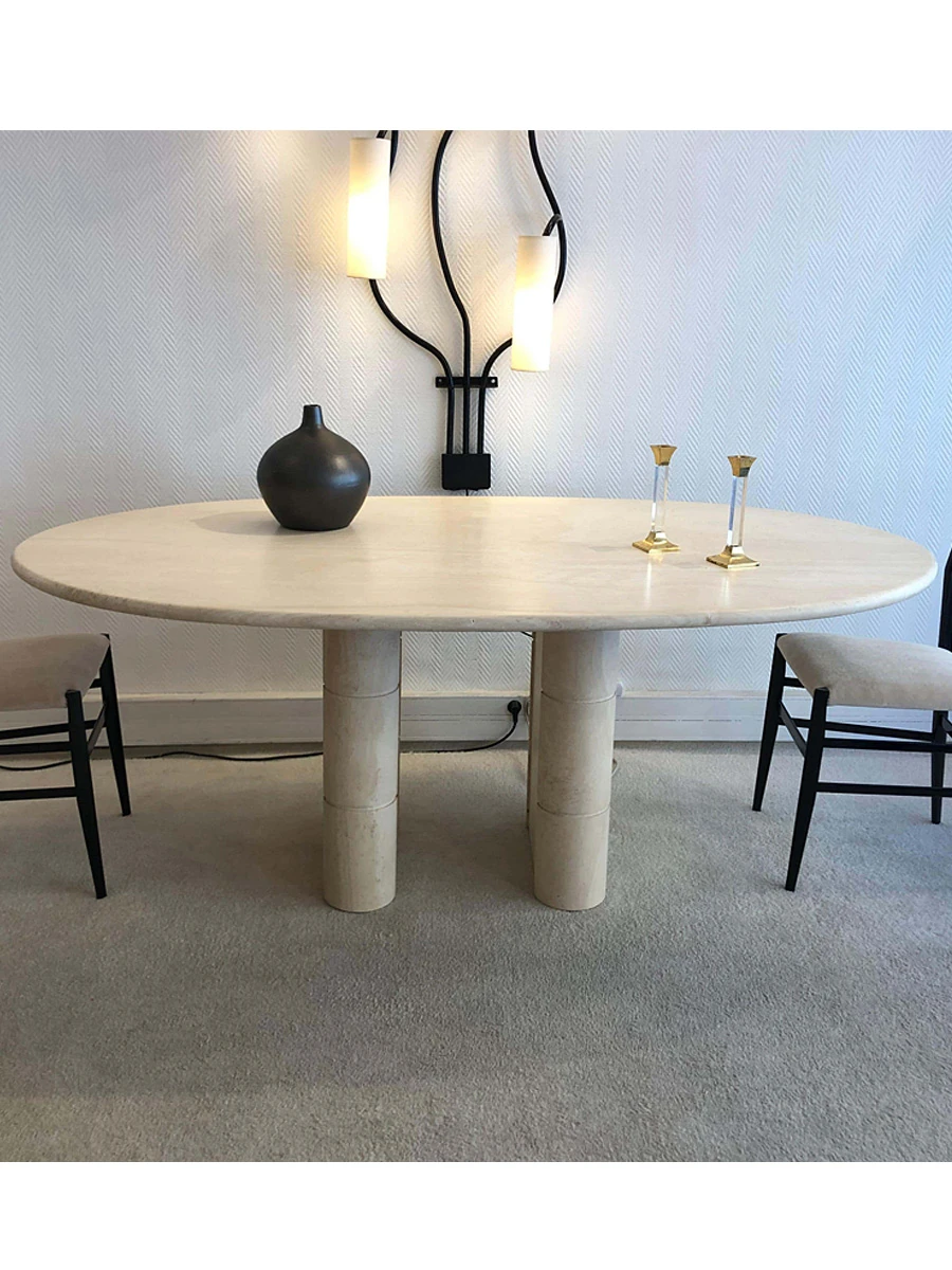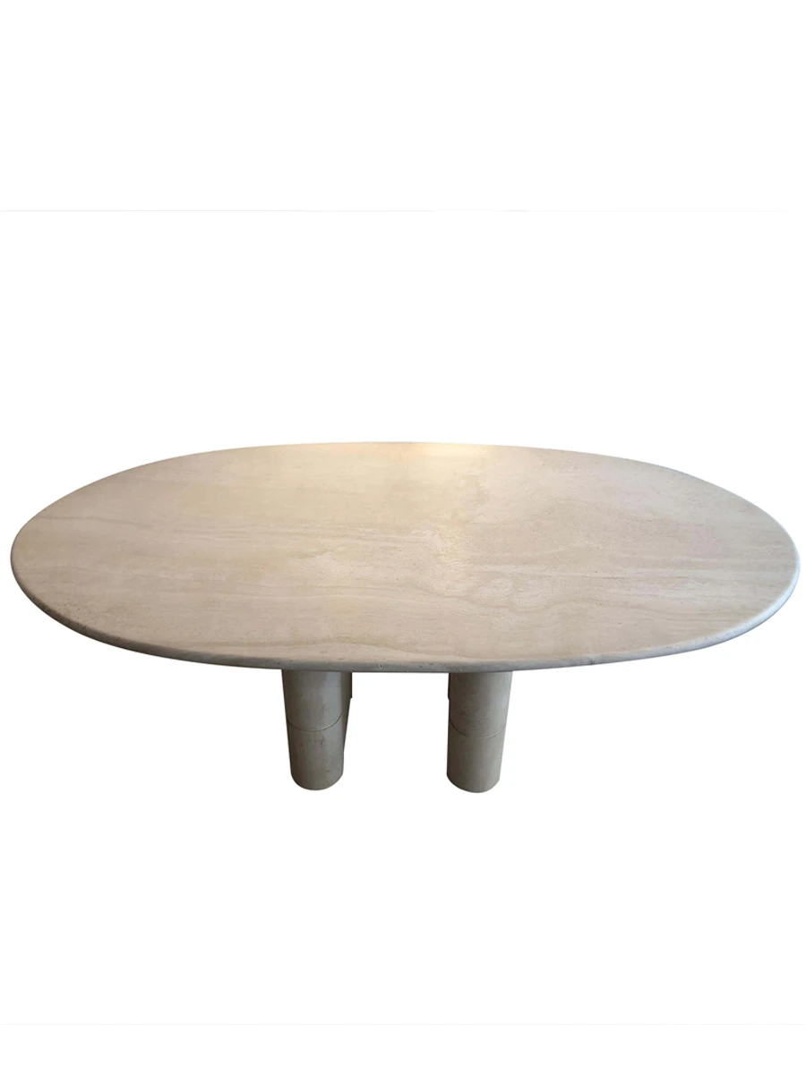 天然洞石の円形ダイニングテーブル|イタリアンミニマリズムの大理石製|現代的な別荘や広々とした住空間に最適|デザイナーによる洗練された一品です。