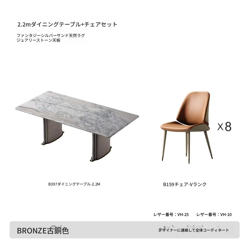 ダイニングテーブル2.2M(ファントムシルバーサンドラグジュアリー石面)+B159ダイニングチェア*8[R級]